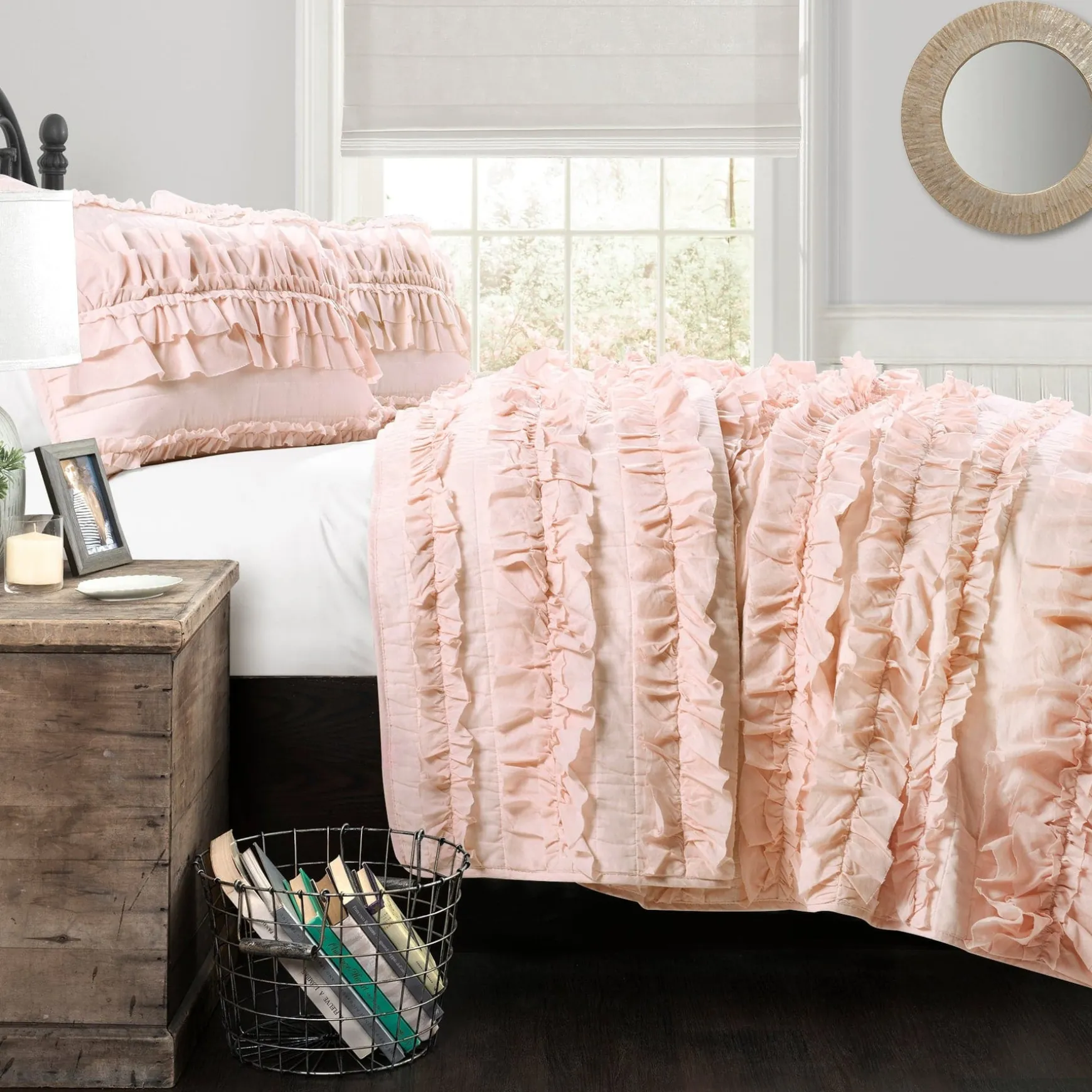 Due to the delicate nature of the ruffled embellishments, this Belle Quilt 3 Piece Set is not safe for machine washing and should be dry cleaned.