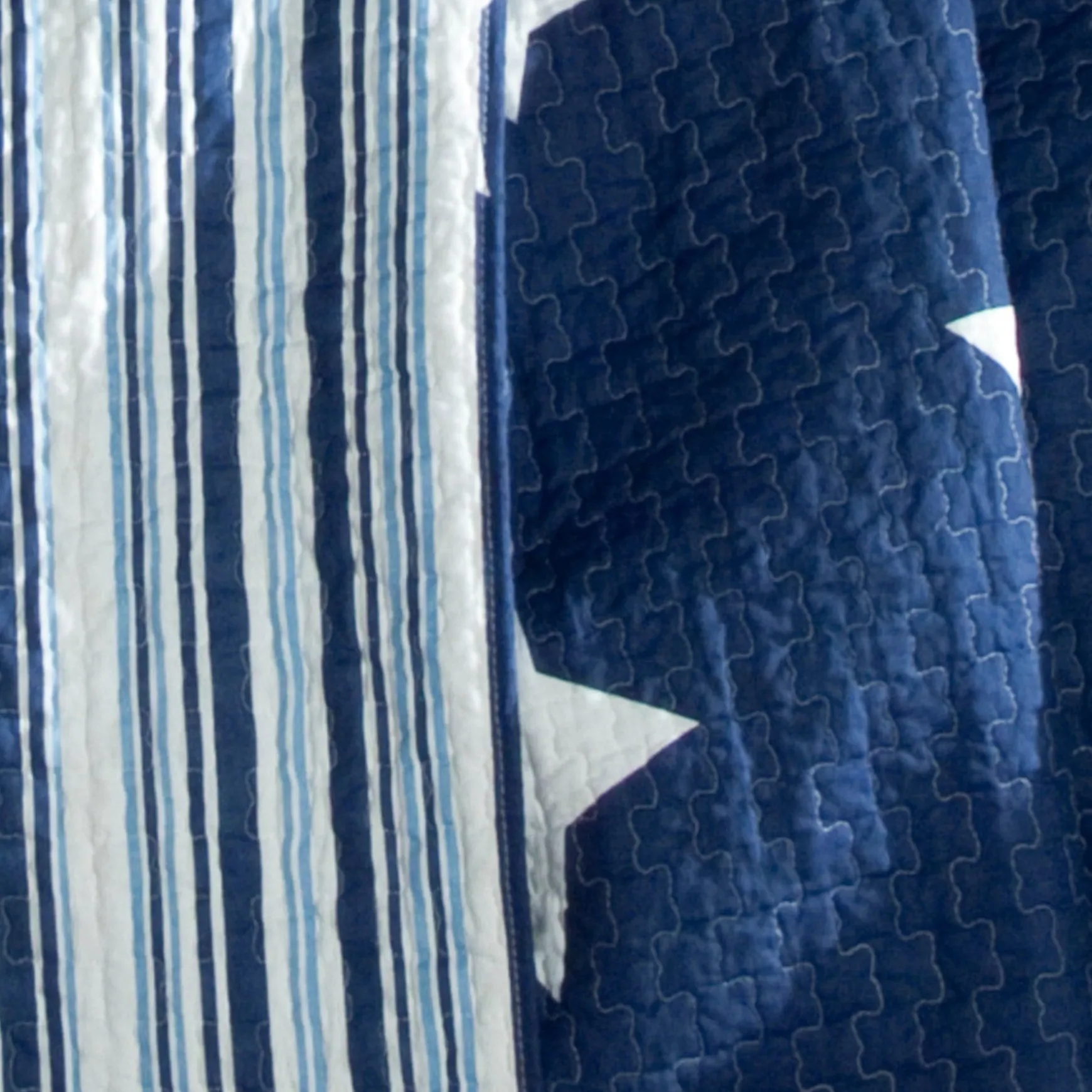 This Star 3 Piece Quilt Set includes a reversible cotton quilt and two matching reversible pillow shams. It is available in your choice of navy or gray and in Full/Queen size. We also offer this style in 2-piece set in Twin size.
