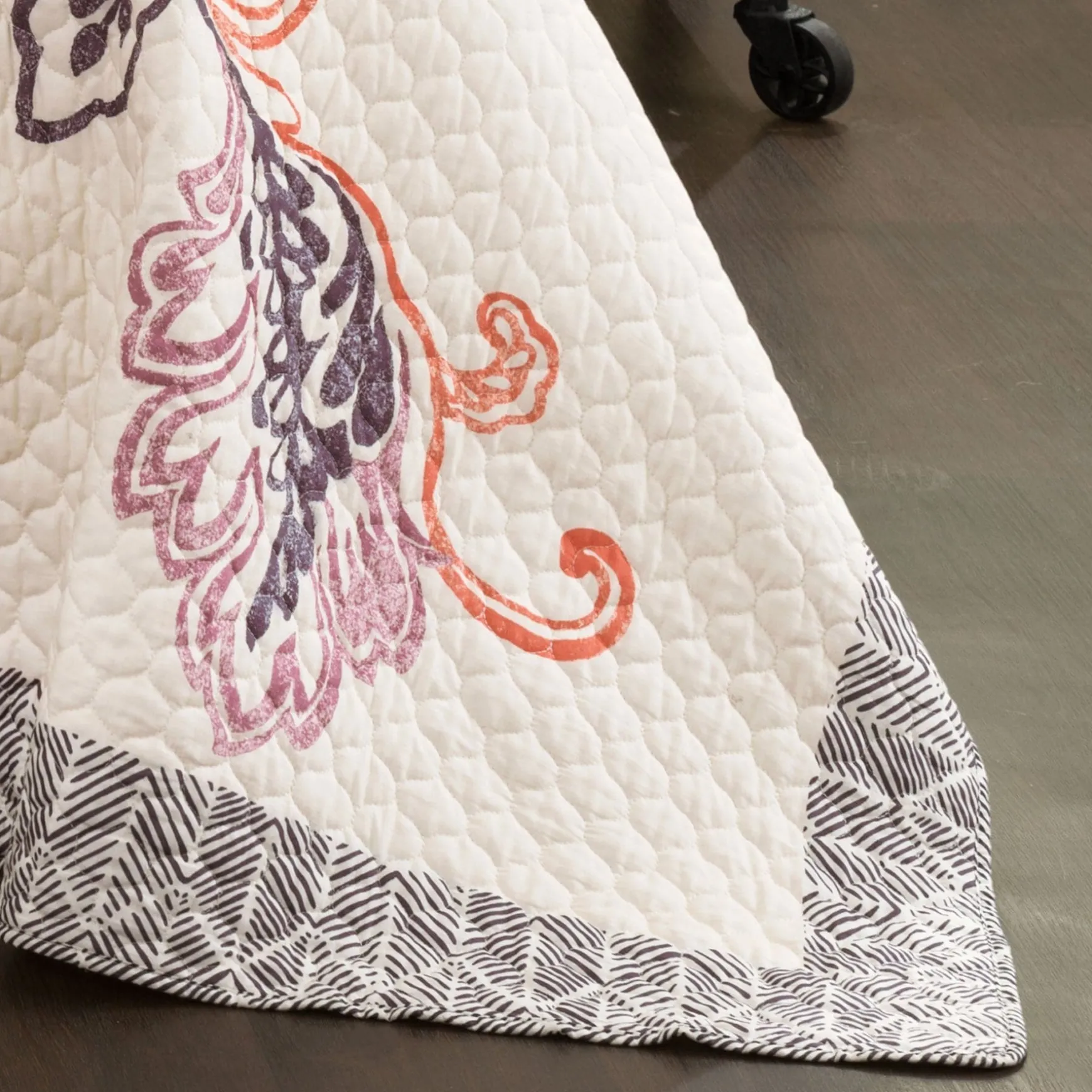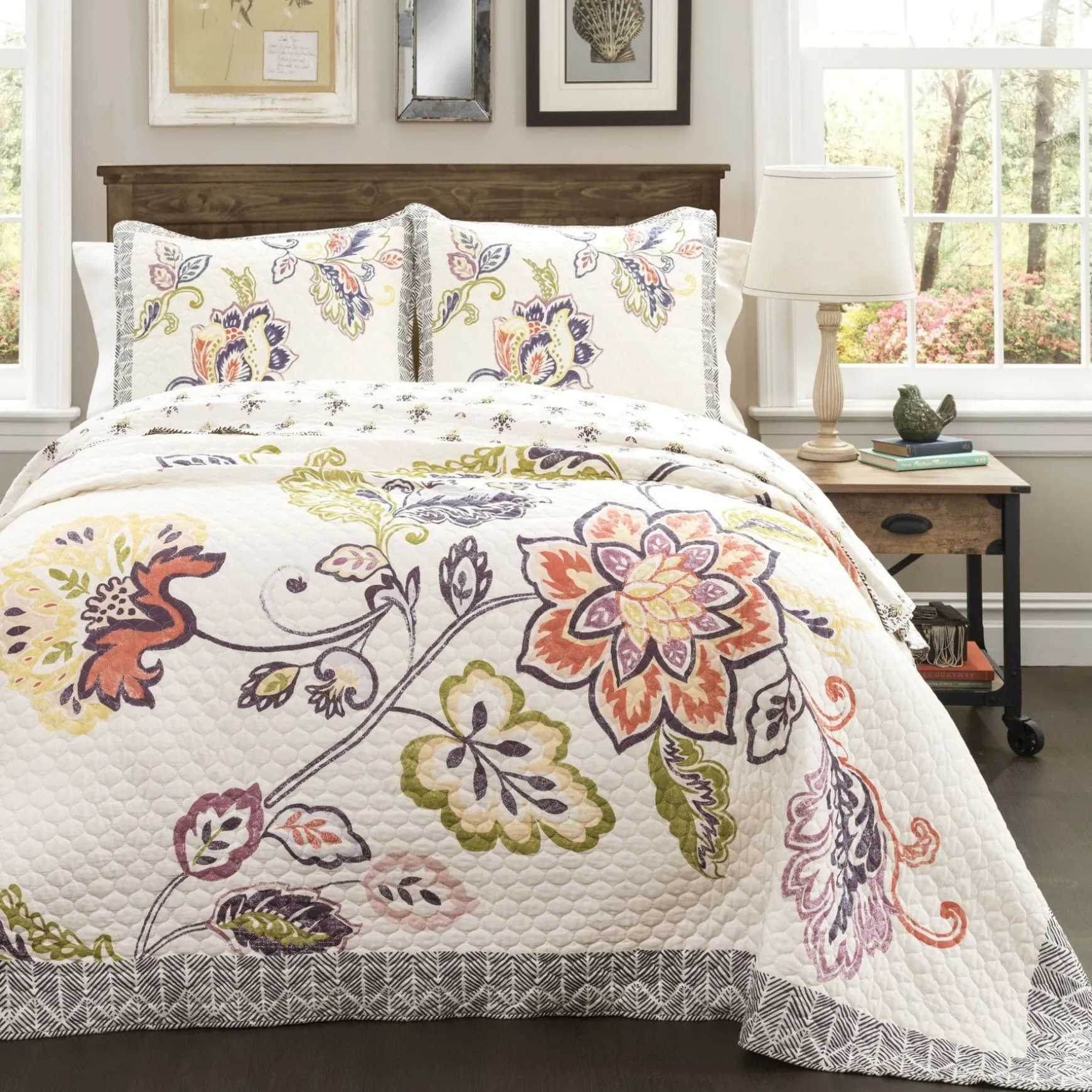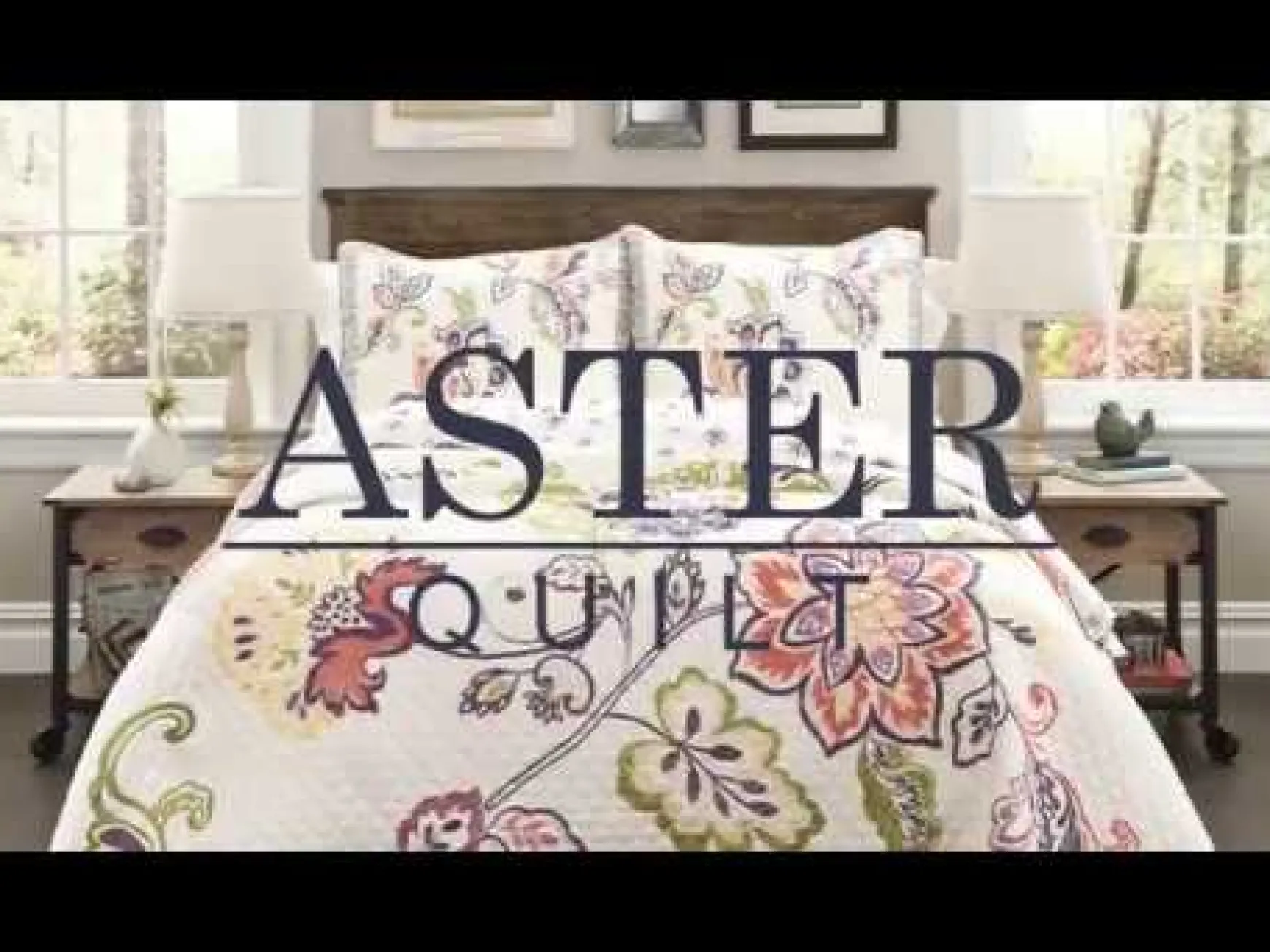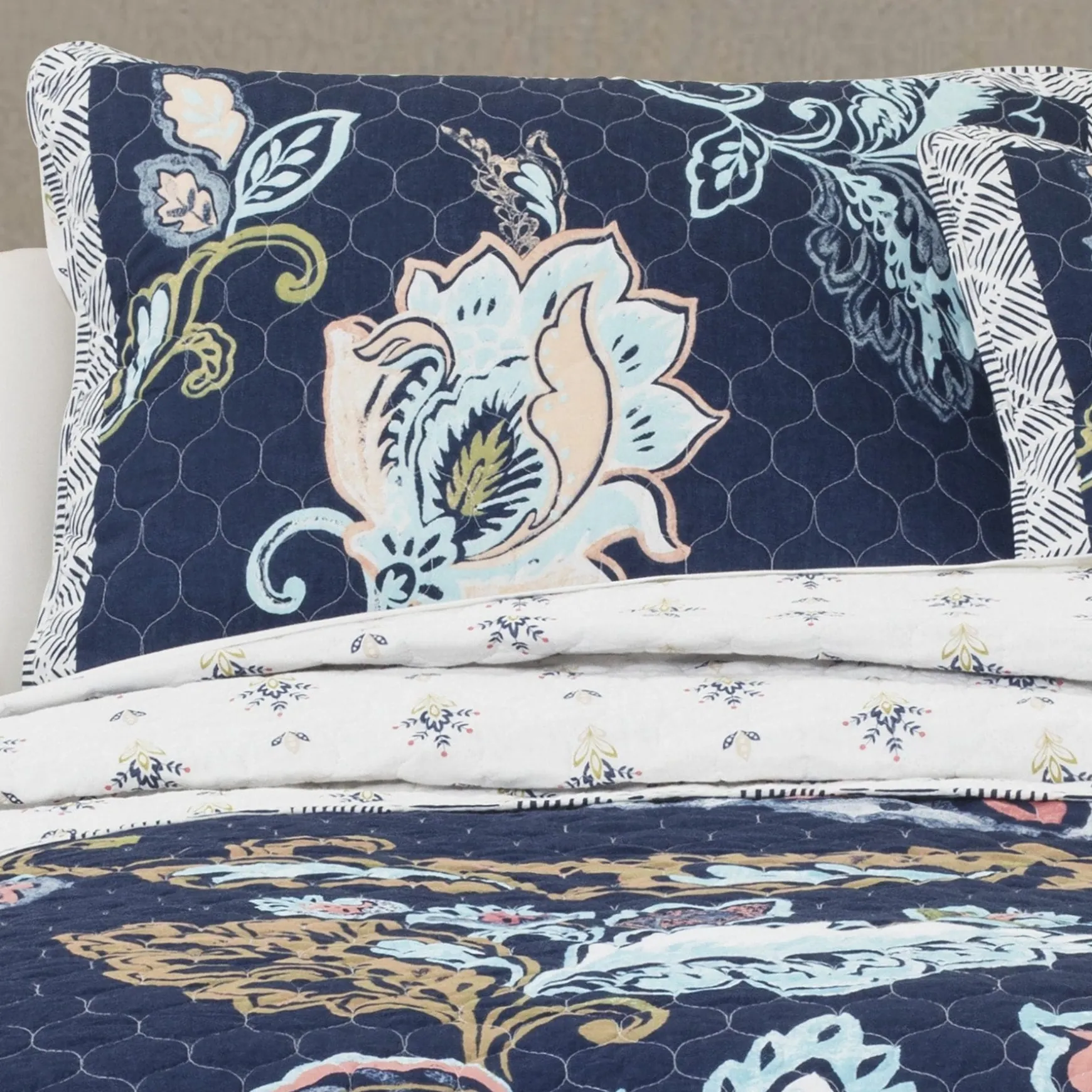 Our Aster Quilt 3 Piece Set features a delicate floral engineered pattern on 100% cotton. This soft cotton quilt set will add life to any bedroom with its bright pastel colors and large blooms with a full navy geometric border.