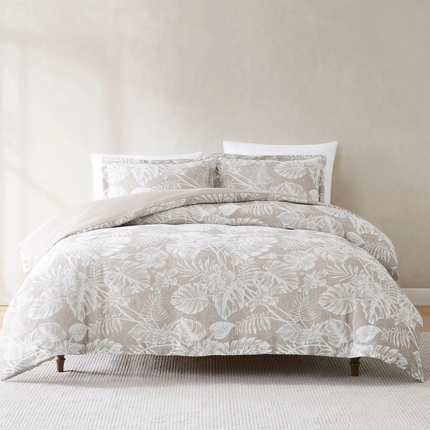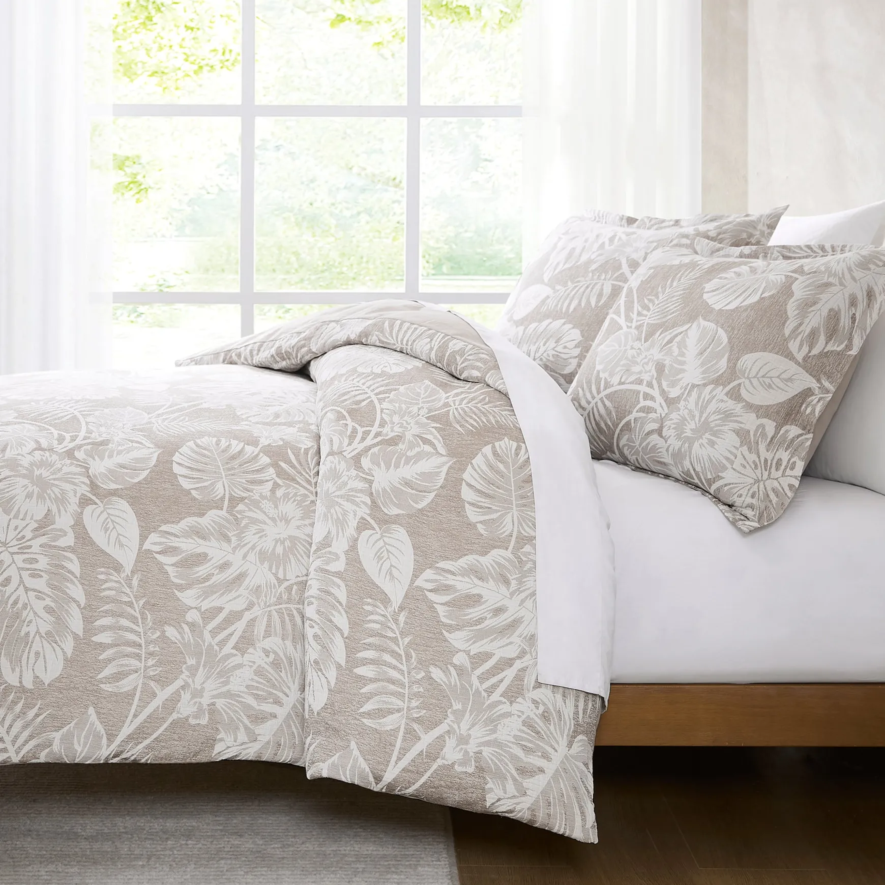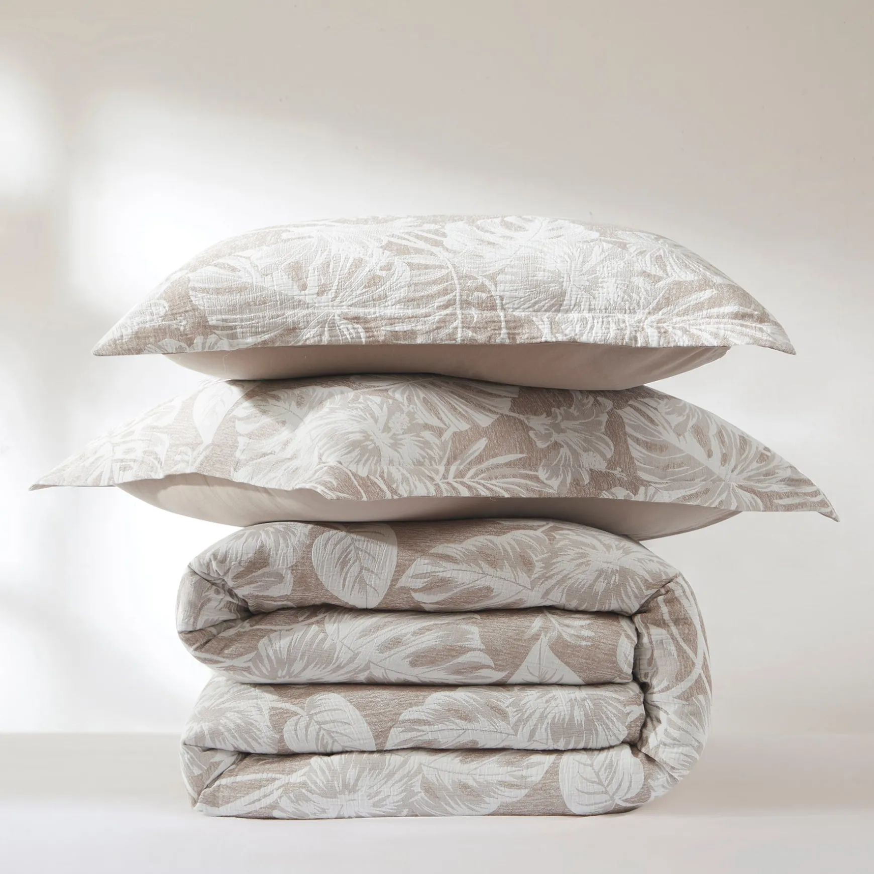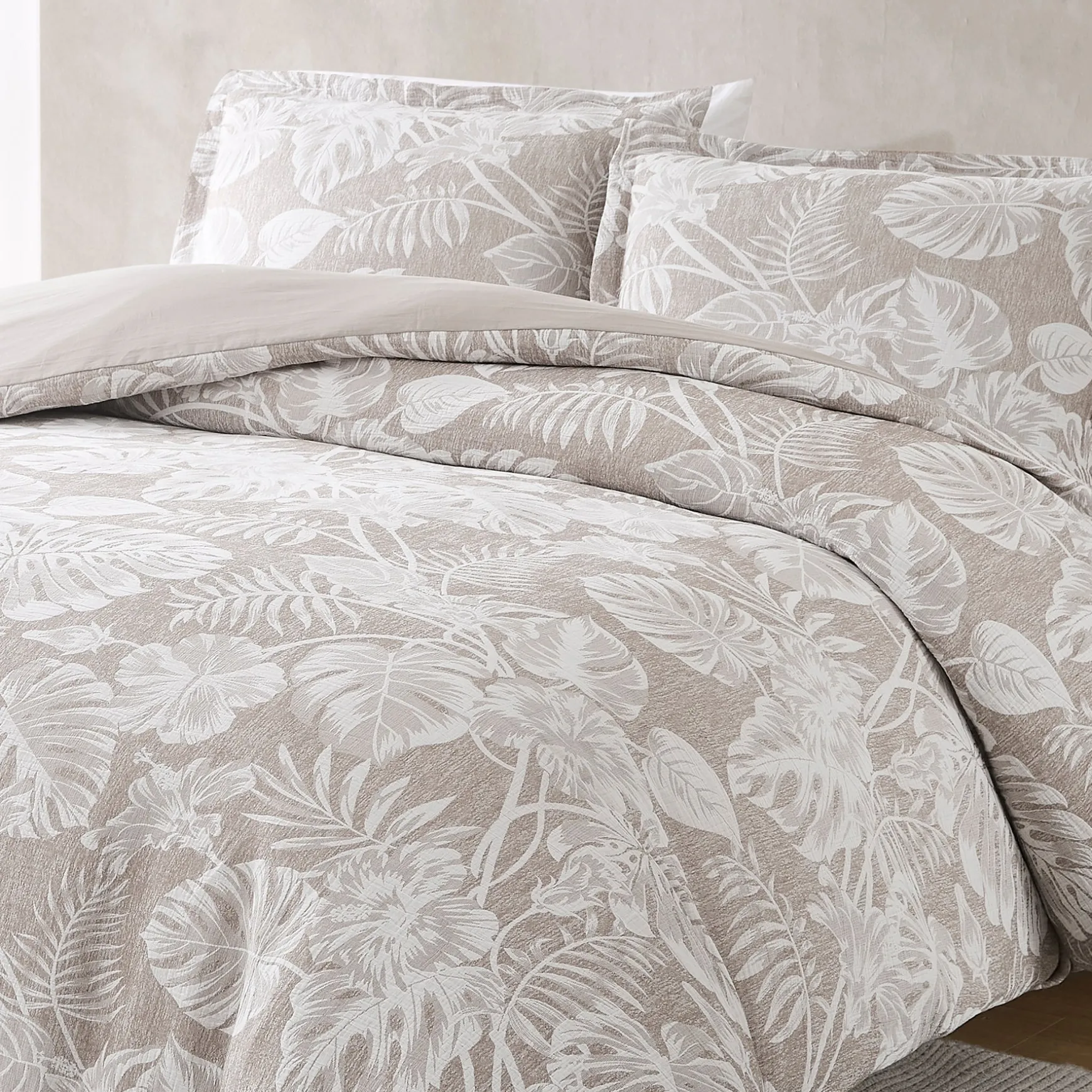 Add resort-style comfort with this lightweight cotton blend duvet cover set. The palm leaf print is perfect for a boho or coastal styled home. This 3 piece bedding set includes 1 duvet cover and 2 shams. Add your ideal insert weight for year-round comfort and easily secure it with button closures and corner ties. STANDARD 100 by OEKO-TEX® certified, all components have been tested and certified free from harmful substances. Machine washable for easy care. Do not bleach.