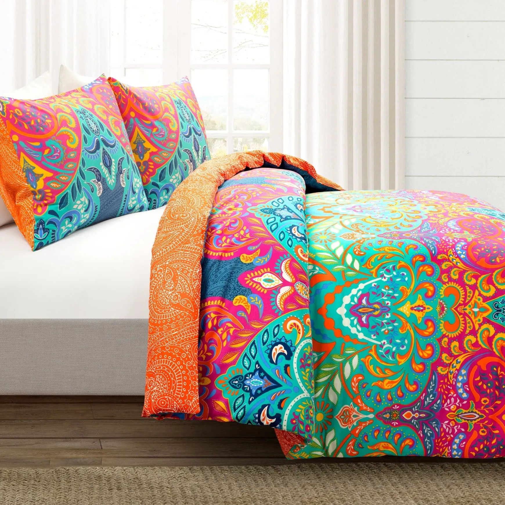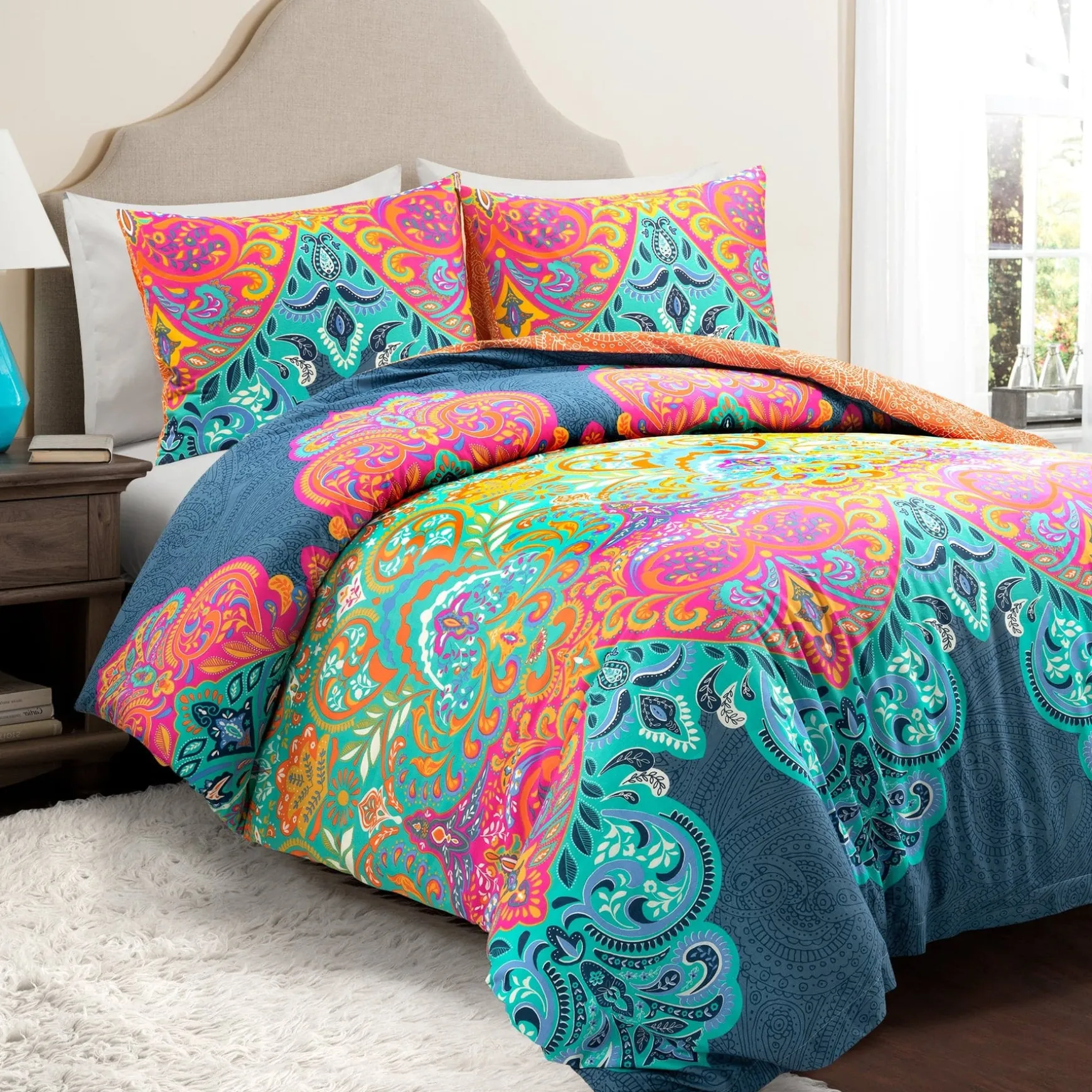 The alluring artistry of this reversible Boho Chic Cotton Duvet Cover 3 Piece Set will become the center focus of your boho hideaway. Take advantage of the jewel tone colors to inspire the rest of your maximalist bedroom design. Express your creative side when you style your bedding using the reverse paisley pattern.