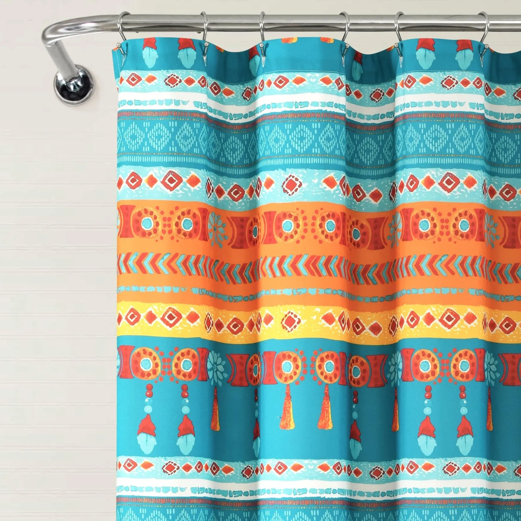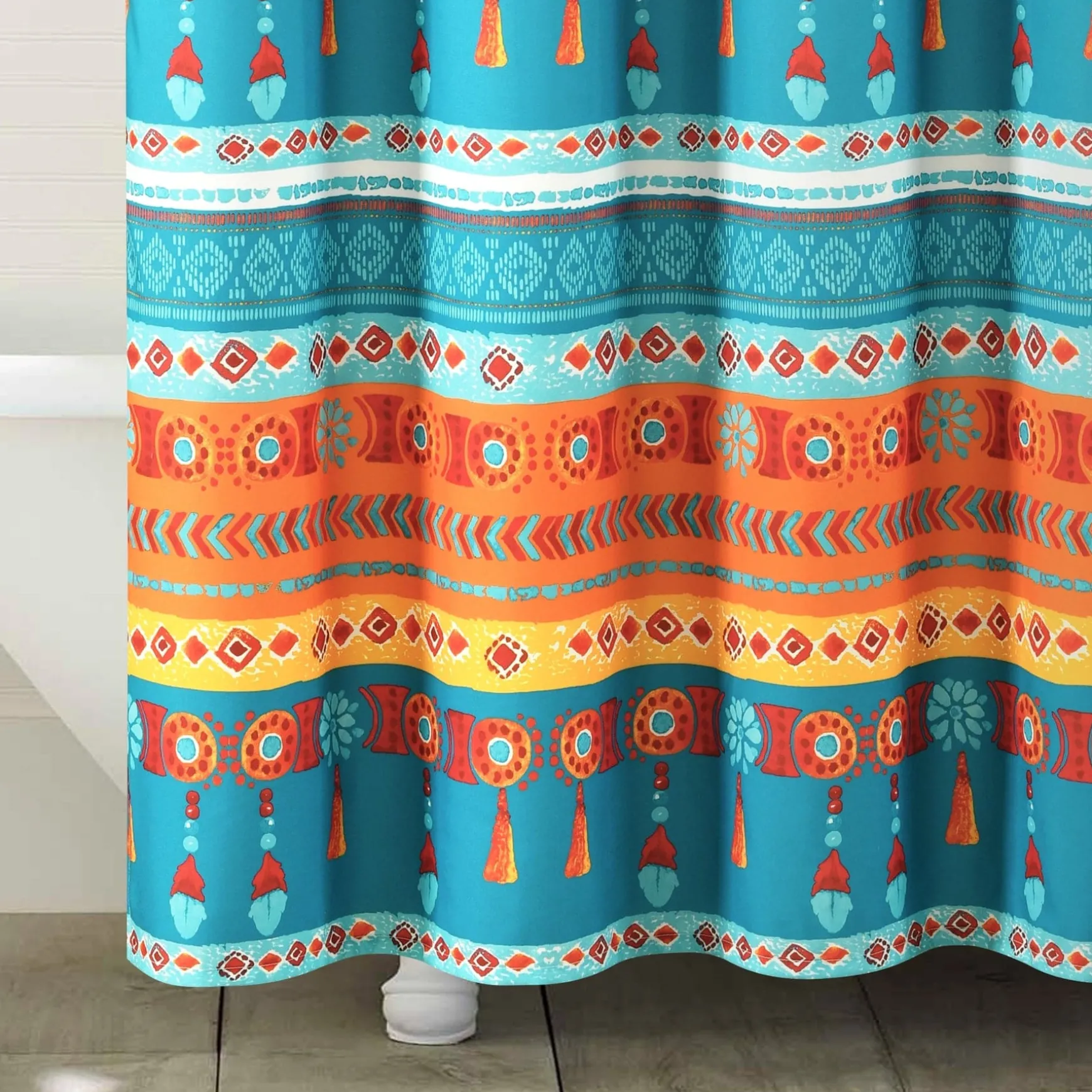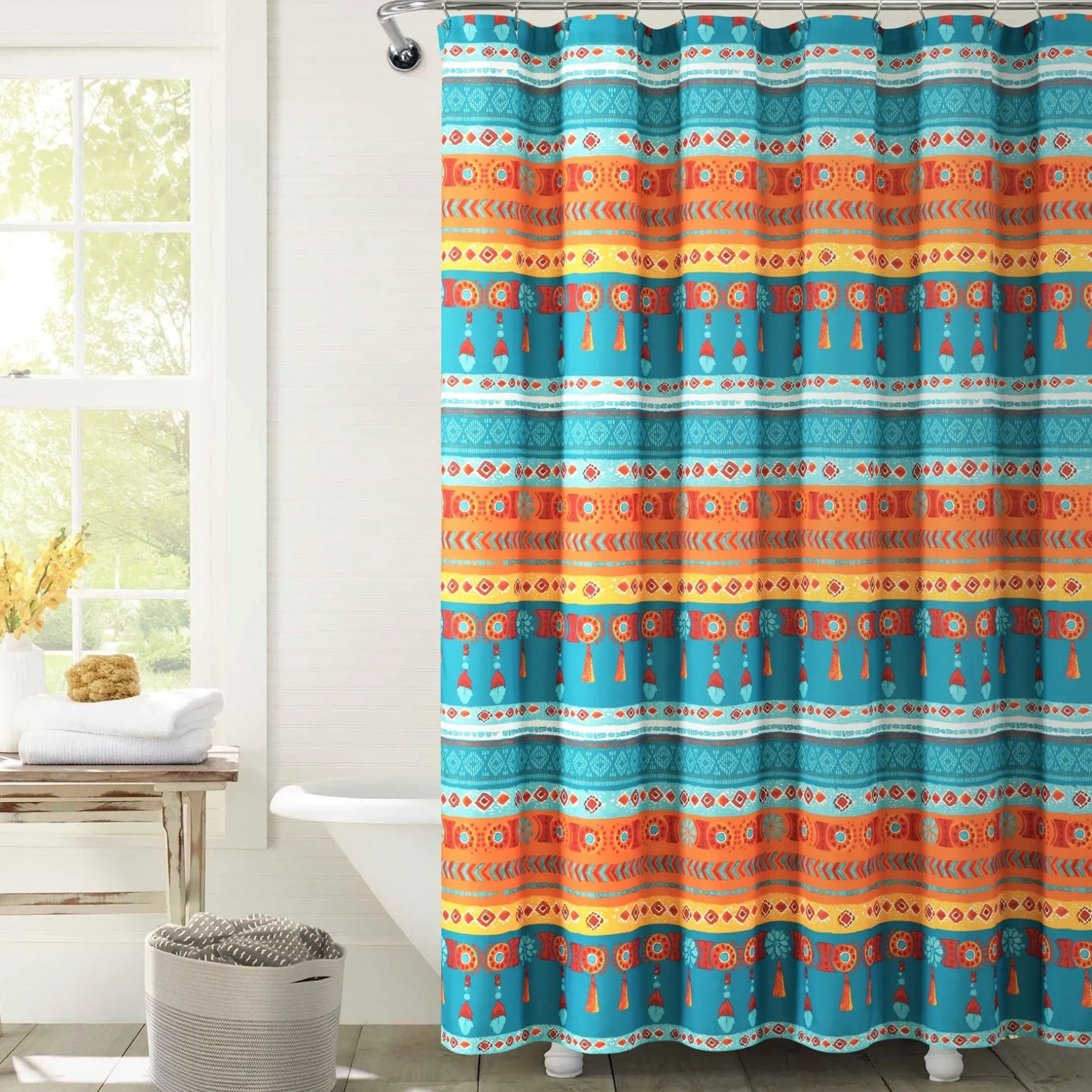 Measuring 72 inches on each side, our Boho Watercolor Border Shower Curtain will fit nearly any bathtub. Its bold colors and unique patterns will instantly enhance the look of your space.