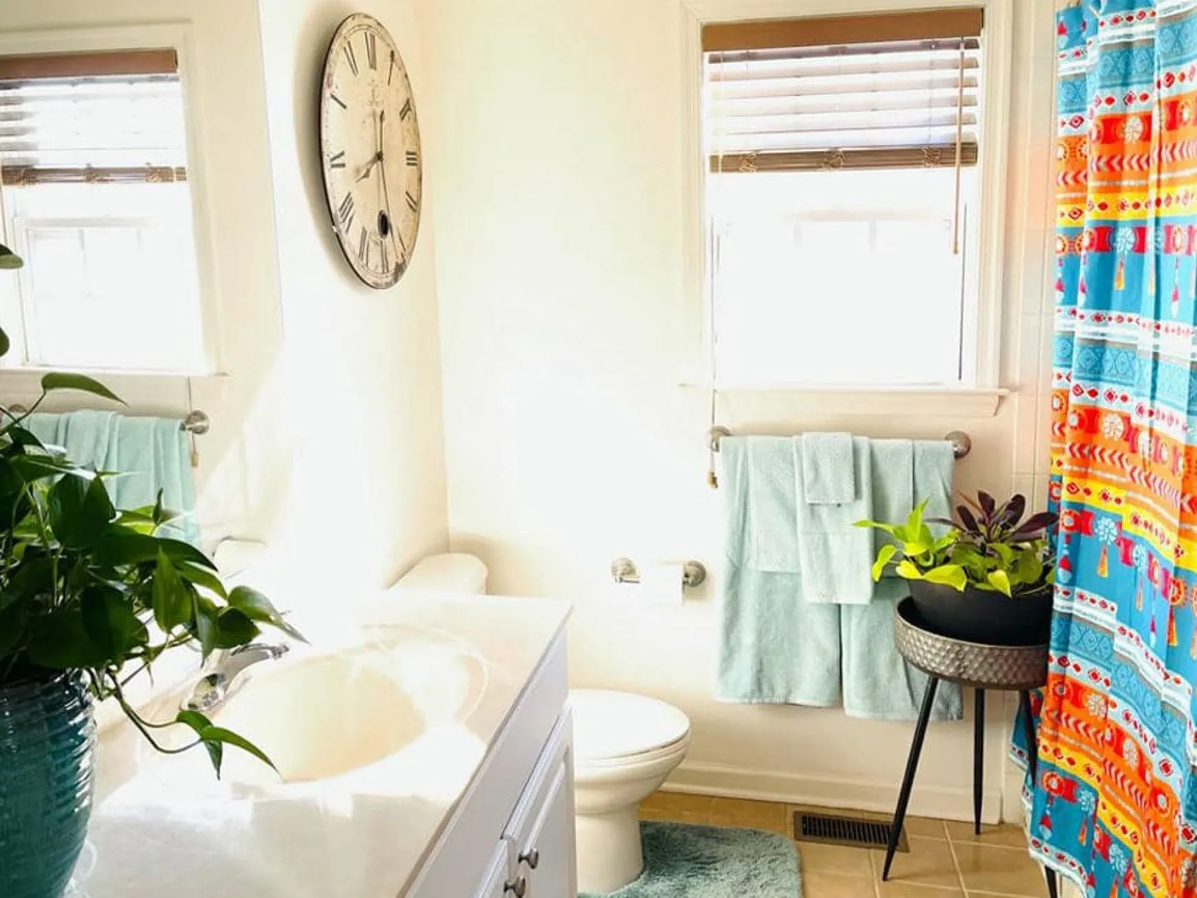 This fun and eclectic Boho Watercolor Border Shower Curtain is ideal for a guest bathroom, a teen’s or young adult’s bathroom, a first apartment or a college dorm. Use it also in boho, maximalist or southwest design styles. The many colors make it easy to match with decorative accents and towels.