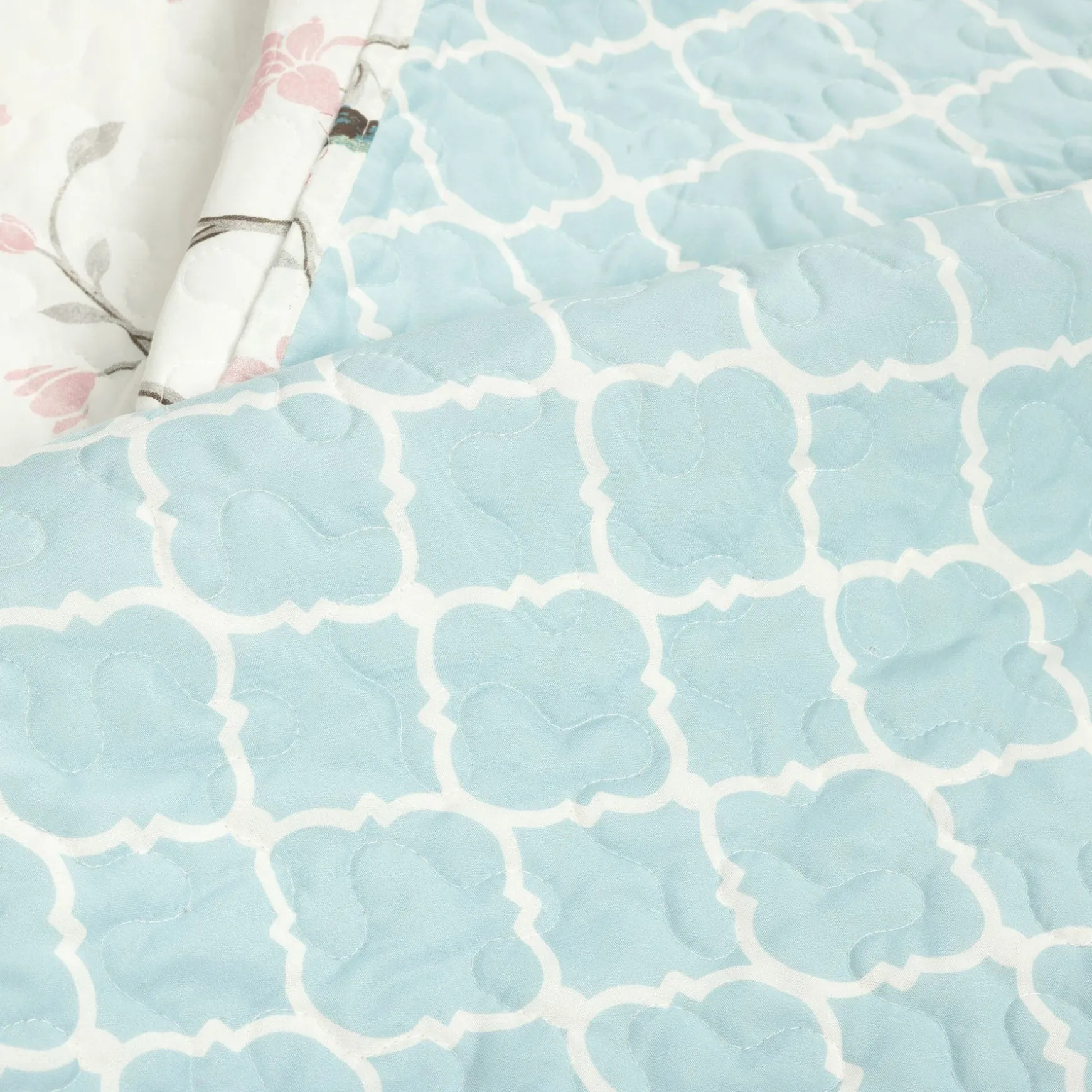 Oversized for added coverage and comfort, this Botanical Bird & Flower Quilt 3 Piece Set is the perfect accessory for a well styled look. This front features a natural print in soothing colors, and the reverse features a modern geometric trellis print. This gives you the option to switch up the look of your room as often as you like just by turning the quilt over to the other side.