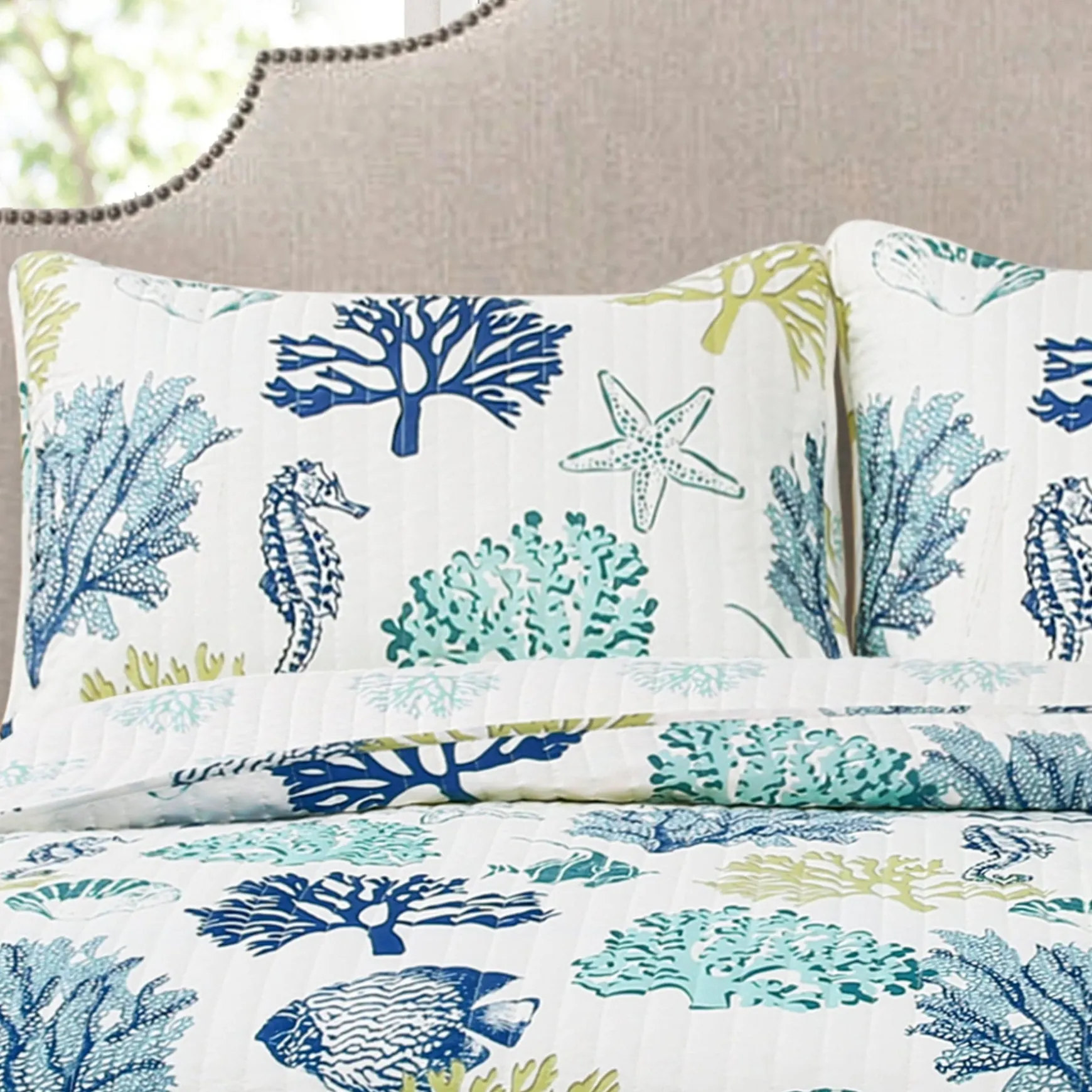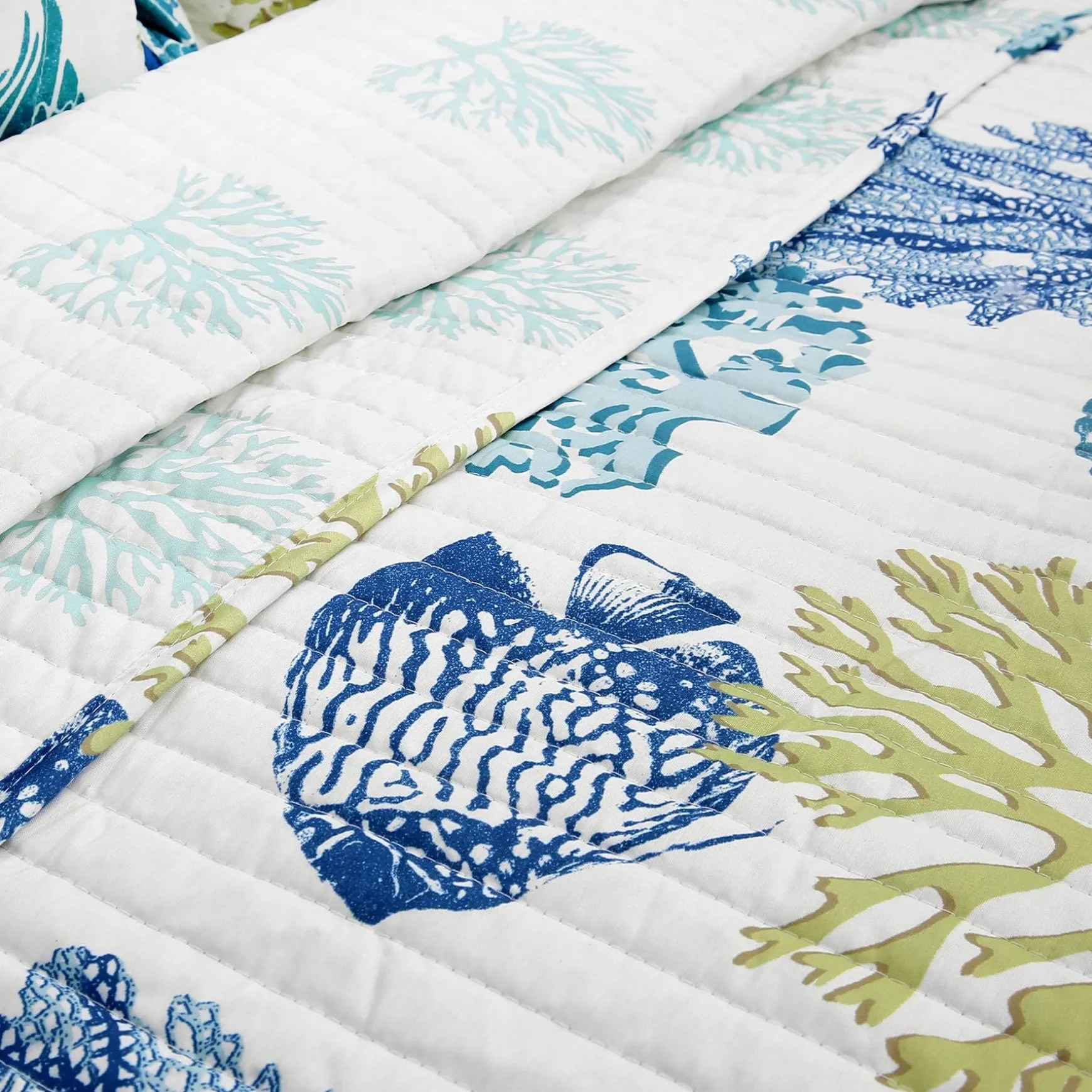 The reverse side of the Coastal Reef Quilt 3 Piece Set is light colored reefs on a white background. The reversible nature of this quilt gives you the option to switch up the look of your room as often as you like simply by turning the quilt over.