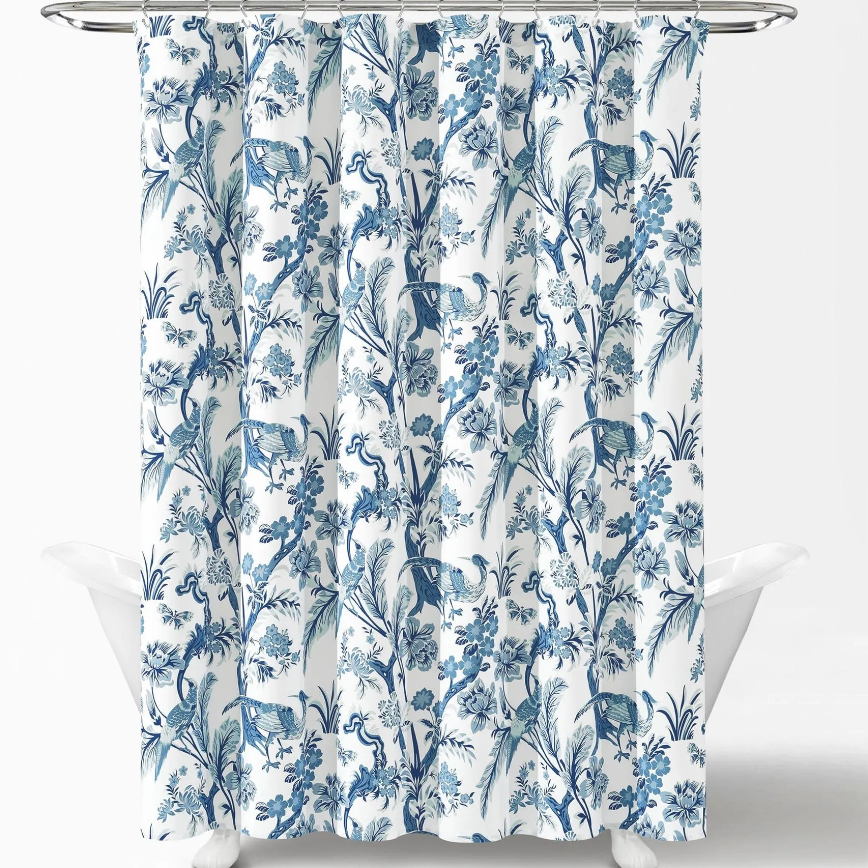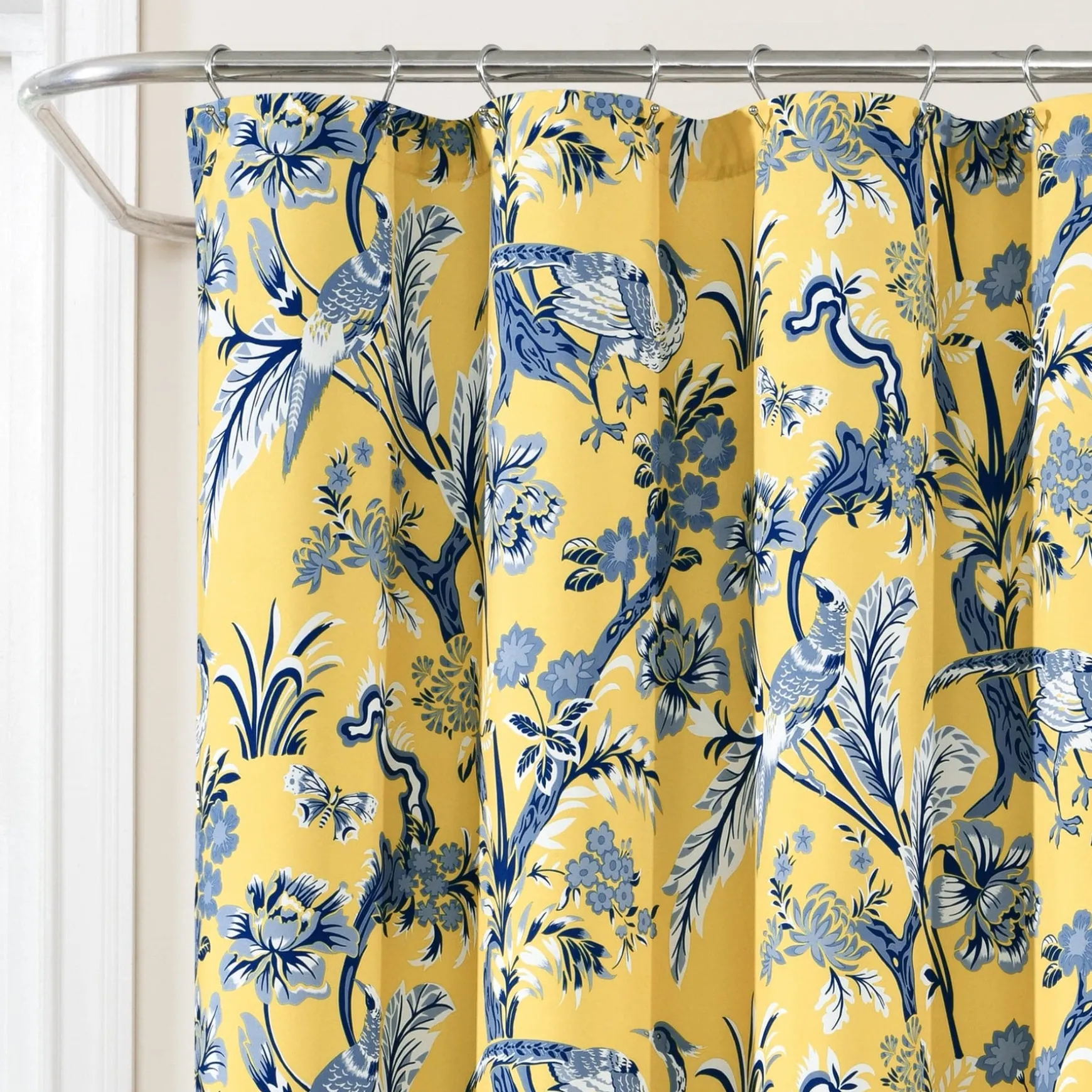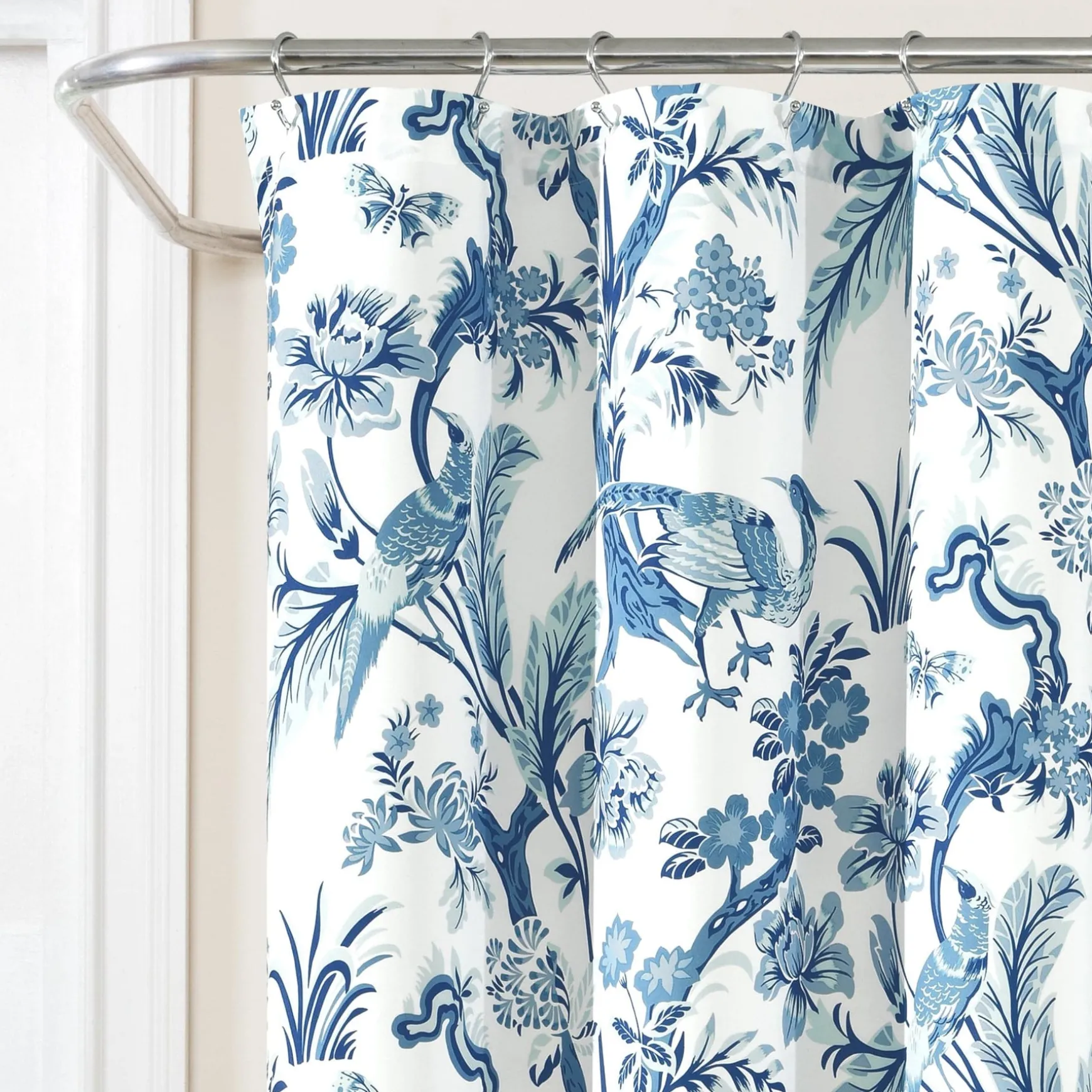 This dazzling Dolores Shower Curtain features a printed pattern of peacocks, unique leaves, and flowers for a bold and stunning look. The distinctive pattern of this shower curtain will be the centerpiece of your master bathroom or guest bathroom renovation.