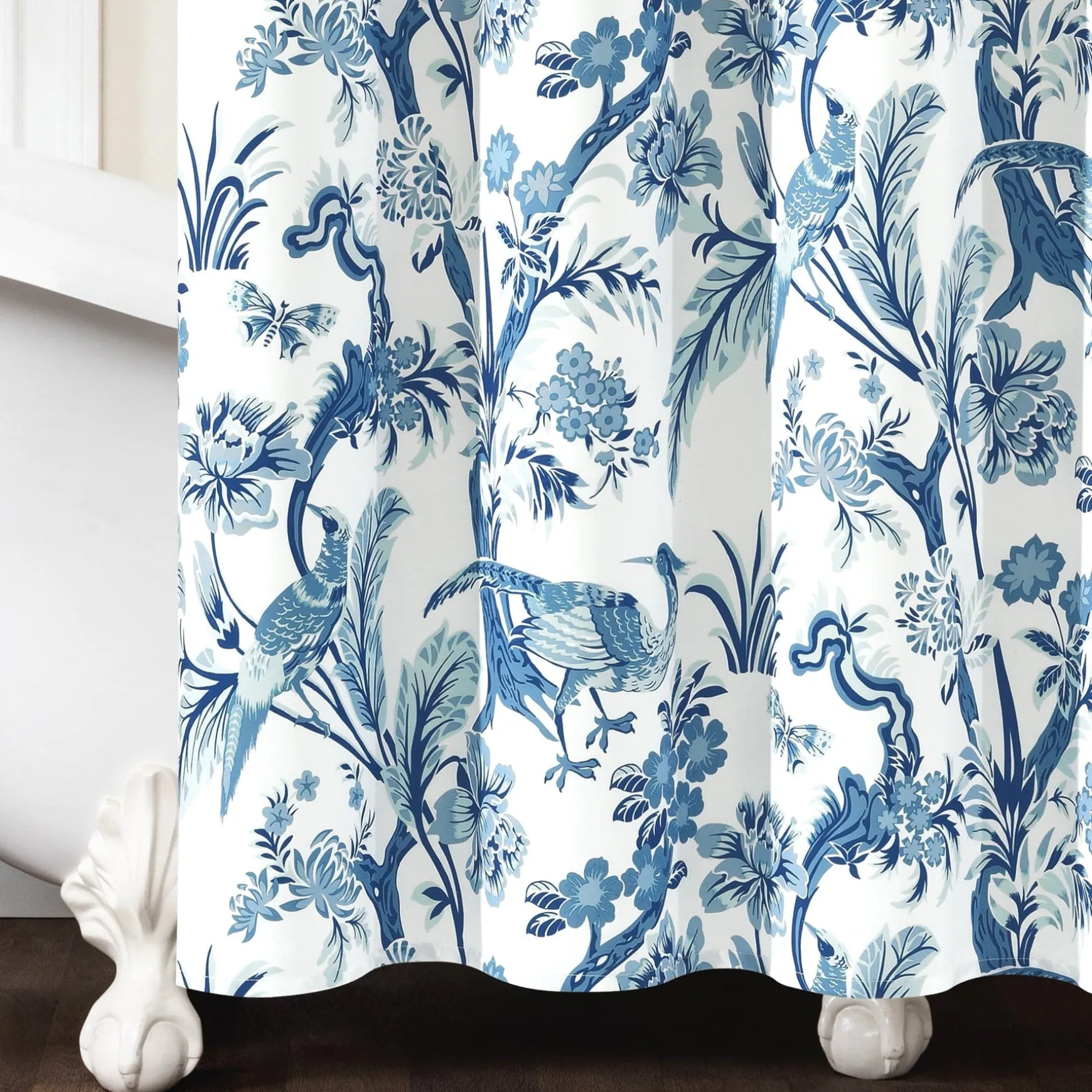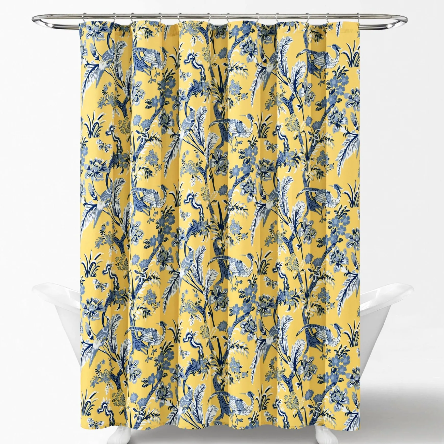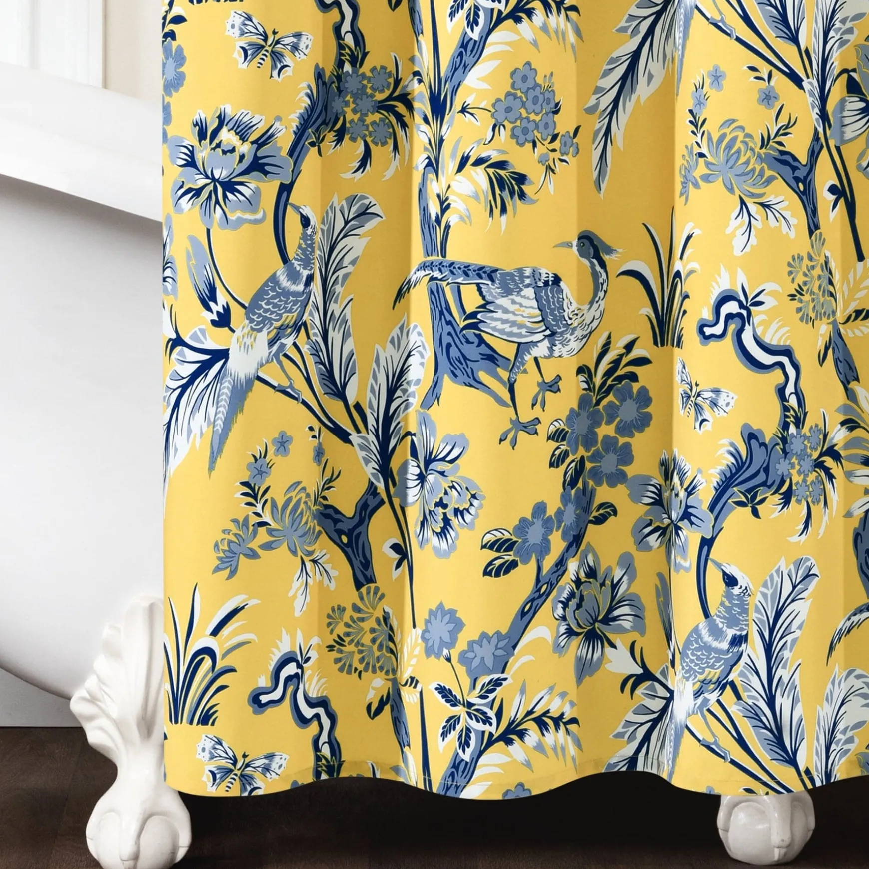 This dazzling Dolores Shower Curtain features a printed pattern of peacocks, unique leaves, and flowers for a bold and stunning look. The distinctive pattern of this shower curtain will be the centerpiece of your master bathroom or guest bathroom renovation.