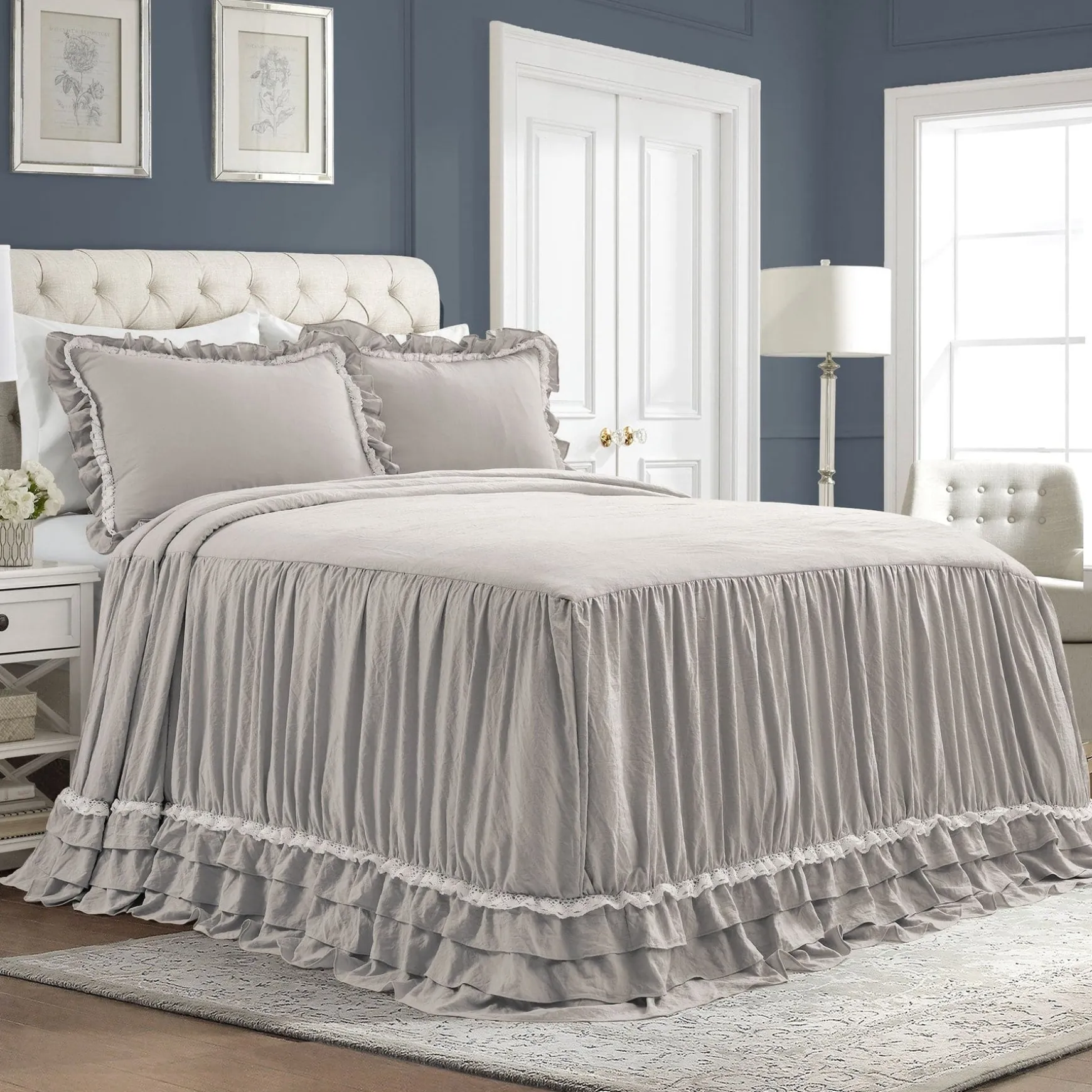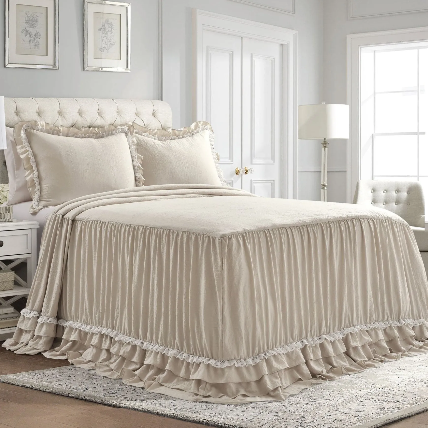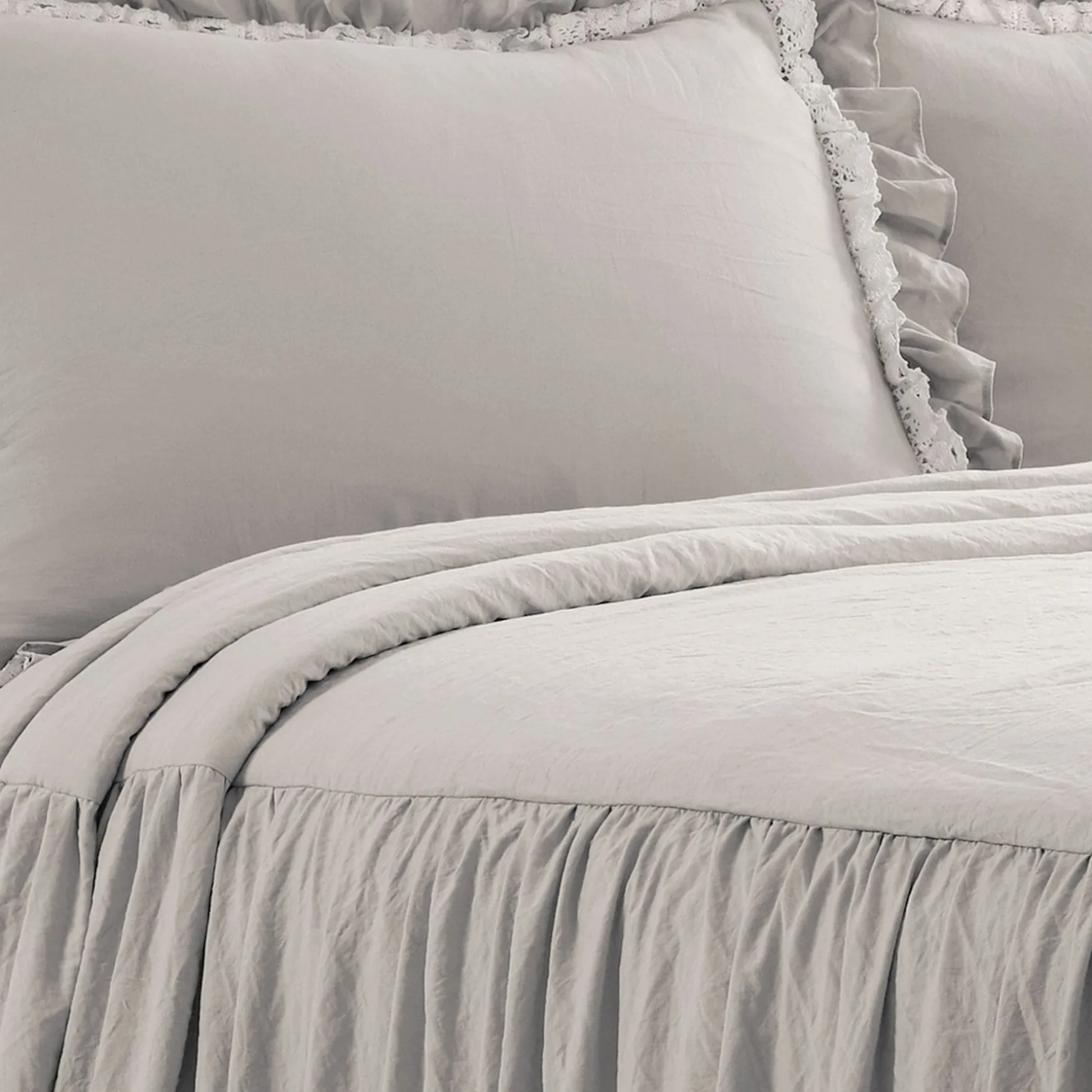 The elegant and charming look of this Ella Ruffle Lace 3 Piece Bedspread Set will add a touch of feminine style to any bedroom or dorm room. The lace trim and layers of ruffles add flair to an otherwise minimalist look that can fit well in farmhouse, vintage chic, traditional or French Country themes.