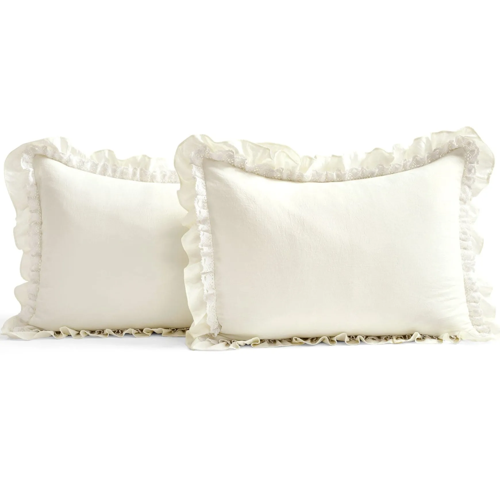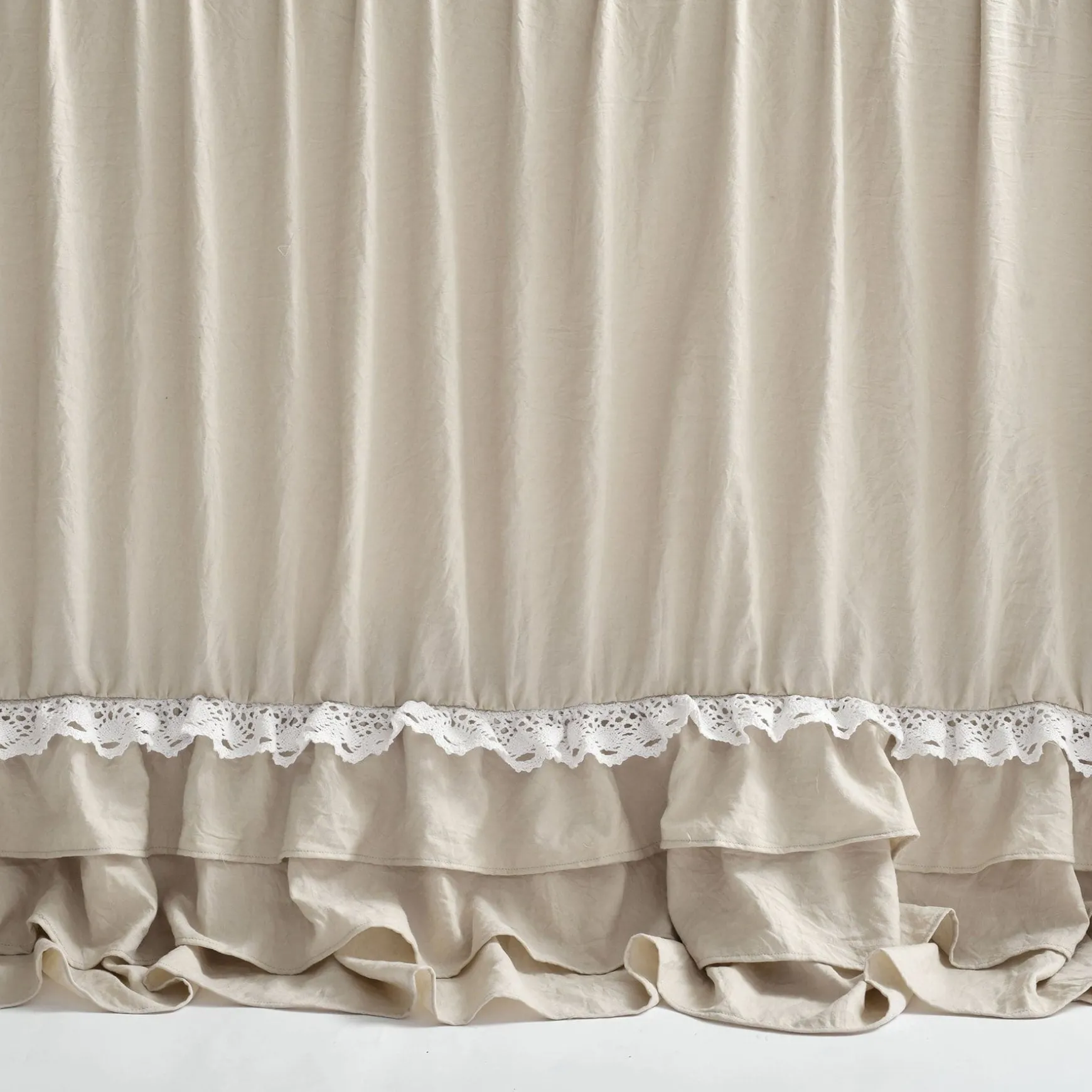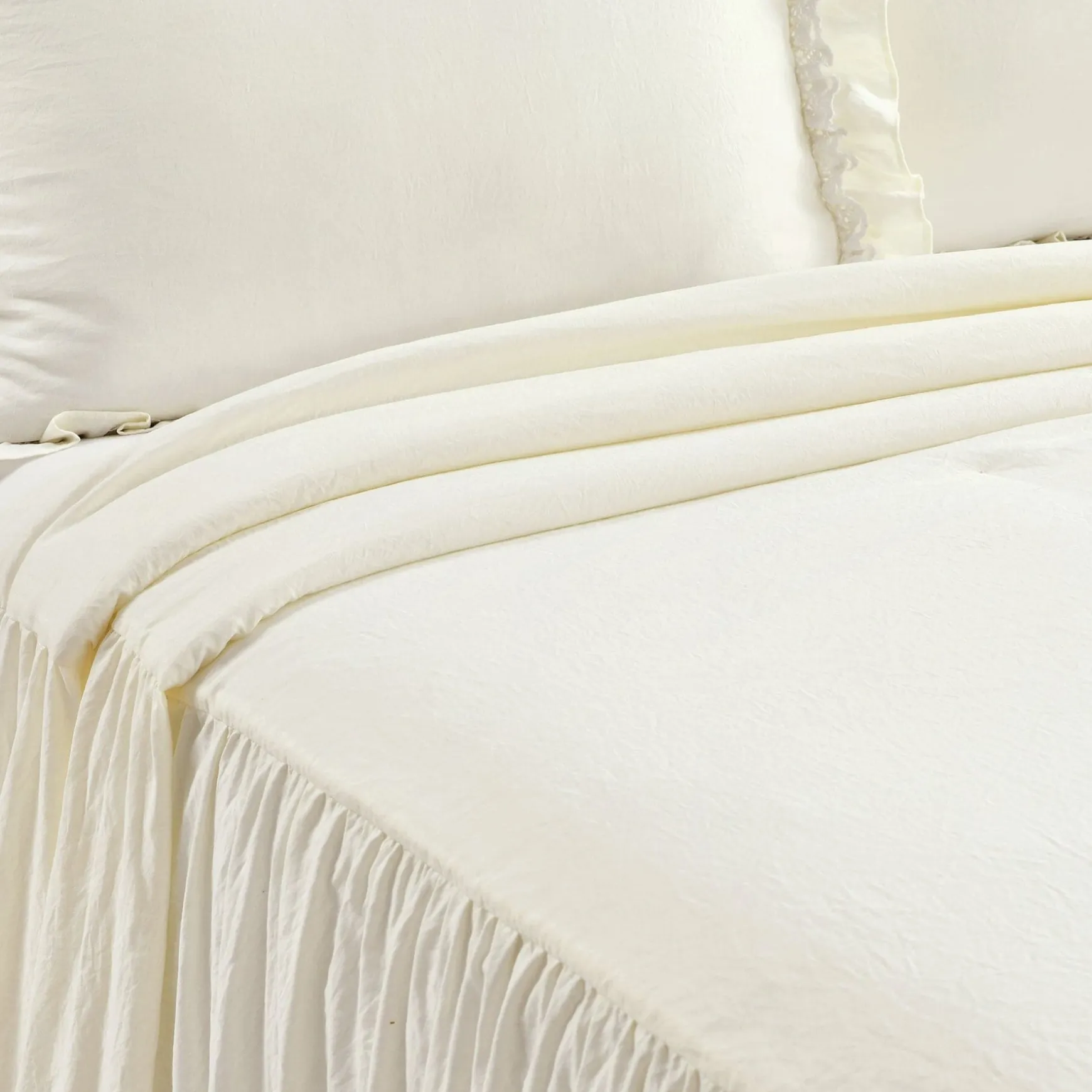 The elegant and charming look of this Ella Ruffle Lace 3 Piece Bedspread Set will add a touch of feminine style to any bedroom or dorm room. The lace trim and layers of ruffles add flair to an otherwise minimalist look that can fit well in farmhouse, vintage chic, traditional or French Country themes.