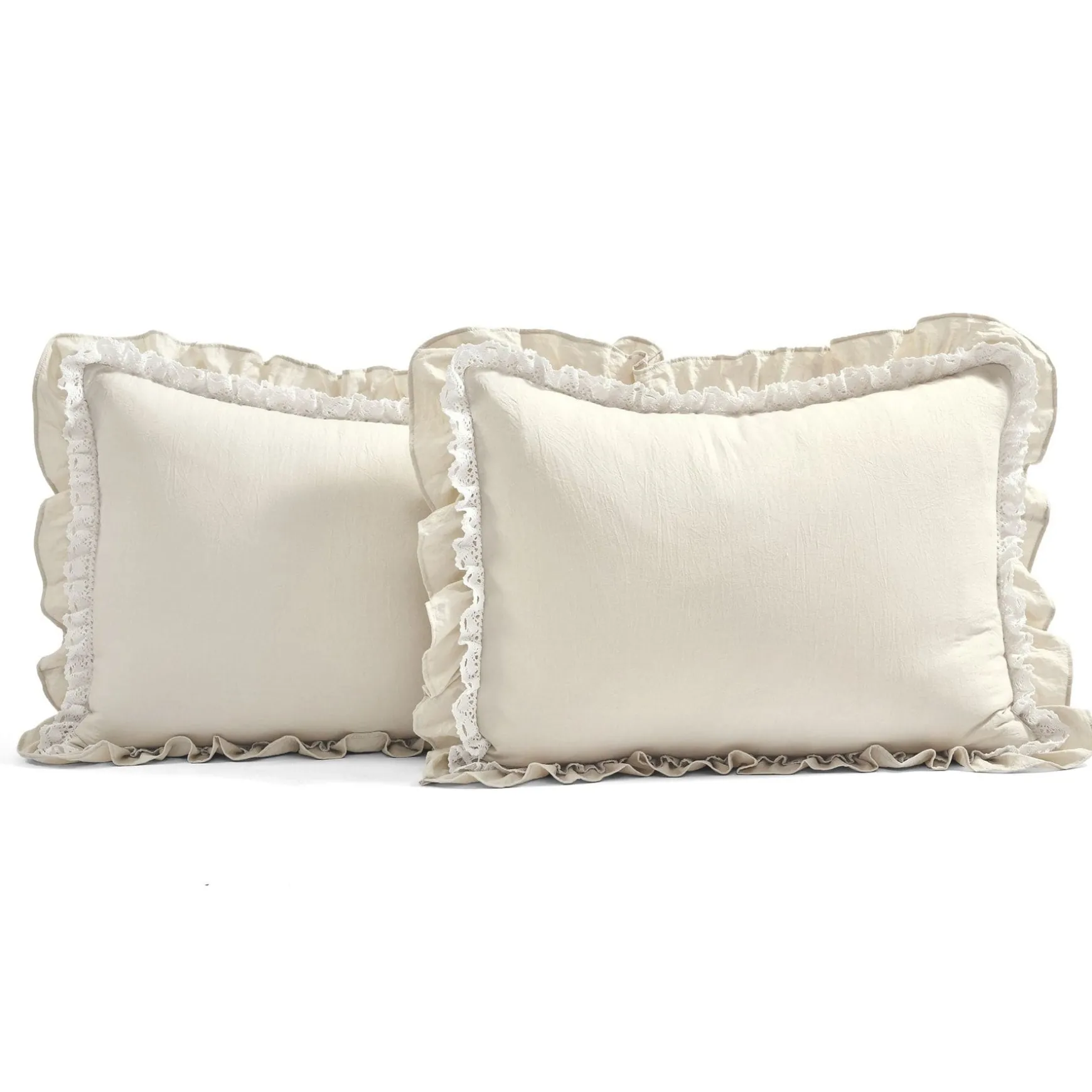 The Ella Ruffle Lace 3 Piece Bedspread Set is available in your choice of queen or king size. Each is a 3-piece set, which includes the bedspread and two matching pillow shams. The pillow shams even have the ruffled edges with the lace trim!