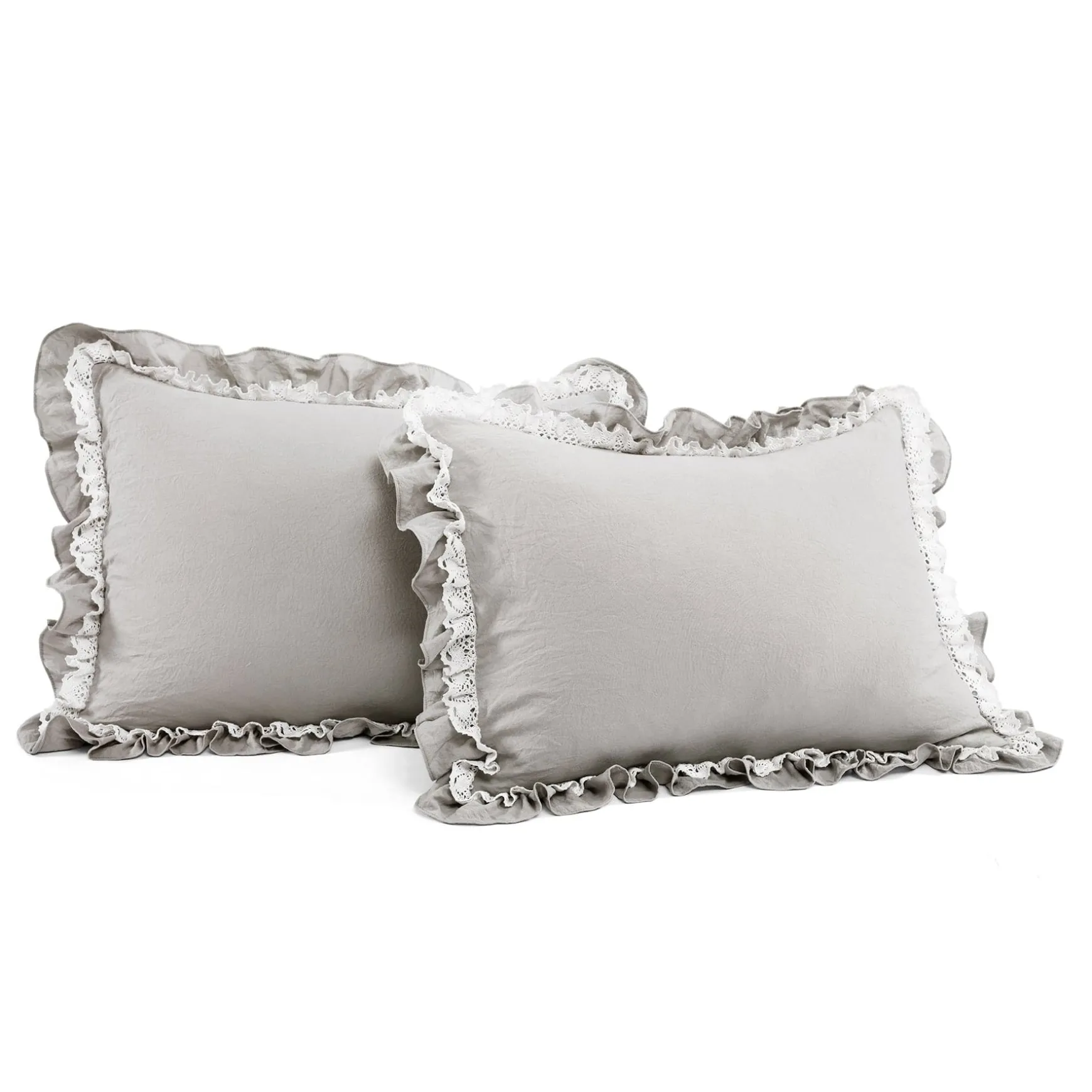 The Ella Ruffle Lace 3 Piece Comforter Set includes a soft and luxurious 230 GSM comforter and two matching pillow shams. The pillow shams even have the ruffled edges with the lace trim! It is available in both King and Full/Queen sizes in four neutral options, including white, ivory, neutral, and light gray.
