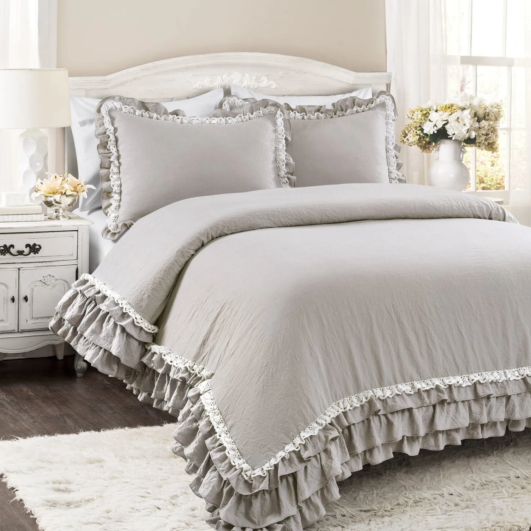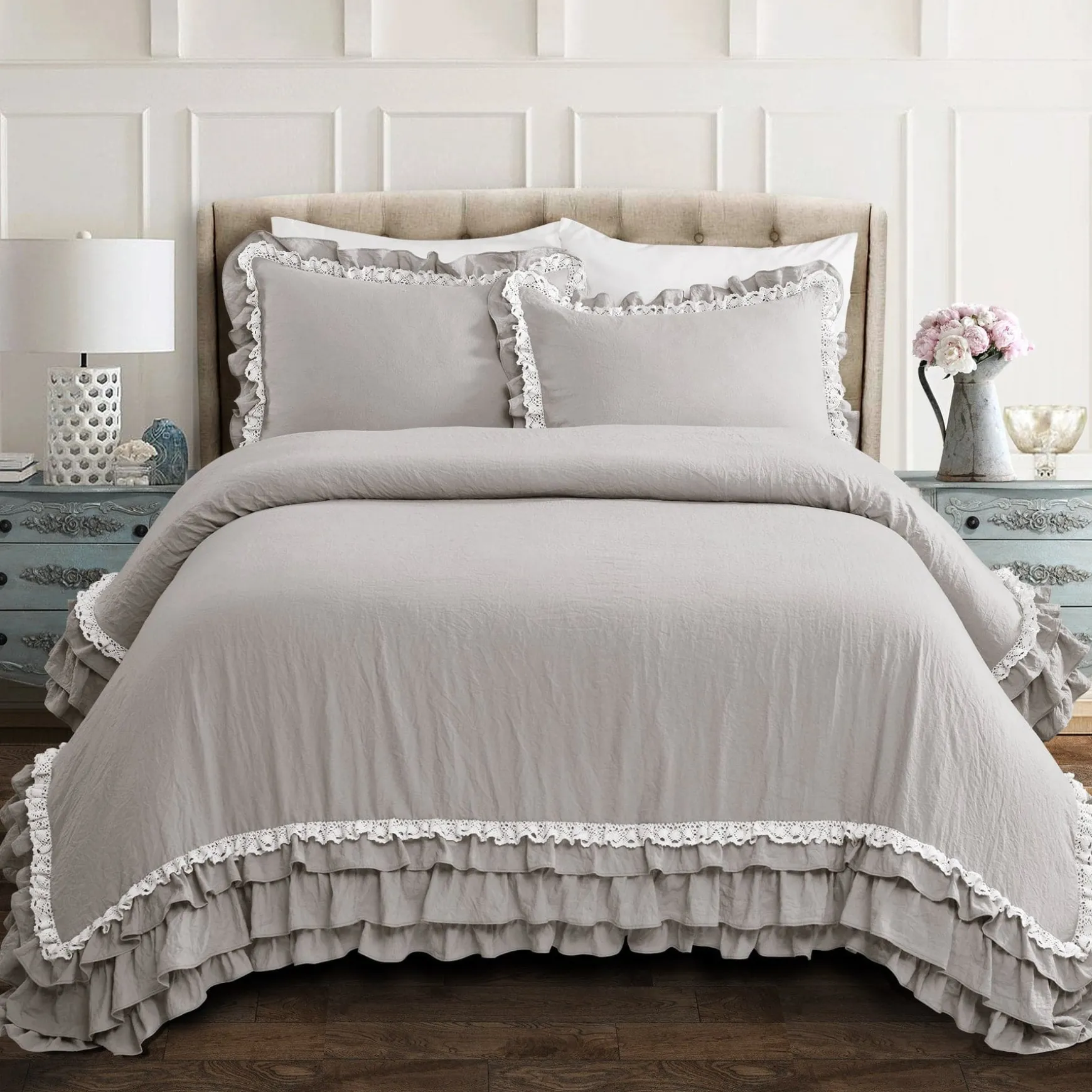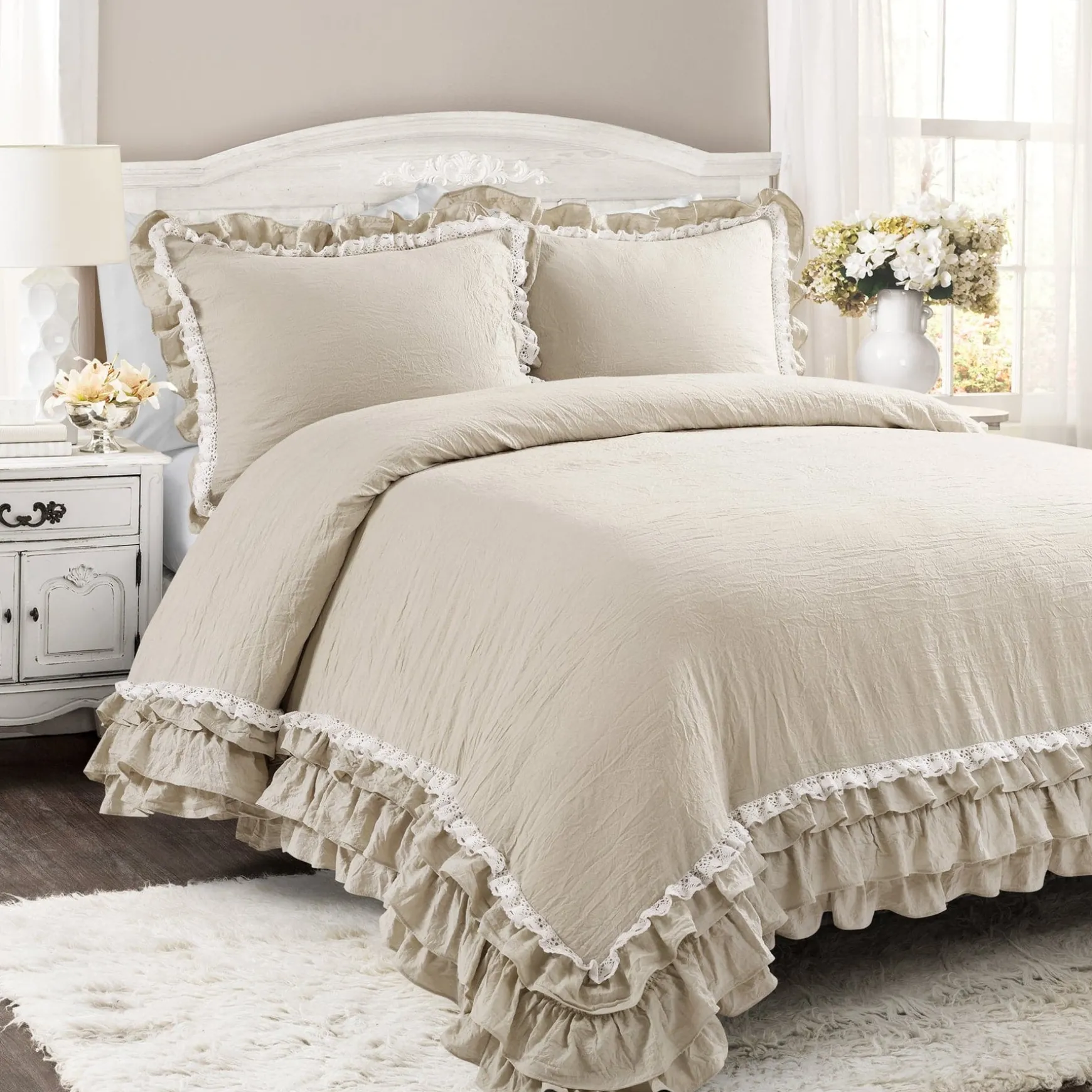 This charming Ella Ruffle Lace 3 Piece Comforter Set will add a touch of feminine style to any bedroom in your home. The lace trim and layers of ruffles add flair to an otherwise minimalist look that can also fit into farmhouse, shabby chic, traditional or French Country themes.