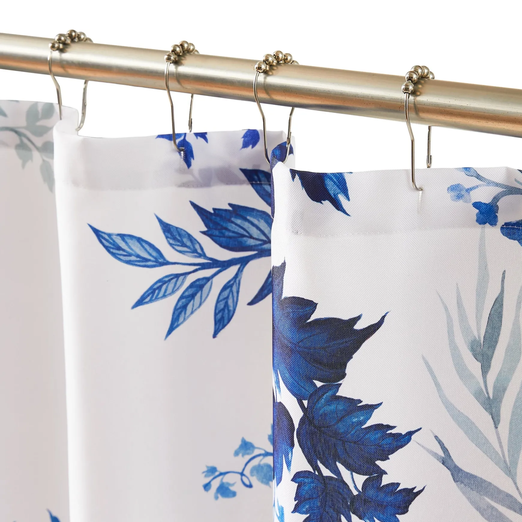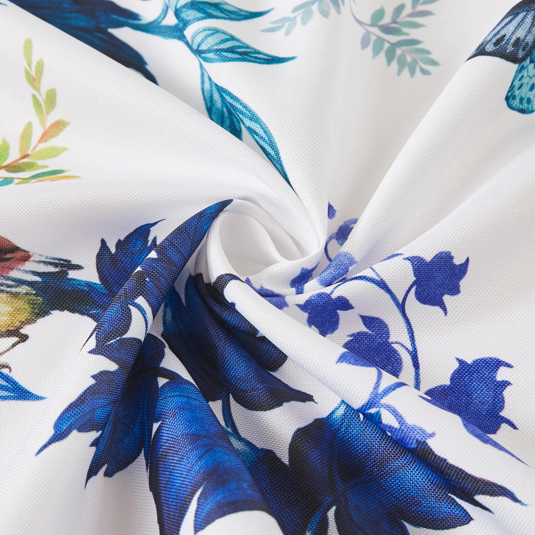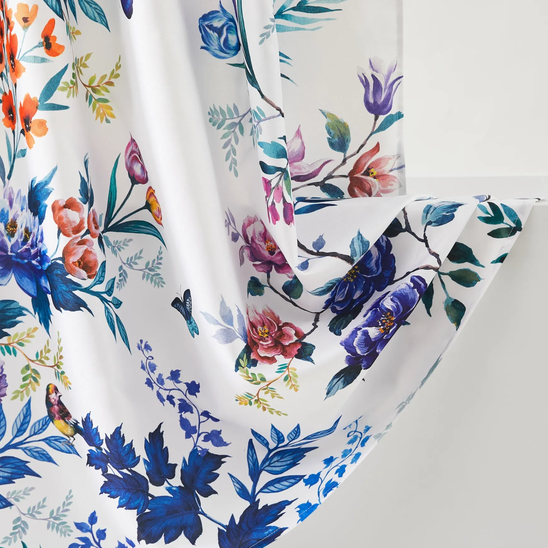 Shower in wonderland of florals with this bold shower curtain, showcasing an exciting print of colorful flowers and birds. It easily transforms any bathroom into a cheerful sanctuary. Crafted from a shiny polyester fabric, this bath curtain measures 72 inches wide by 72 inches long. Installation is easy with 12 button holes at the top to hang with shower hooks or rings. Pair this fabric shower curtain with a liner, sold separately. Machine washable for easy care.