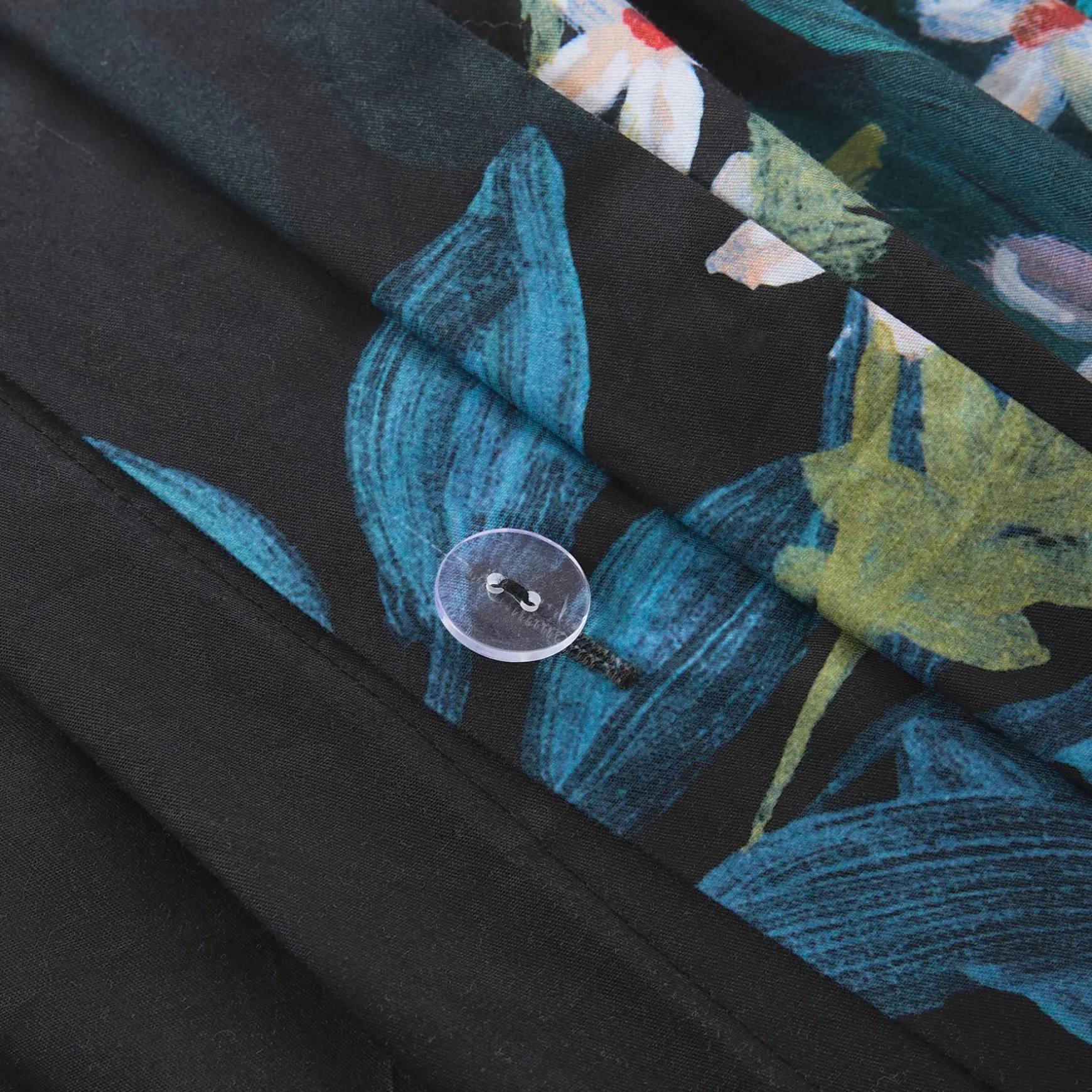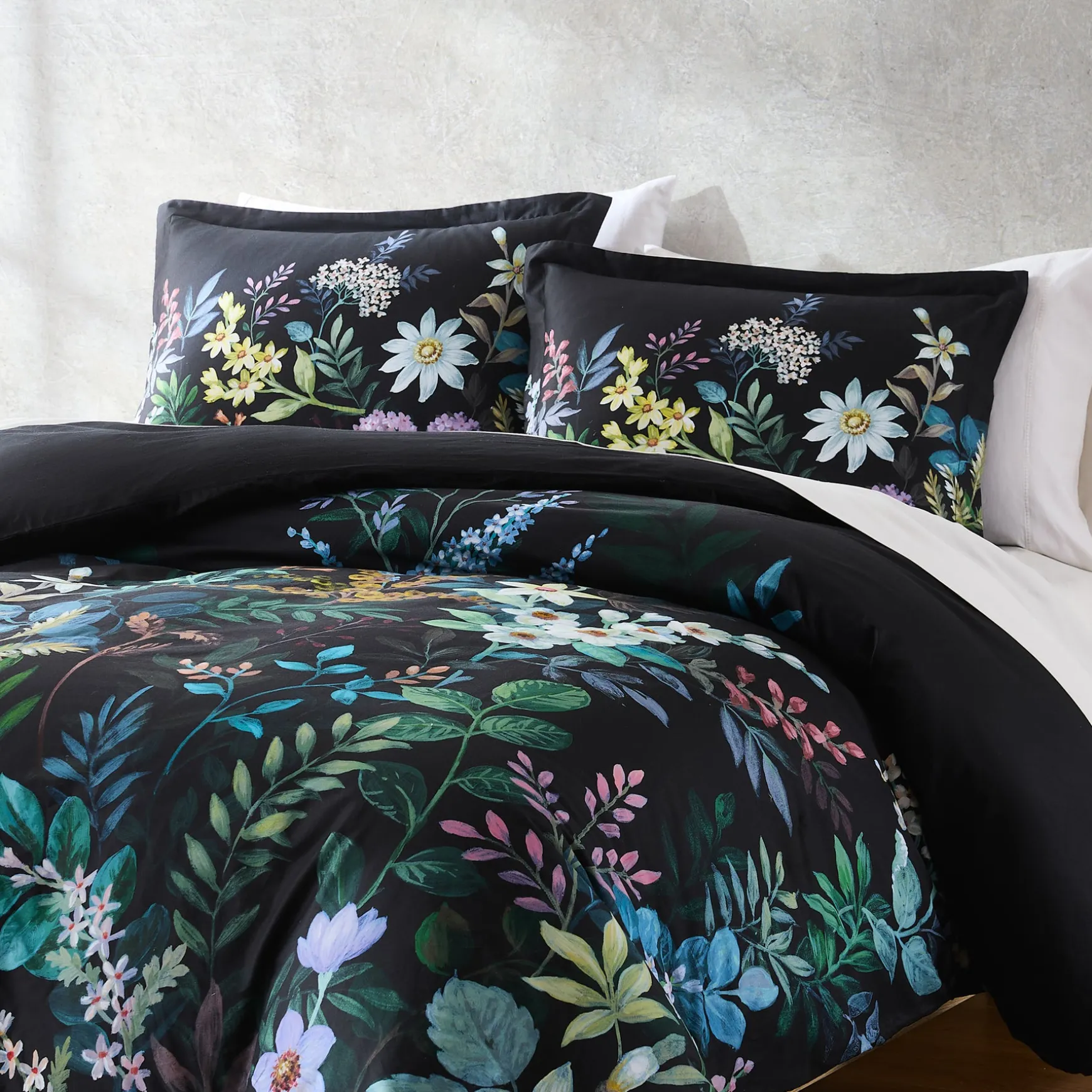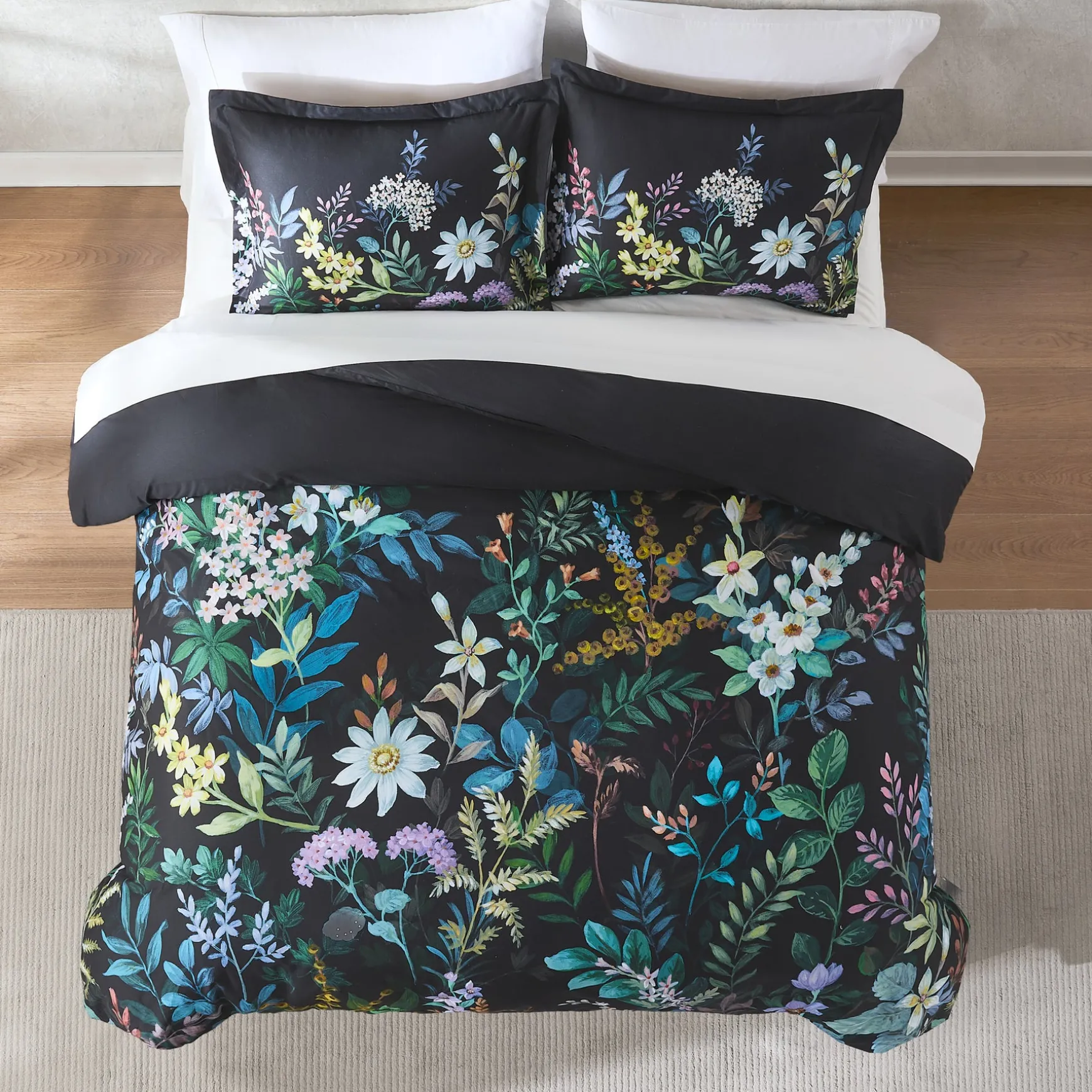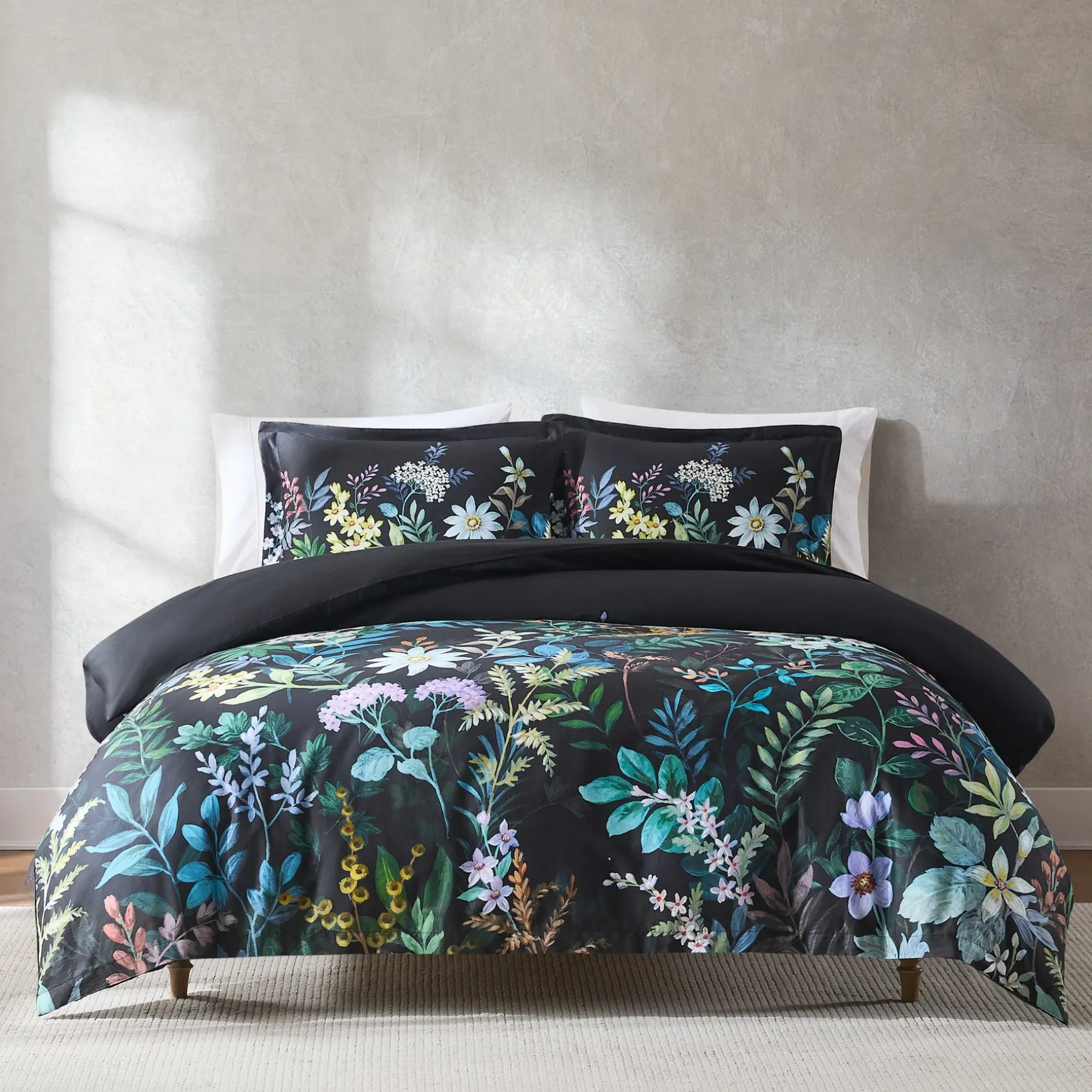 Let your midnight dreams unfold with this floral duvet cover set. The moody botanical print on a rich black canvas adds enchanting drama to any space, great for a modern Victorian or gothic decor style. This 3 piece set includes 1 duvet cover and 2 shams. Add your ideal insert weight for year-round comfort and easily secure it with button closures and corner ties. STANDARD 100 by OEKO-TEX® certified, all components have been tested and certified free from harmful substances. Machine washable.