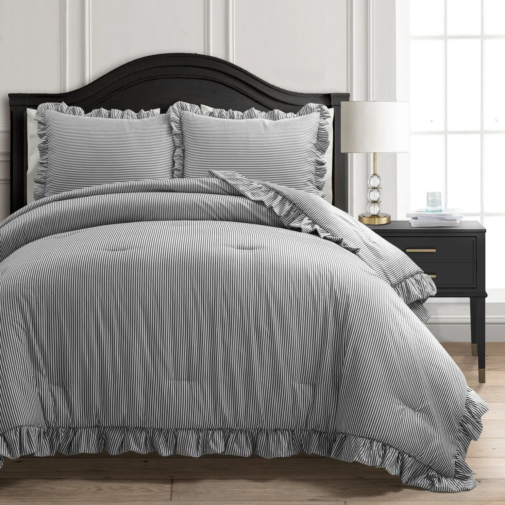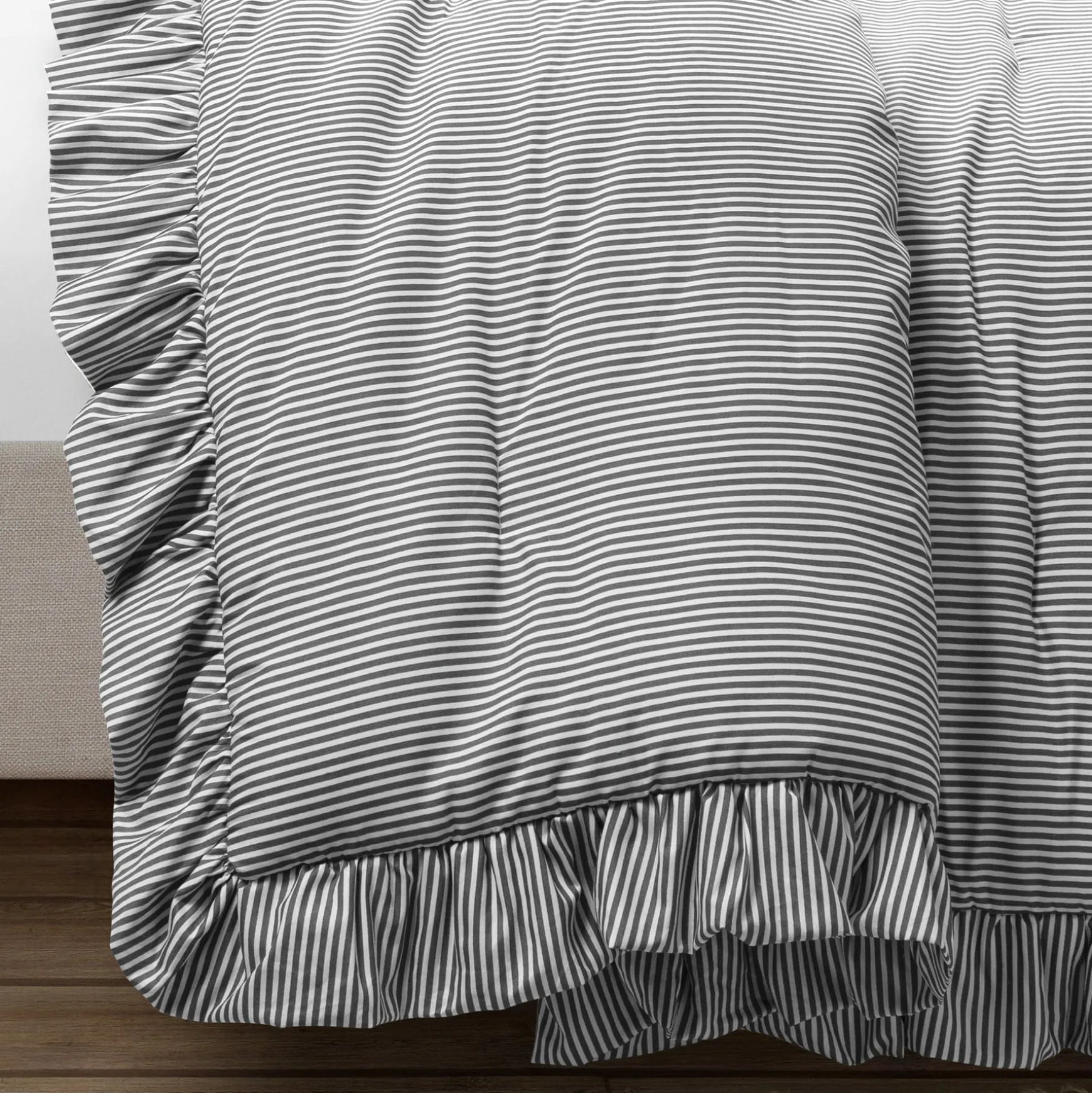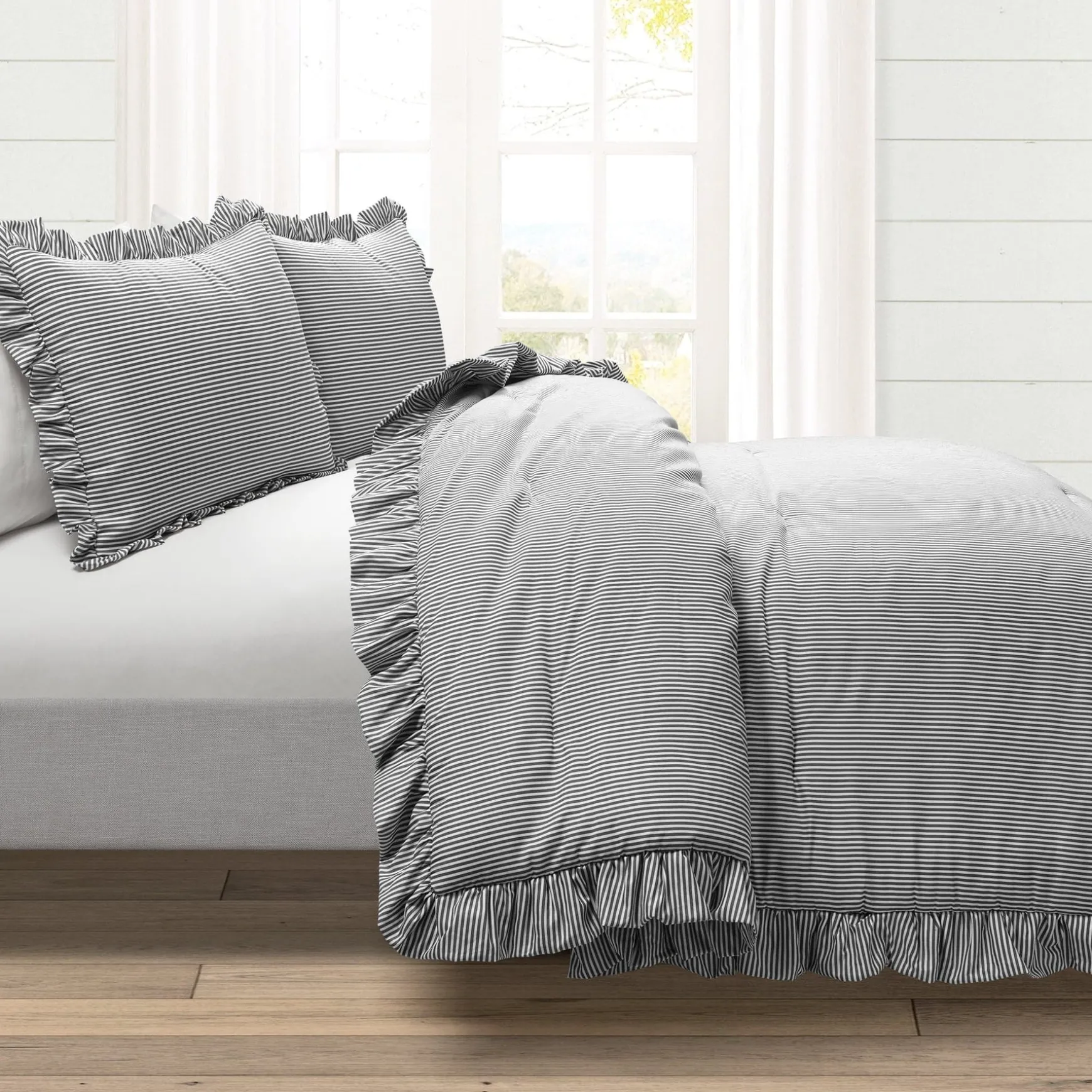 Cozy up your bedroom with a little bit of charm. This plush Farmhouse Stripe Reyna Ruffle Reversible Comforter 3 Piece Set is decorated with a simple and nostalgic stripe design. Easy to style and layer, this bedding is ideal for anyone with a traditional cottage or farmhouse styled bedroom.