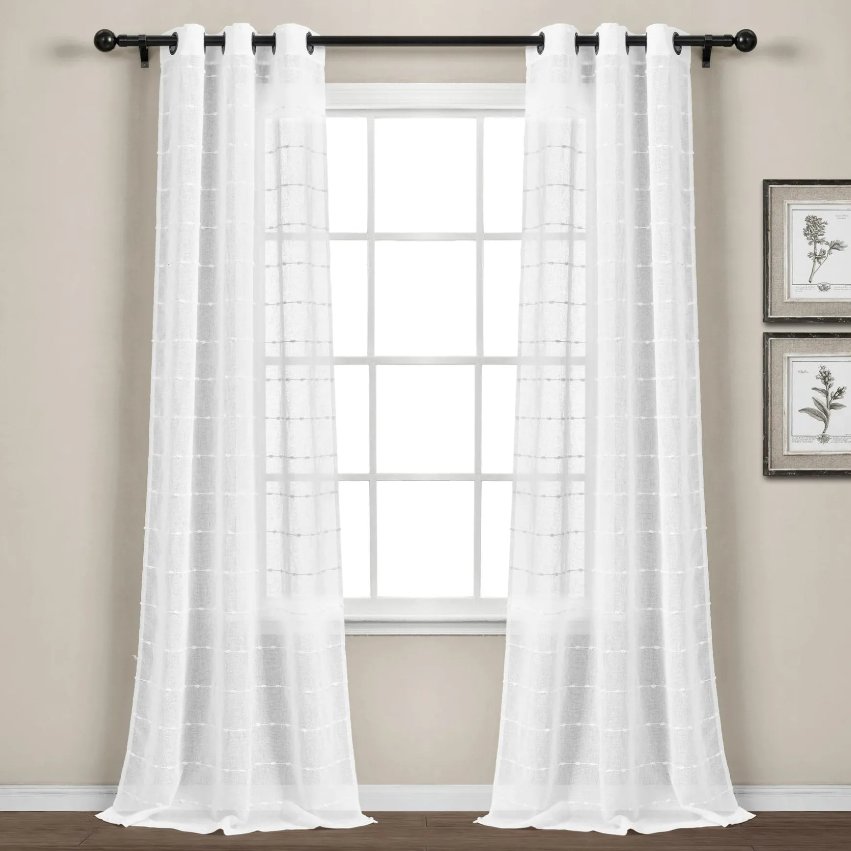 This Farmhouse Textured Grommet Sheer Indoor/Outdoor Window Curtain is sold by the single panel, so if you need to replace one panel or need an odd number of panels, you won’t have to purchase more than you need. Each panel measures 50 inches wide and 84 inches long.