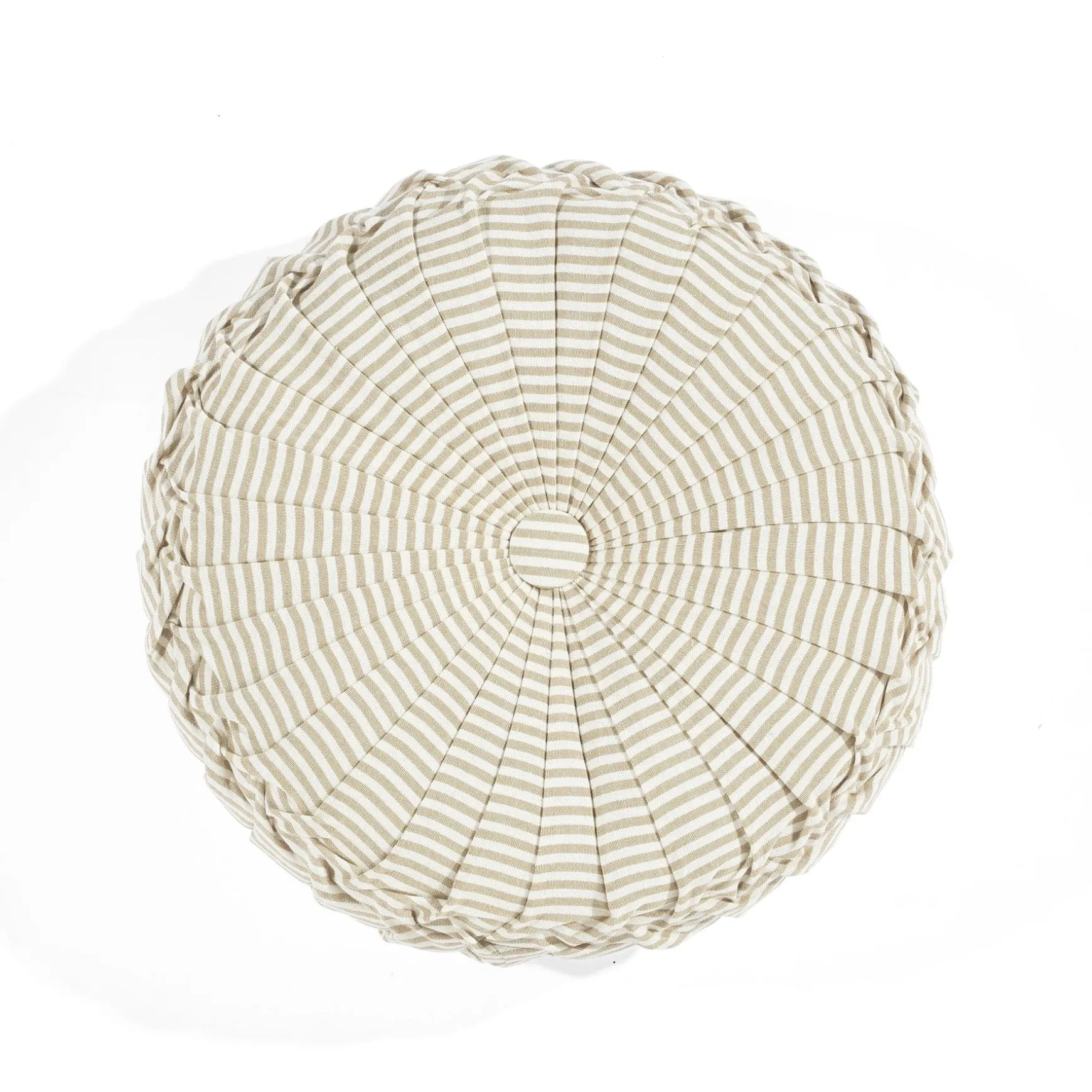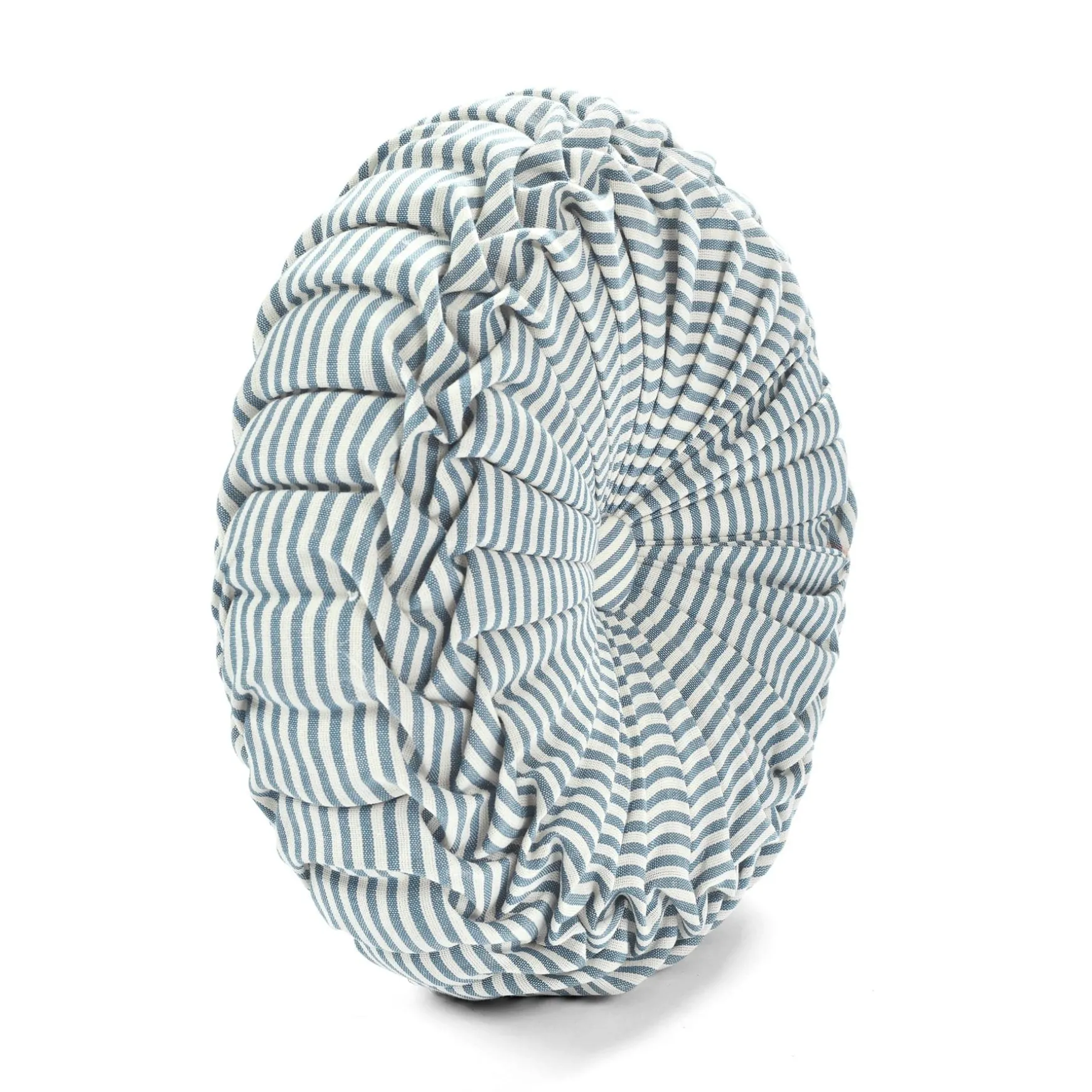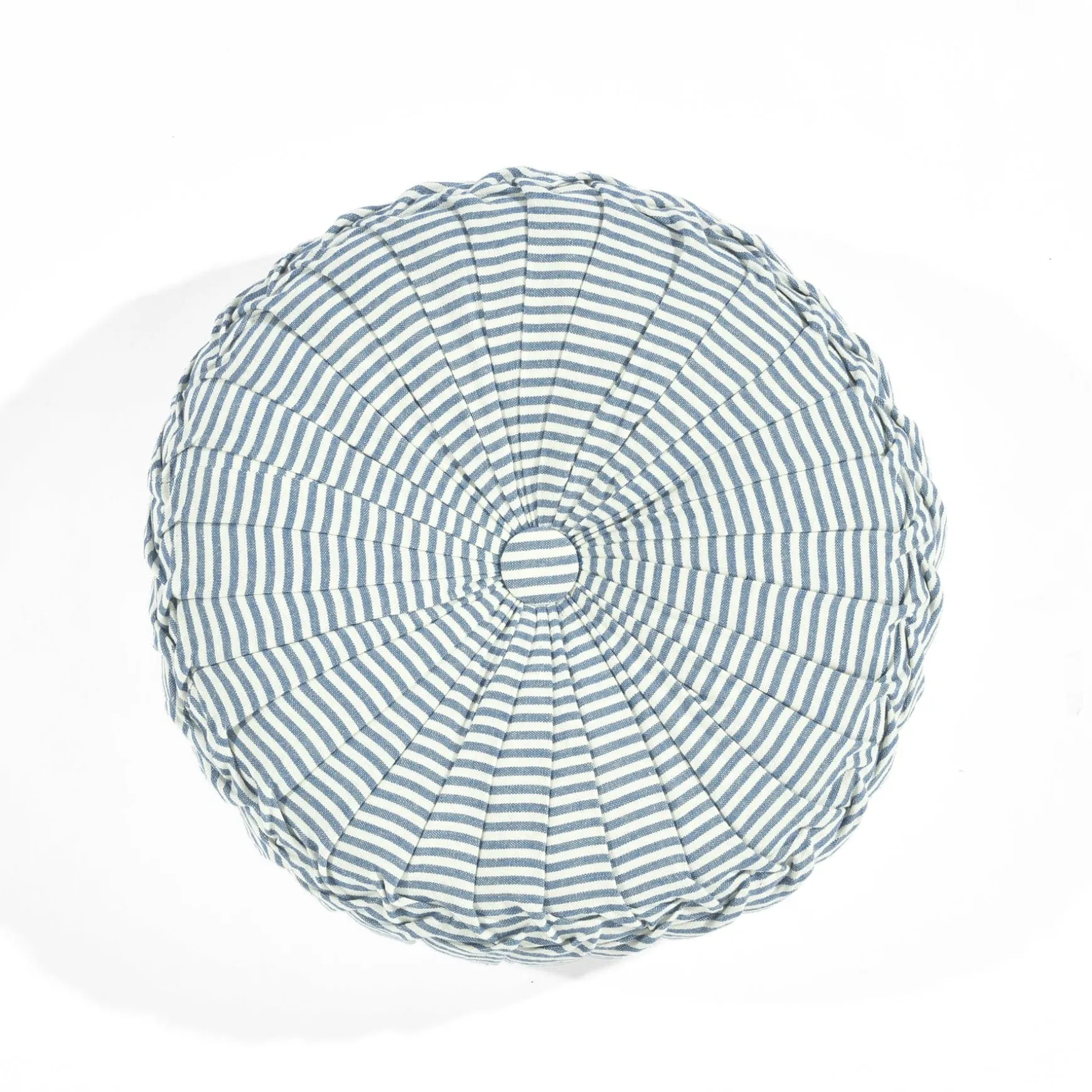 This circular accent pillow measures 14 inches in diameter. This Farmhouse Ticking Stripe Yarn Dyed Pleated Decorative Pillow is a standard size that is large enough to make an impact on your design but not so big that it will take over the look of the room.