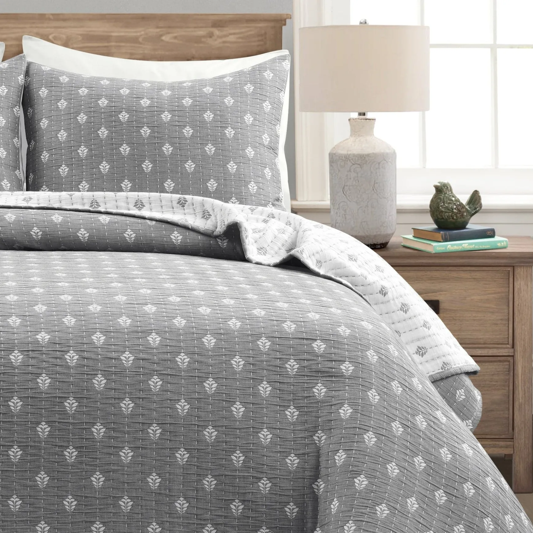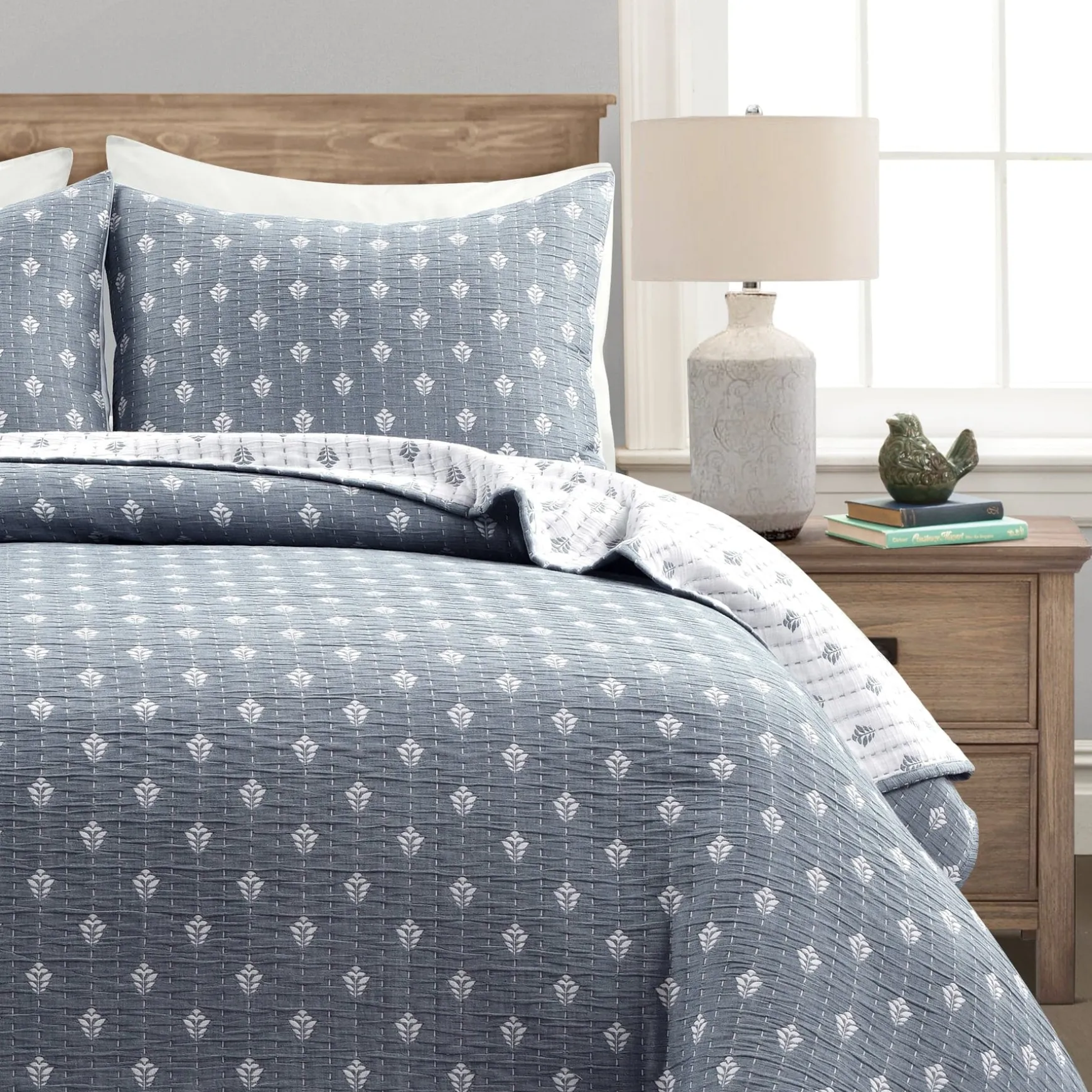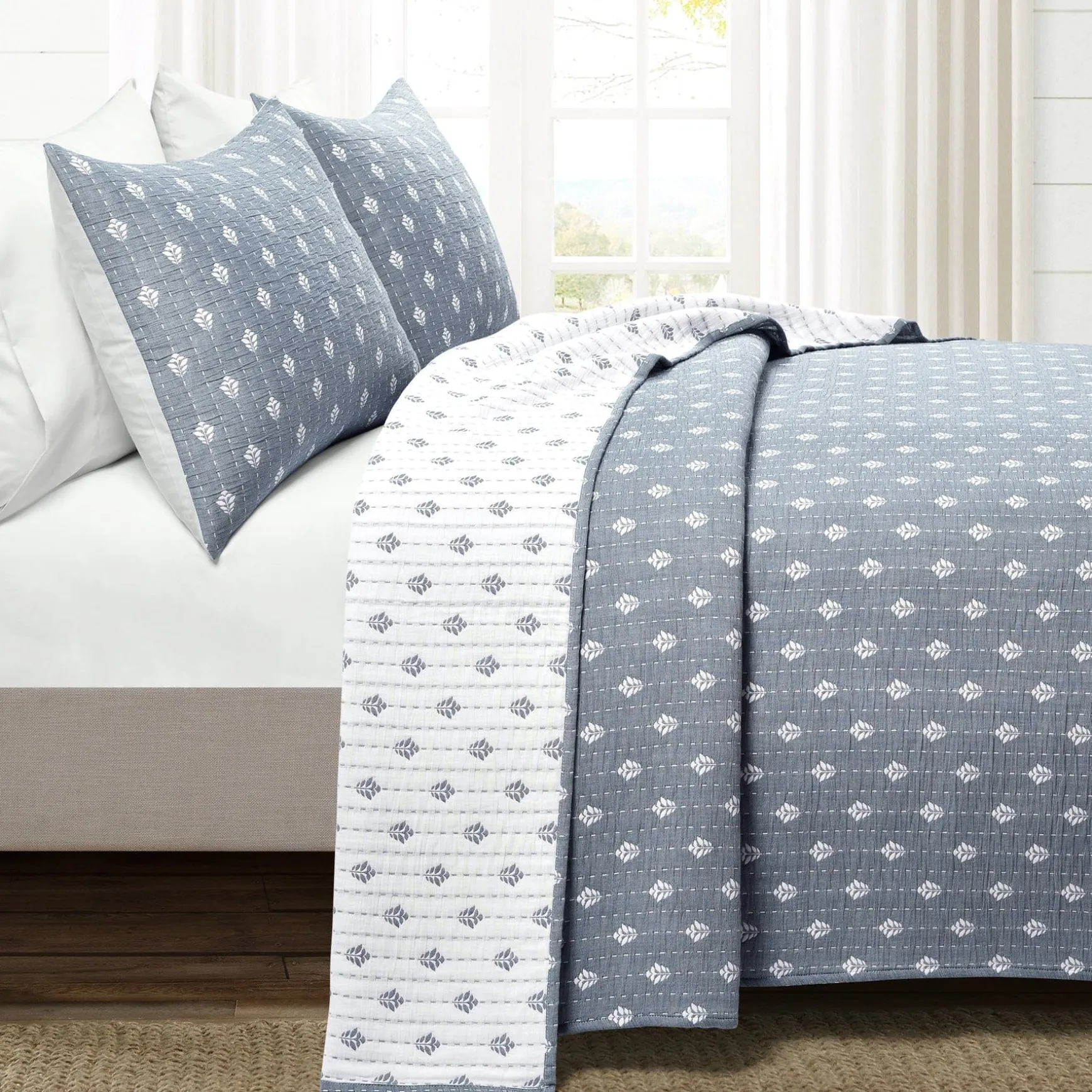 Refresh your bedroom design with this 3-piece reversible cotton quilt/coverlet set. The front and back feature a subtle leaf pattern, perfect for hygge, bohemian, or cottage design styles. Use the Hygge Kantha Pick Stitch Yarn Dyed Cotton Jacquard Quilt/Coverlet Set as stand alone bedding or a layering piece.