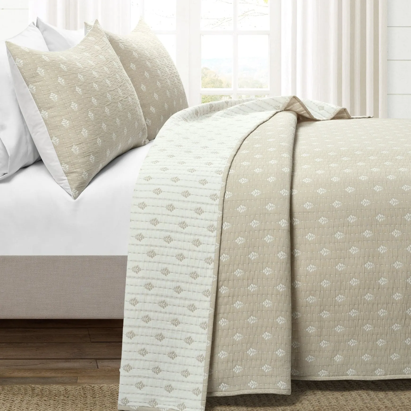 Because it is reversible, you get two great looks in one affordable set. The design on the reverse side of the Hygge Kantha Pick Stitch Yarn Dyed Cotton Jacquard Quilt/Coverlet Set is the same as the front, but the colors swap. Where the leaves are off white on the front, the background color will be off white on the reverse side.