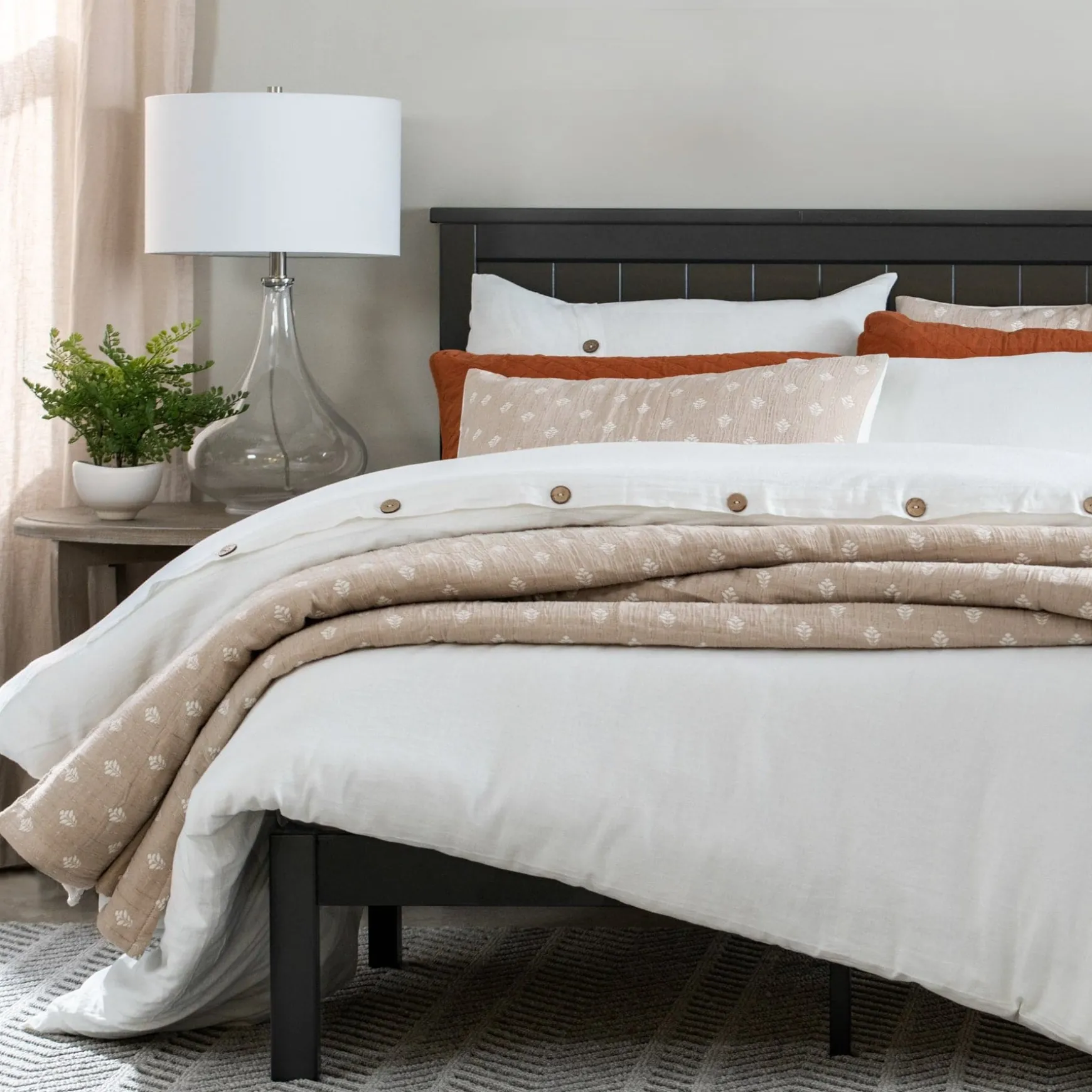 - Full/Queen: Quilt: 90″H x 90″W; Shams: 20″H x 26″W