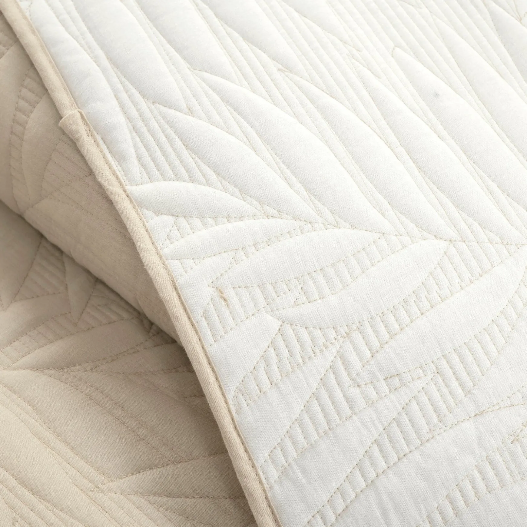 The reversible design of the Isla Embroidered Leaf Reversible Cotton Quilt 3 Piece Set offers you two neutral solid looks, allowing you to effortlessly switch between classic elegance and modern simplicity. The front of the quilt is a soft neutral beige, and the reverse is a crisp, clean white.