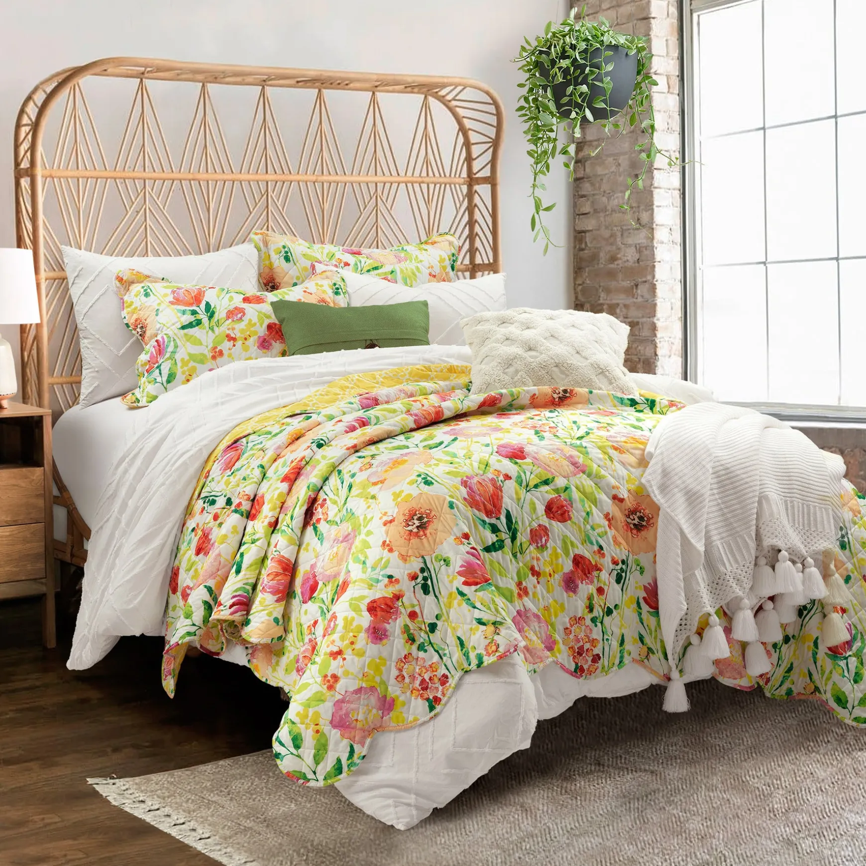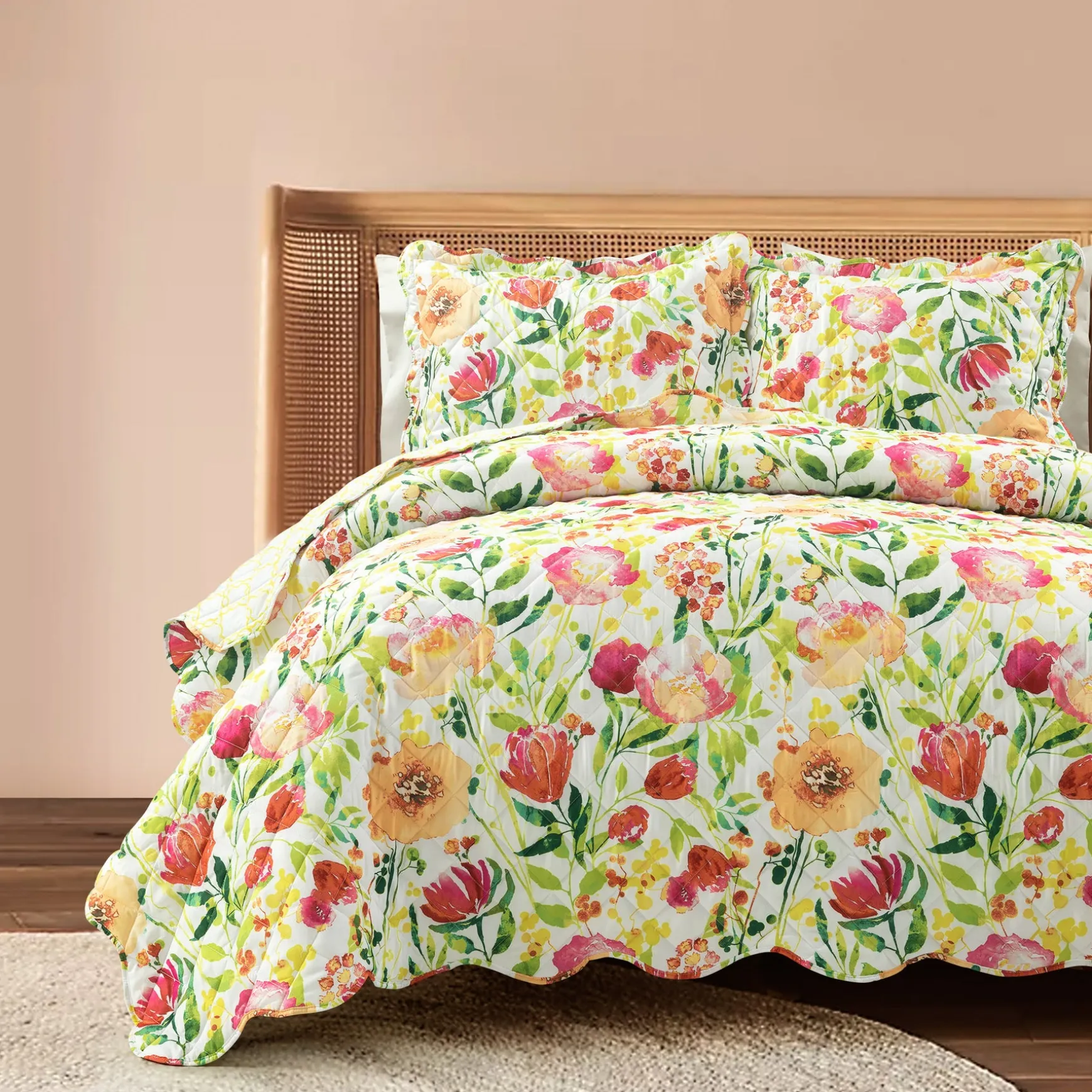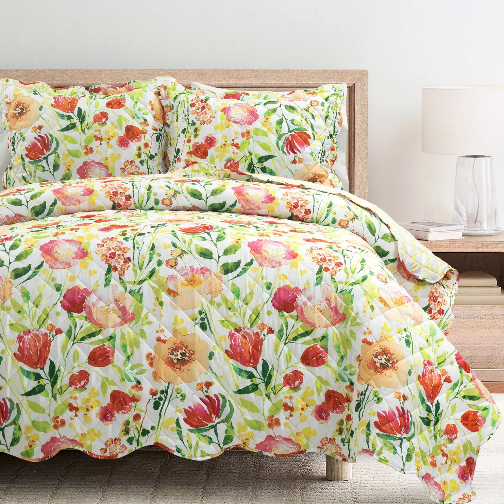 Brighten your bedroom with the floral pattern of our Leilani Watercolor Scallop Edged Floral 3 Piece Quilt Set. This bright watercolor print embodies the spirit of spring and summer with a gorgeous array of blooming botanicals.