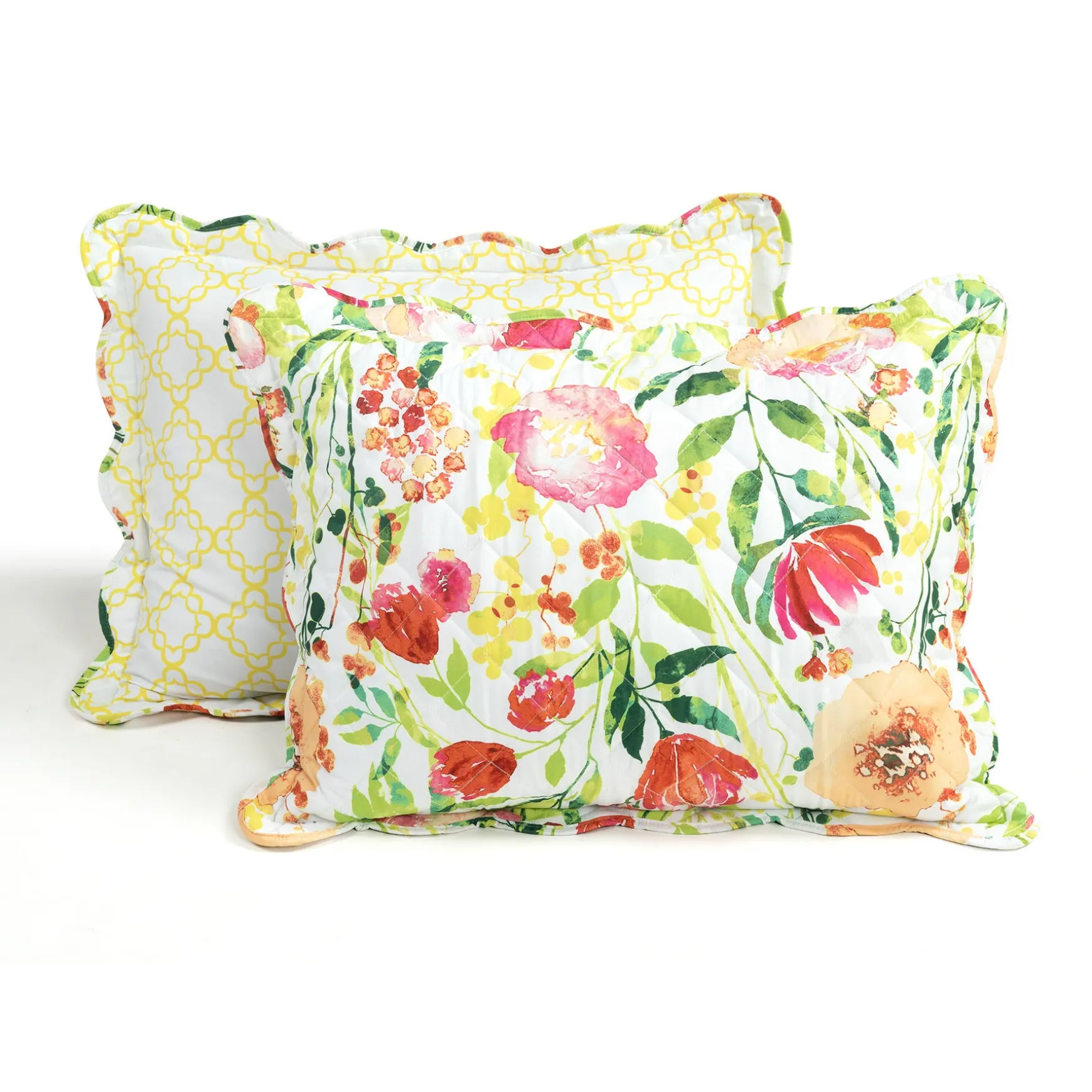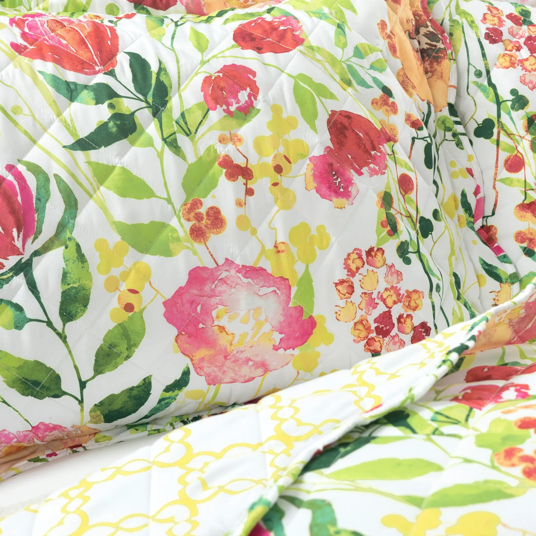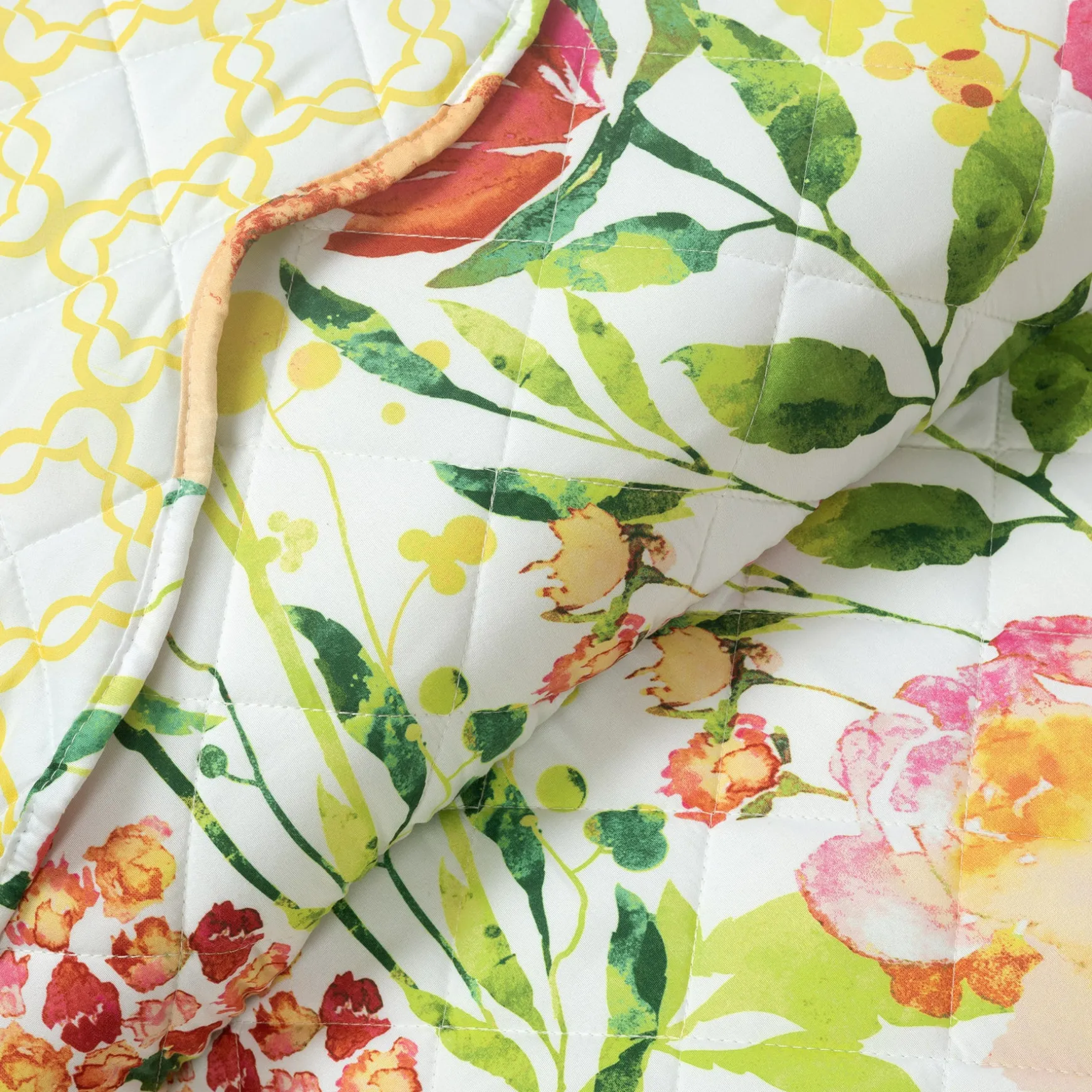 The back of the Leilani Watercolor Scallop Edged Floral 3 Piece Quilt Set is a yellow diamond geometric print. The reversible nature of this bedding set allows you to switch up the look in your space as often as you like, simply by flipping it over to the other side.