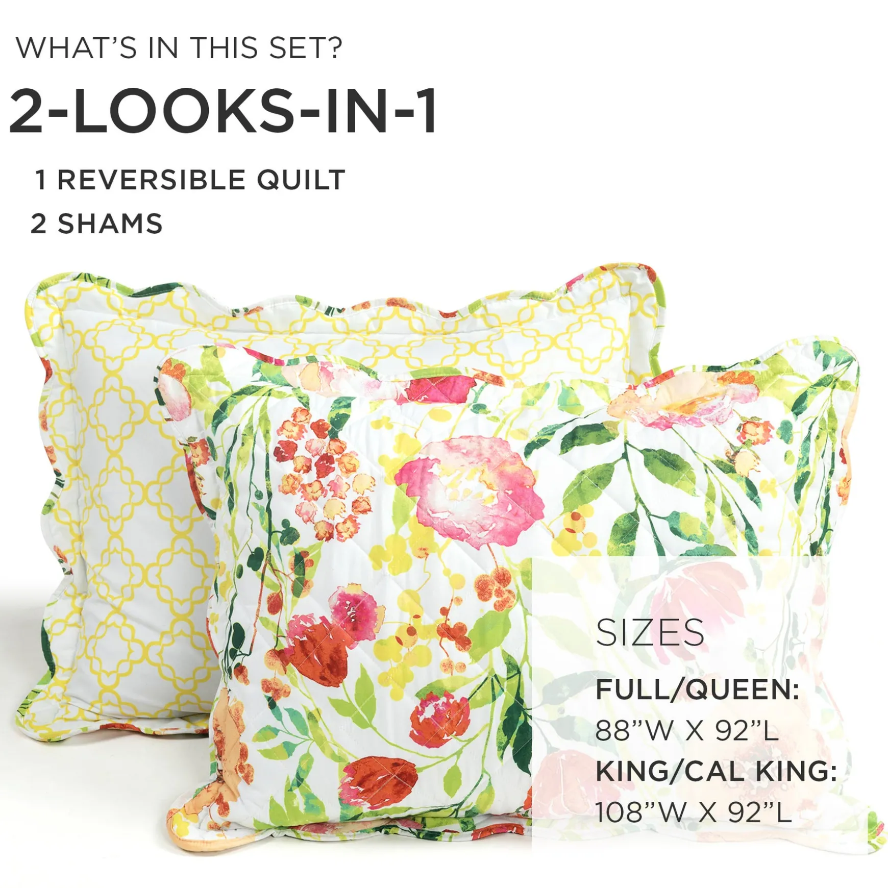 - Full/Queen Quilt: 92″H x 88″W, Shams: 20″H x 26″W