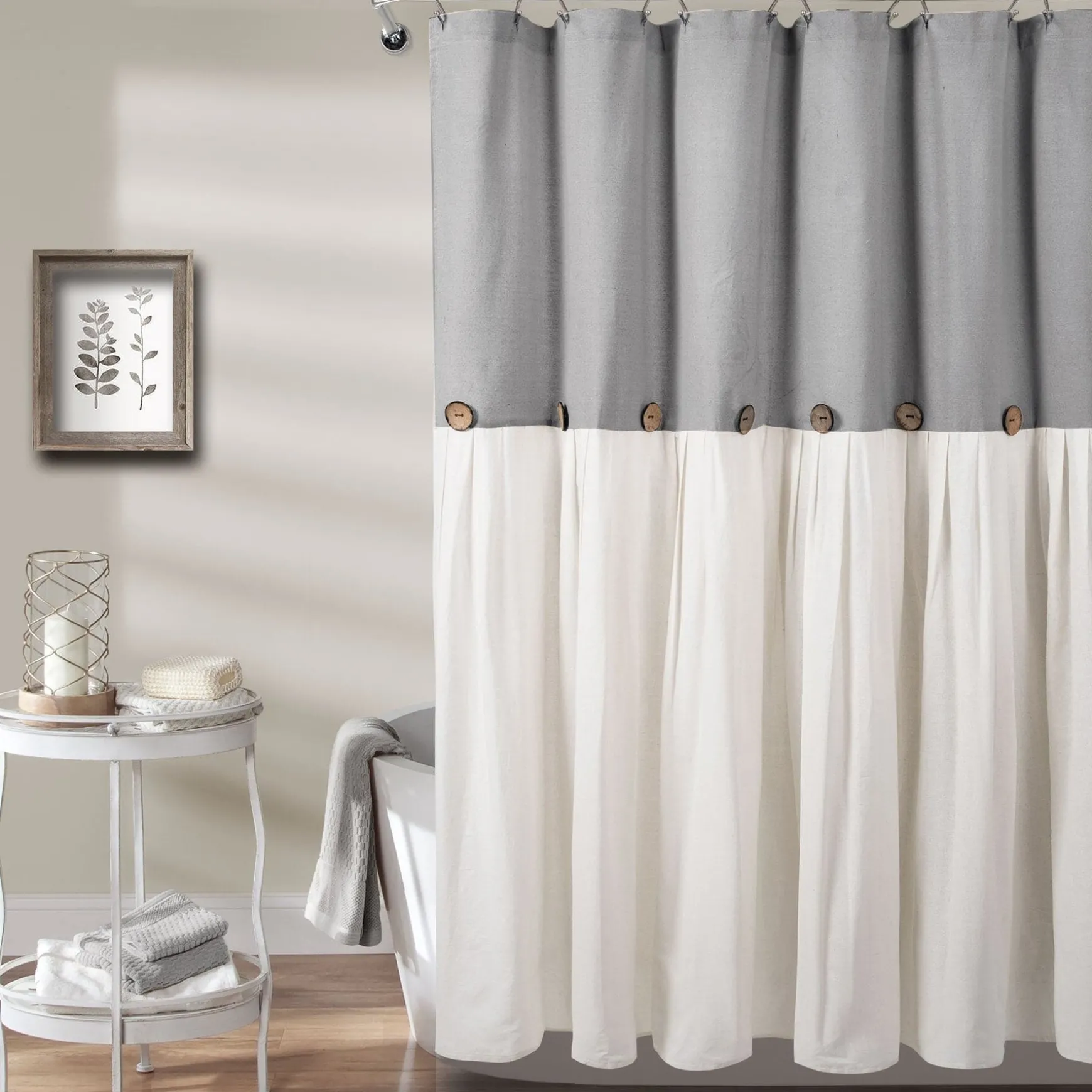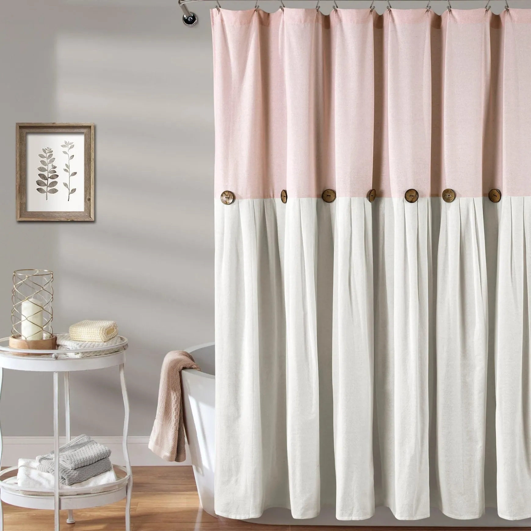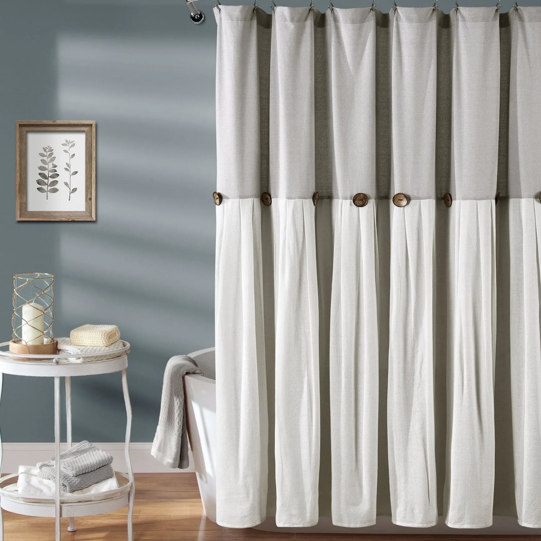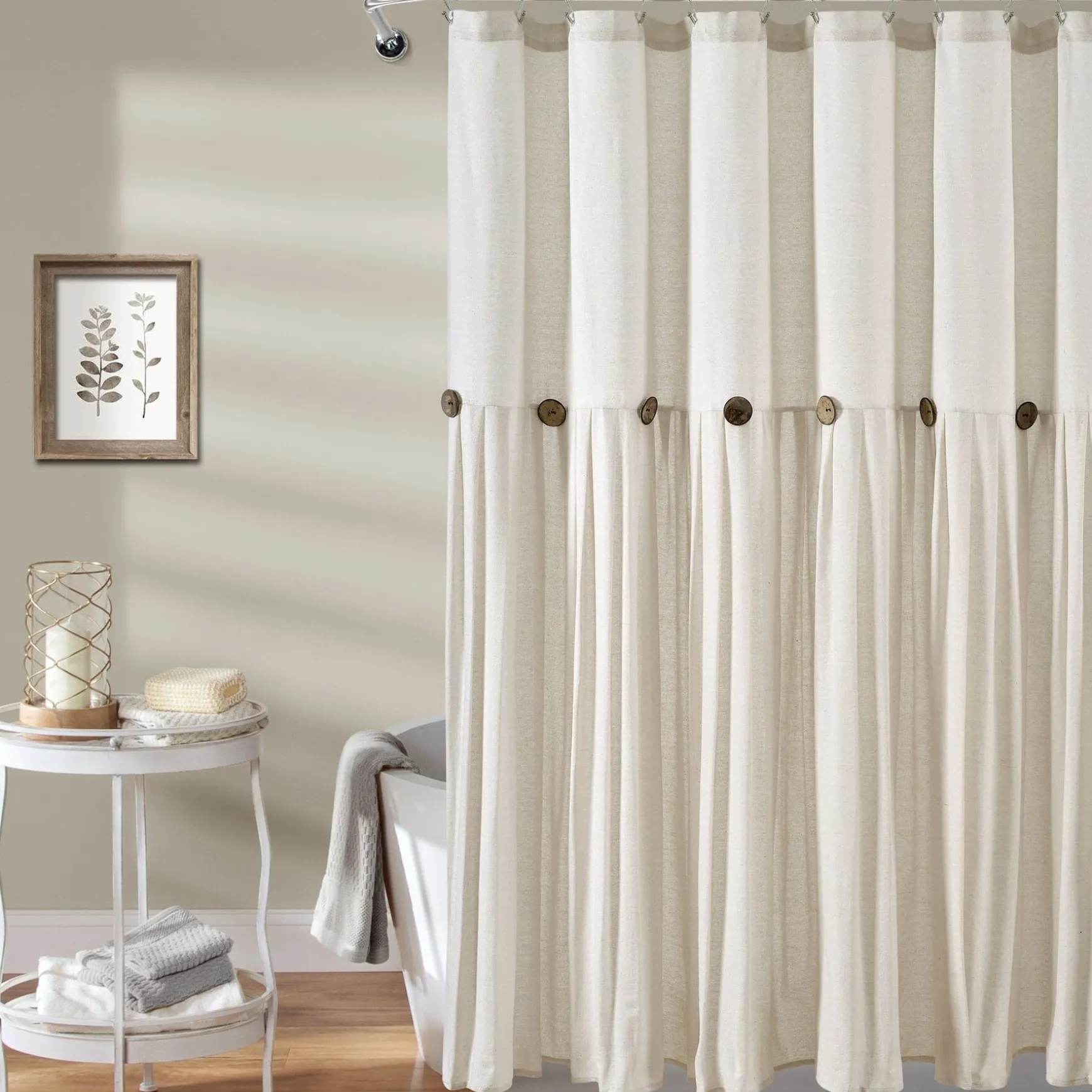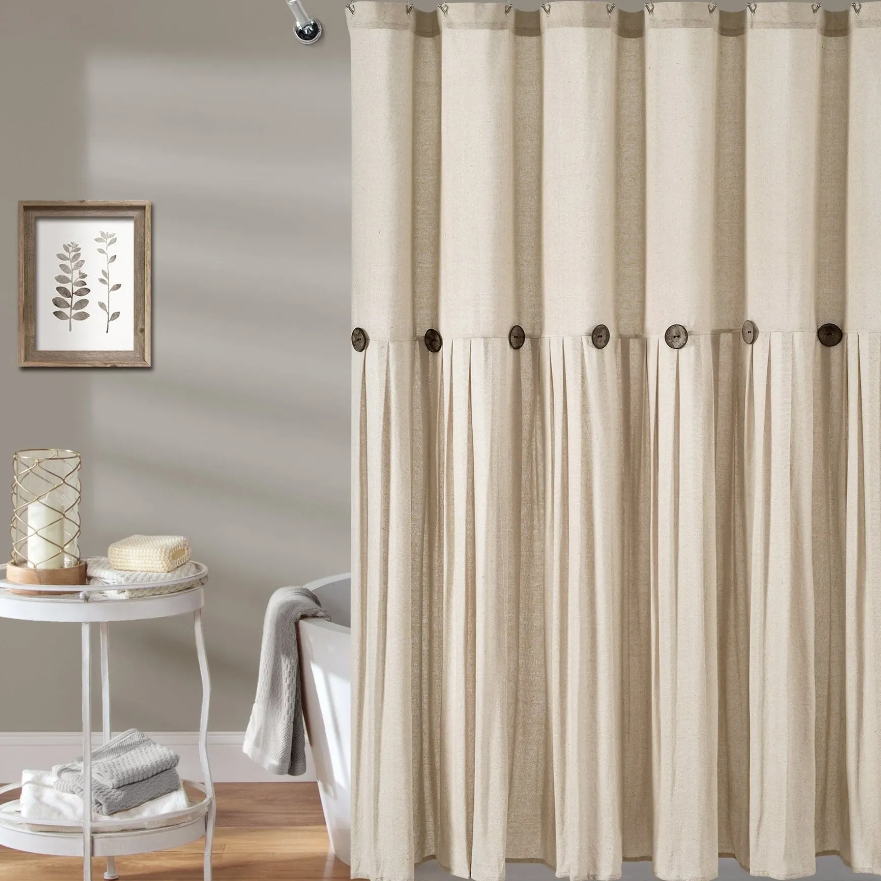 The pleats in the faux linen fabric give this Linen Button Shower Curtain a more textured look. The slight weave variations are authentic to this natural fiber blend and create a relaxed look.