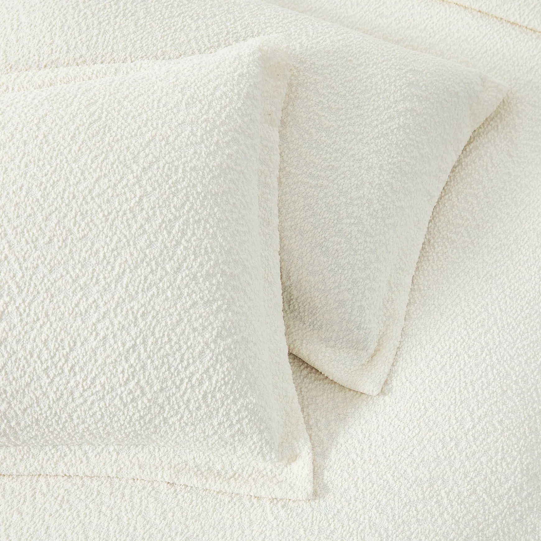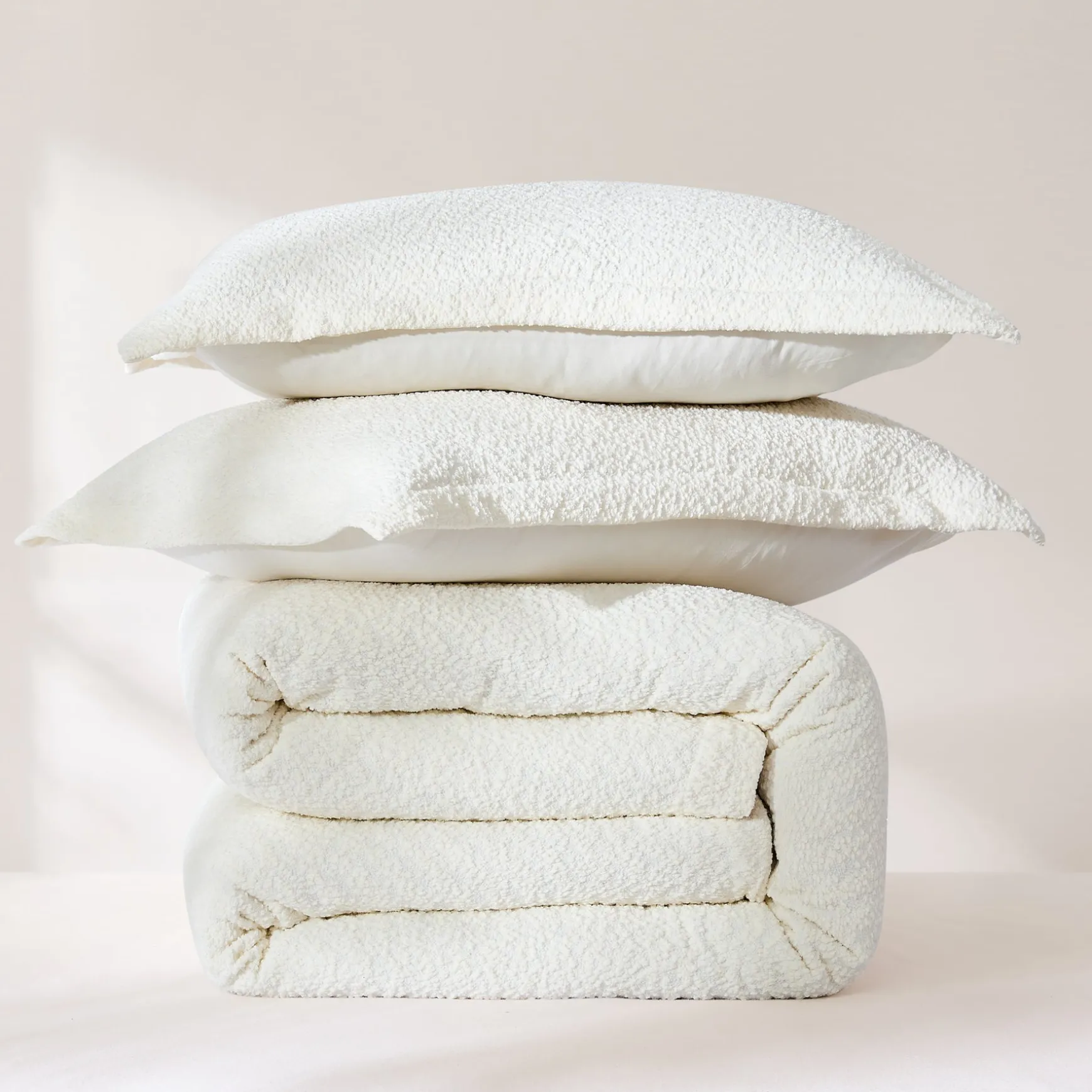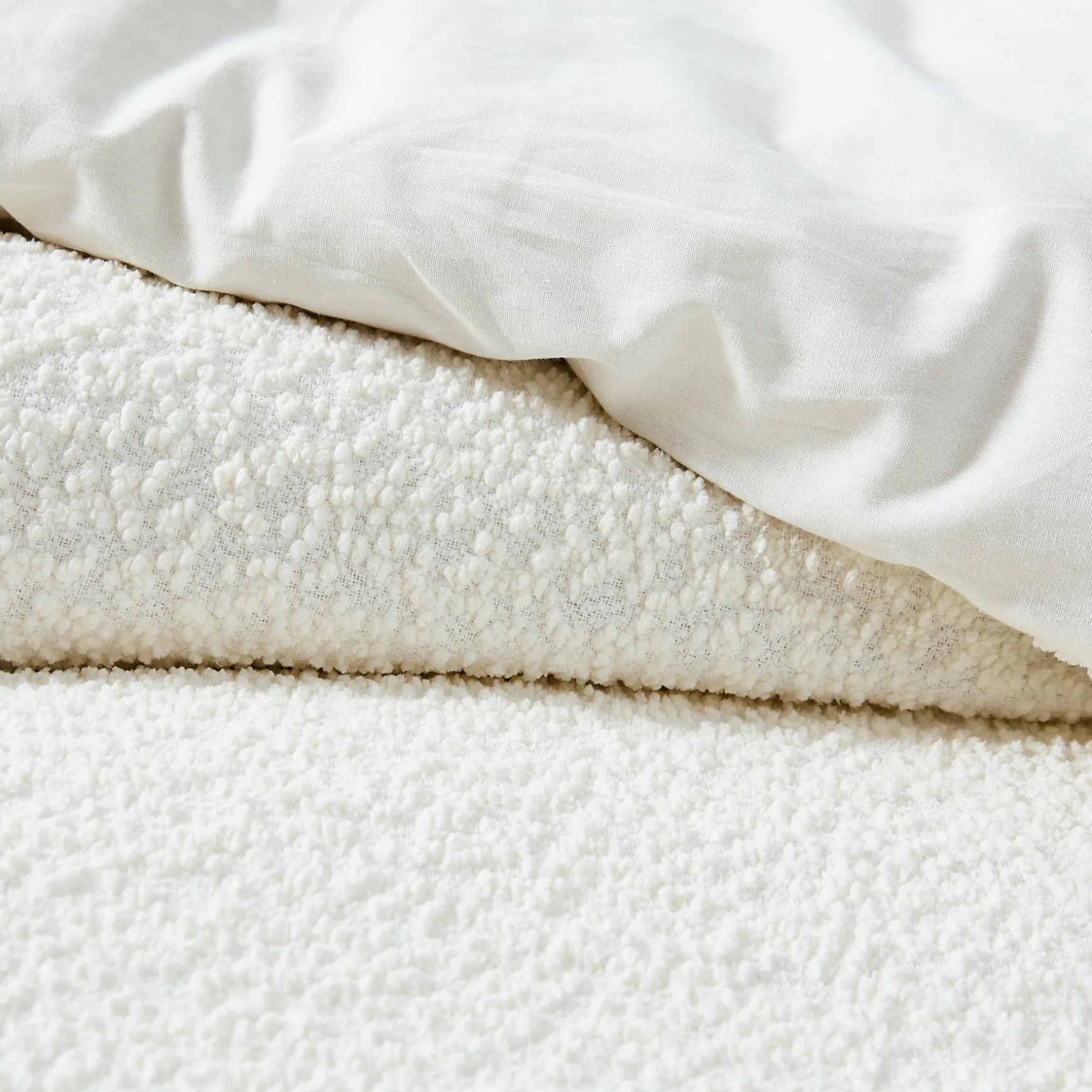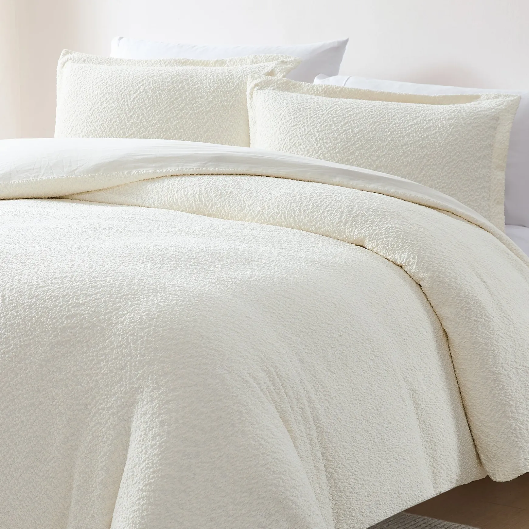 Drift into cloud-like comfort with this soft and cozy duvet cover set, that matches any decor style. The boucle fabric is made from a lightweight cotton blend front and cotton back. This 3 piece bedding set includes 1 duvet cover and 2 shams. Add your ideal insert weight for year-round comfort and easily secure it with button closures and corner ties. STANDARD 100 by OEKO-TEX® certified, all components have been tested and certified free from harmful substances. Machine washable for easy care.