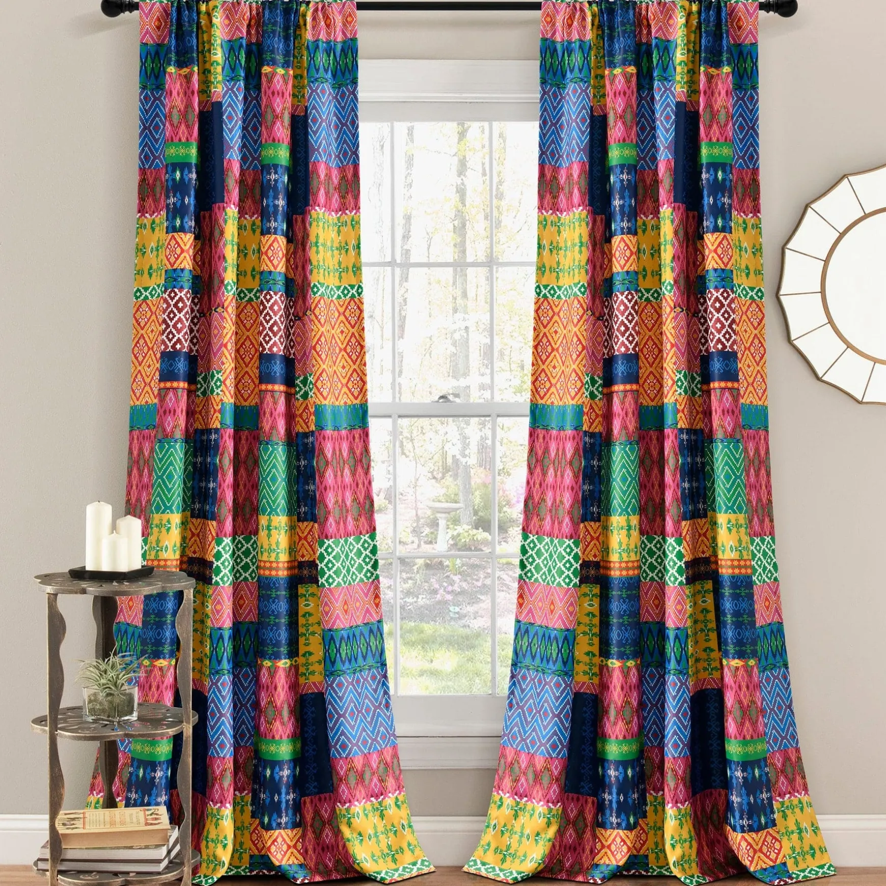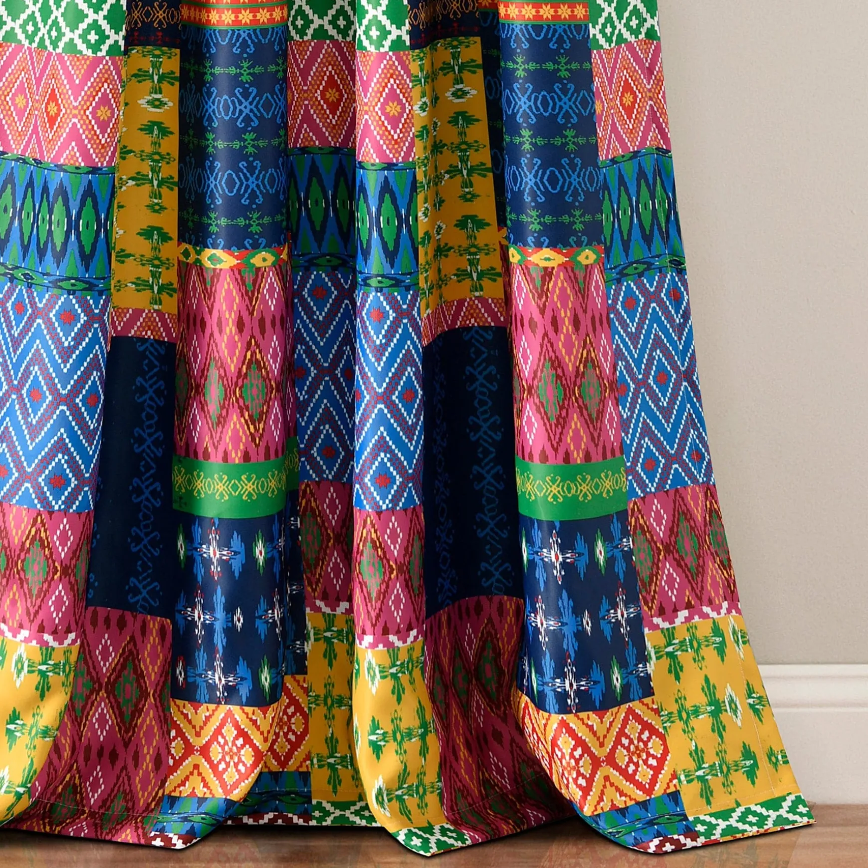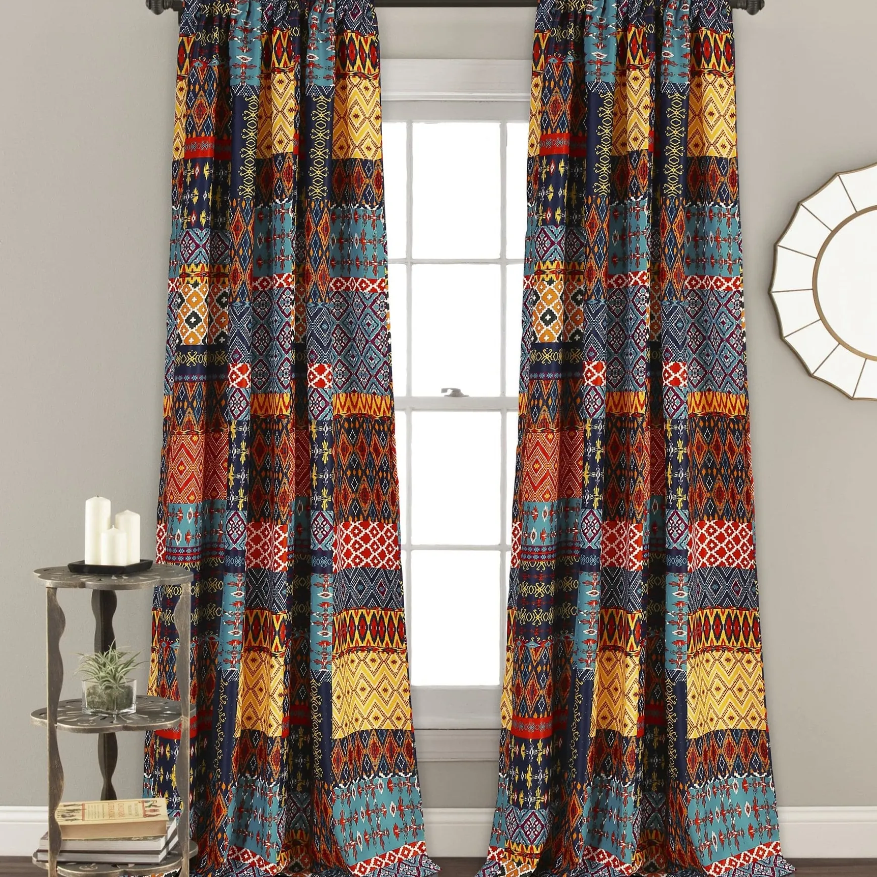 The Misha Light Filtering Window Curtain Set takes patchwork style to a whole new level. Bright and bold colors make these curtains a statement piece in any room. Each section of the patchwork includes a geometric pattern.