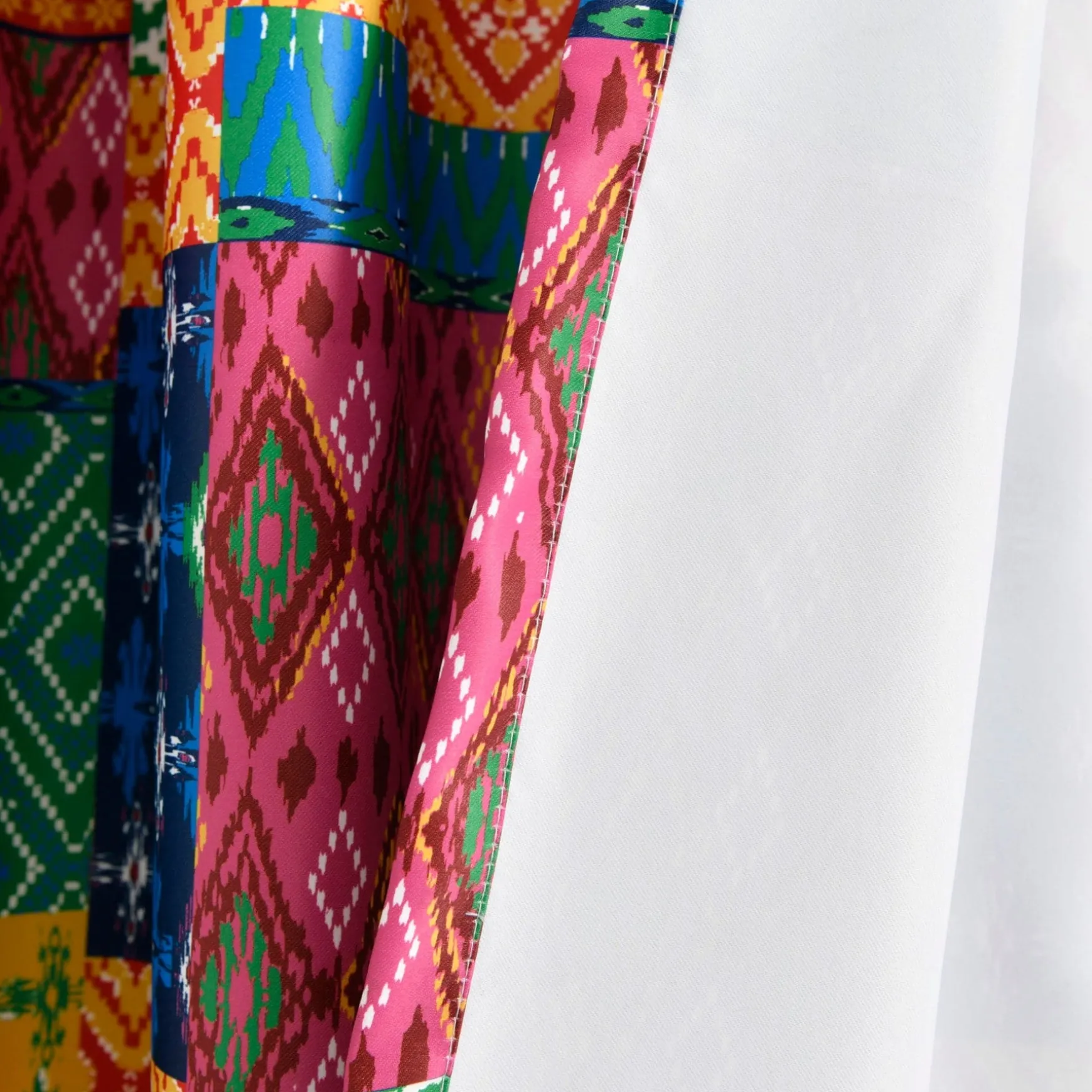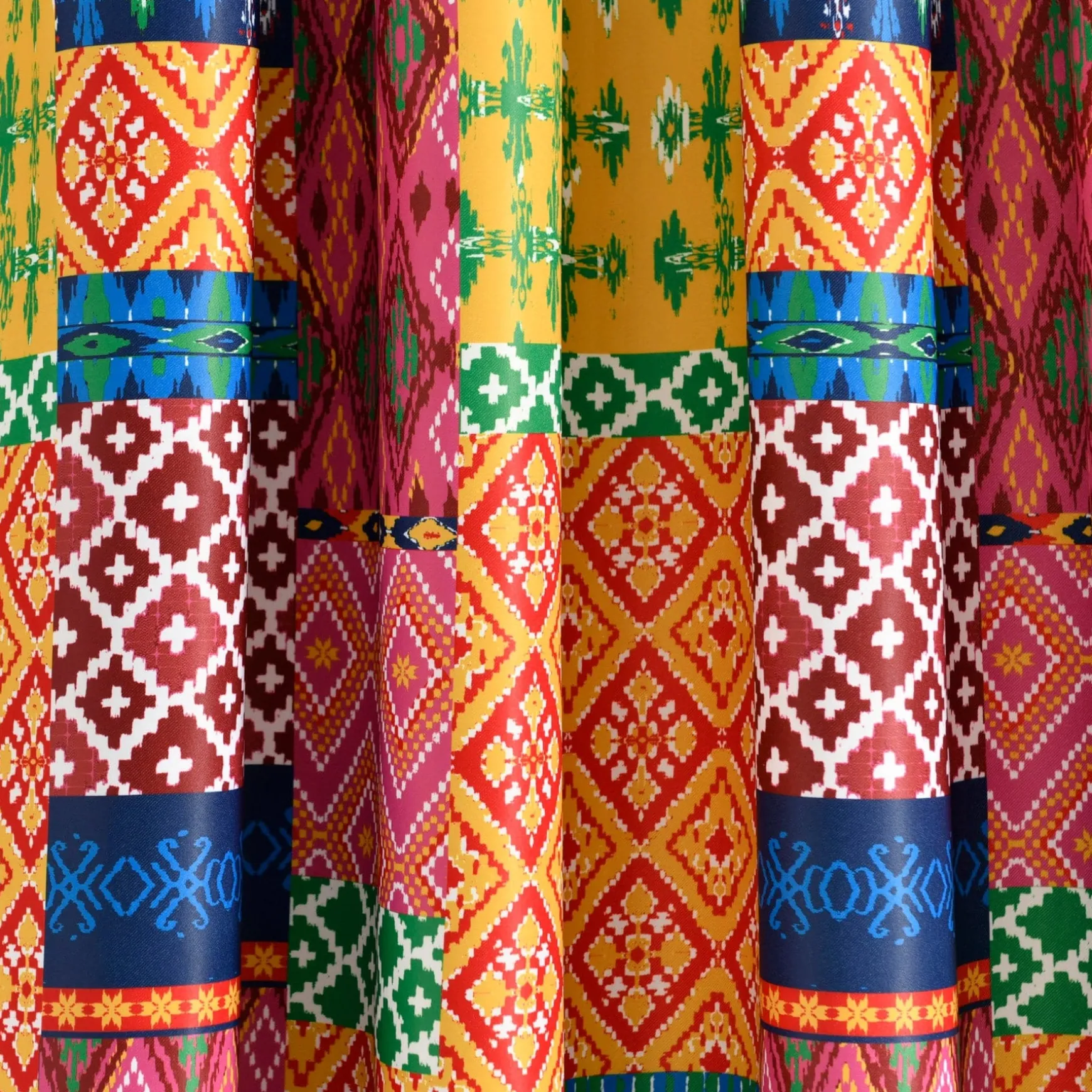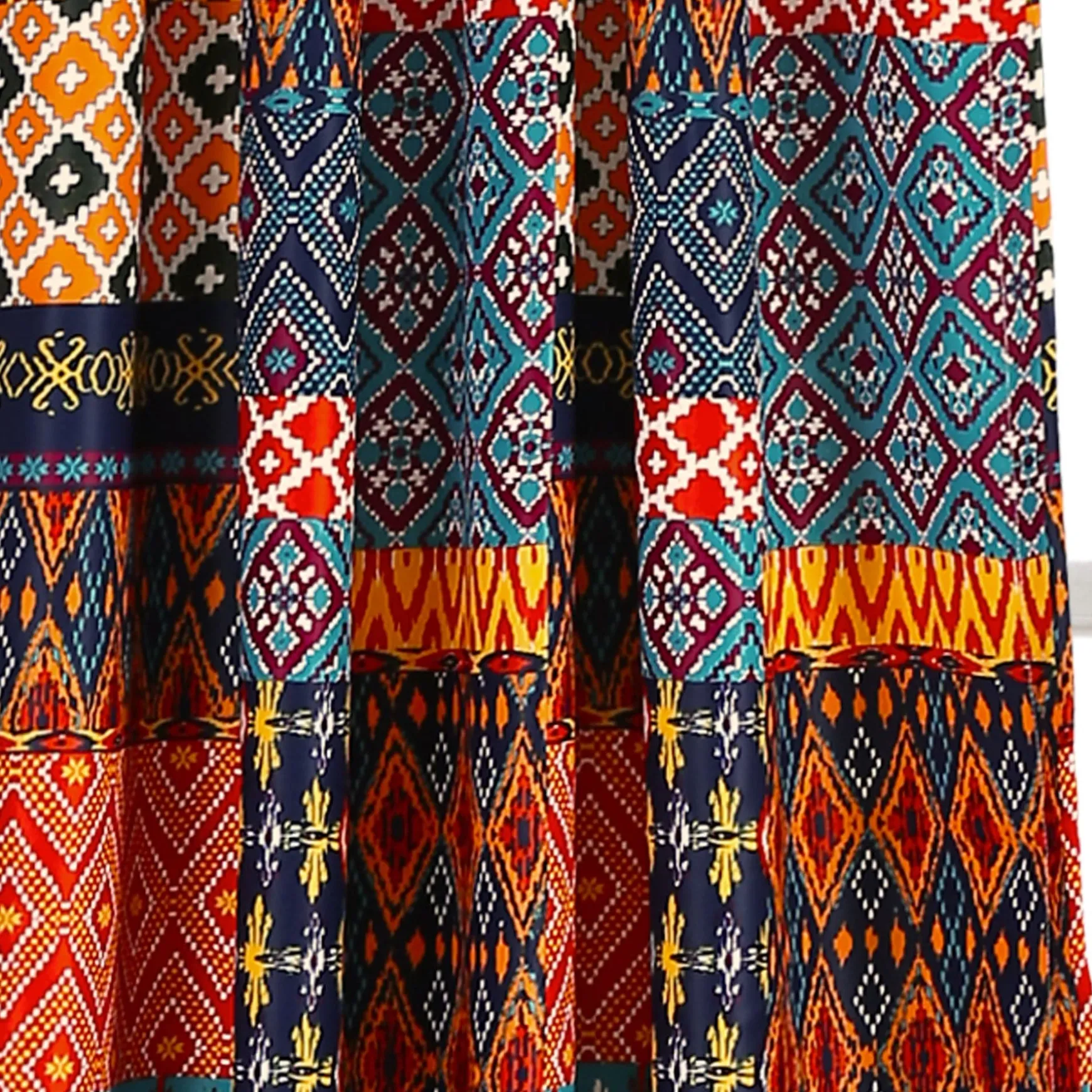 The Misha Light Filtering Window Curtain Set takes patchwork style to a whole new level. Bright and bold colors make these curtains a statement piece in any room. Each section of the patchwork includes a geometric pattern.