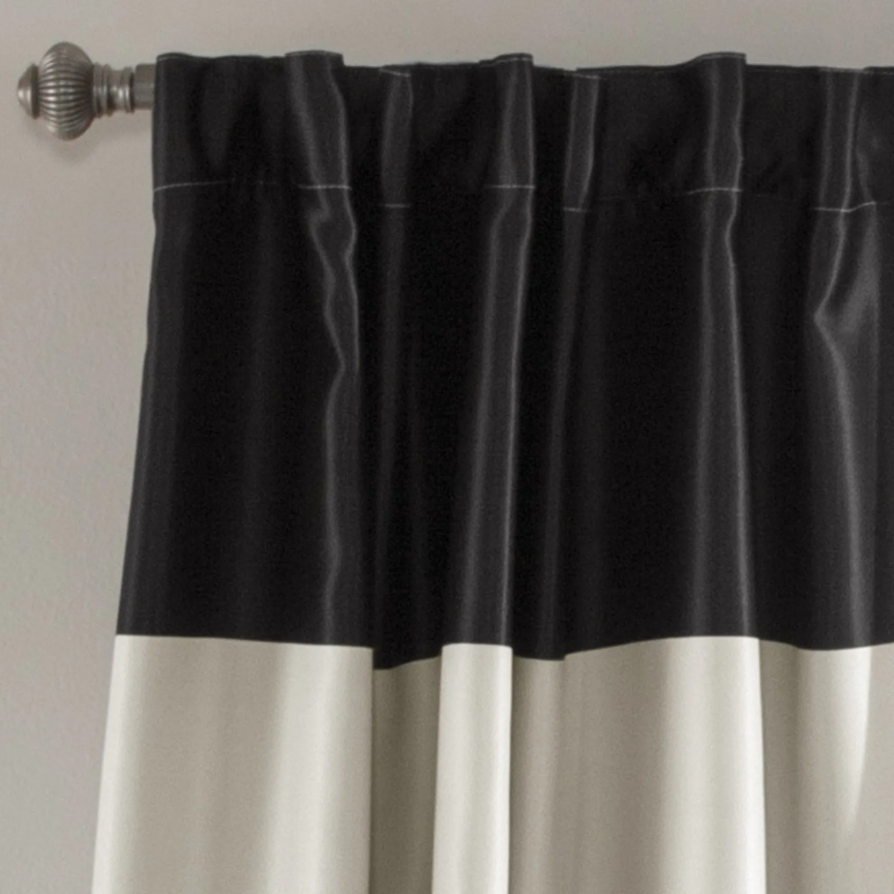 The Montego Stripe Light Filtering Window Curtain Set is sold by the pair. Each panel measures 84 inches long and 52 inches wide. They are currently only available in black. The lighter stripe is an off-white color with gray undertones. It is not pure white.