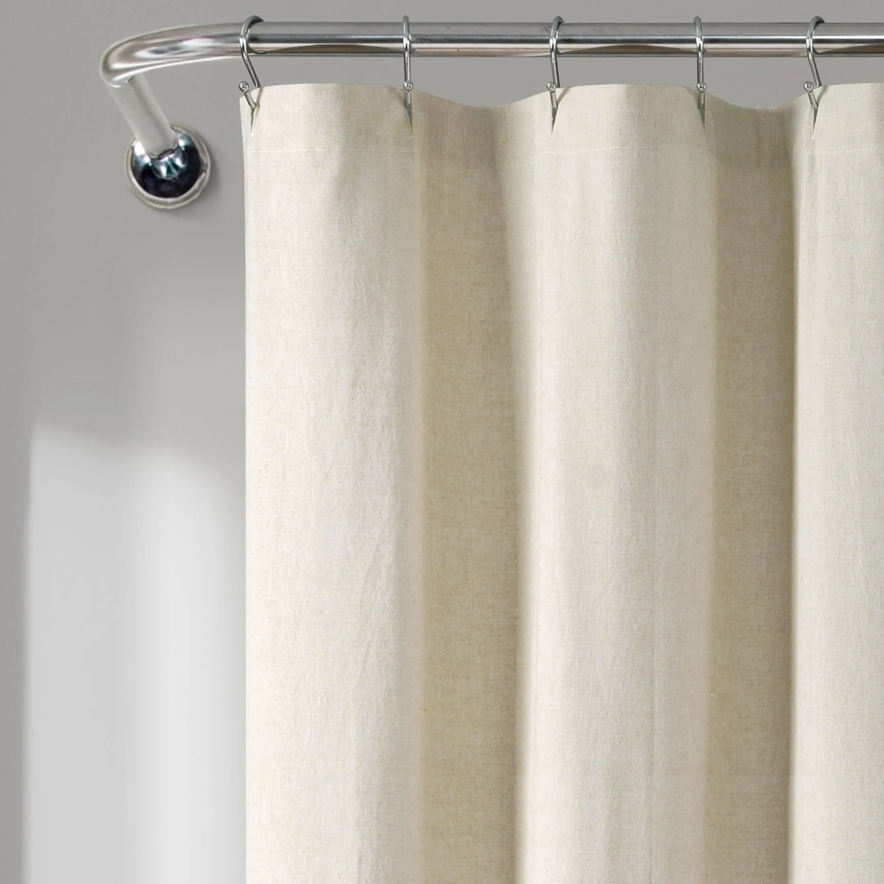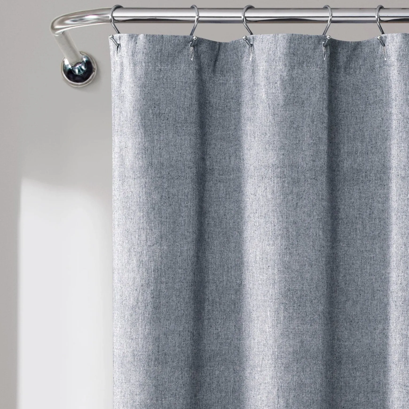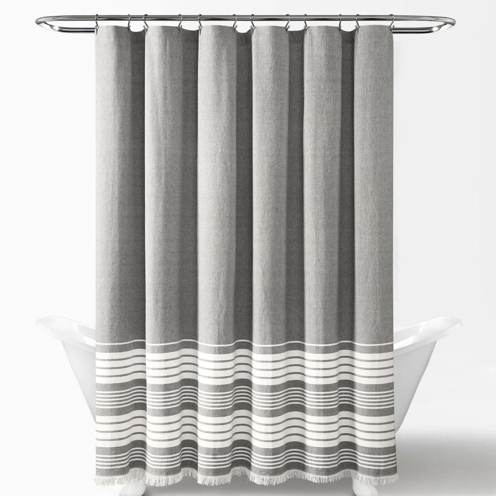 Measuring 71 inches wide and a total of 72.5 inches long (including the fringe tassel), the Nantucket Yarn Dyed Tassel Fringe Shower Curtain will fit most any bathtub and installs easily with standard shower curtain rings or hooks. The cotton fabric gives it an excellent hand feel.