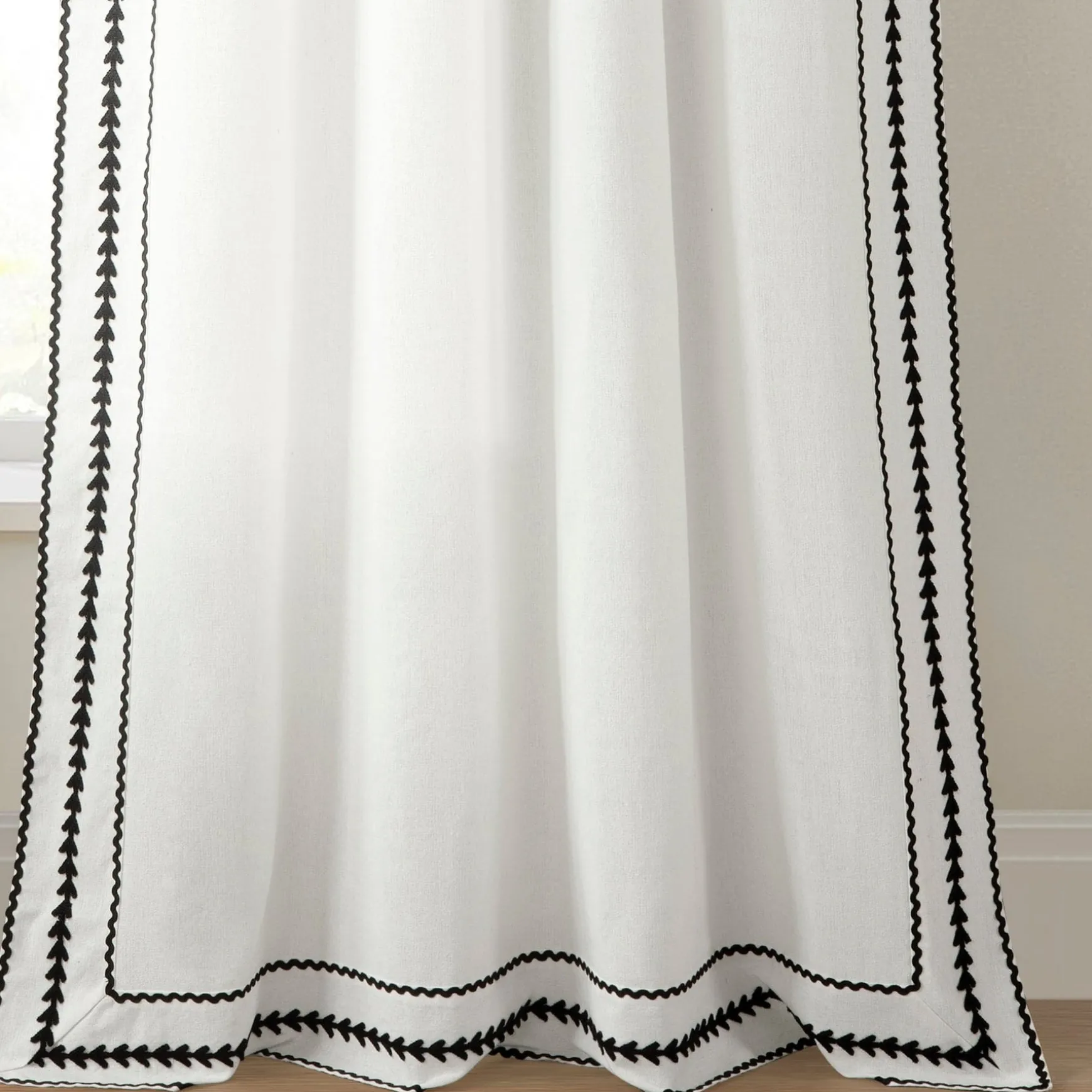 Keep your style simple and textured with this embroidered curtain panel. With an elegant touch from the detailed border, this Olivia Ric Rac Embroidery Border Window Curtain Panel can be styled in any space to accent your welcoming look.