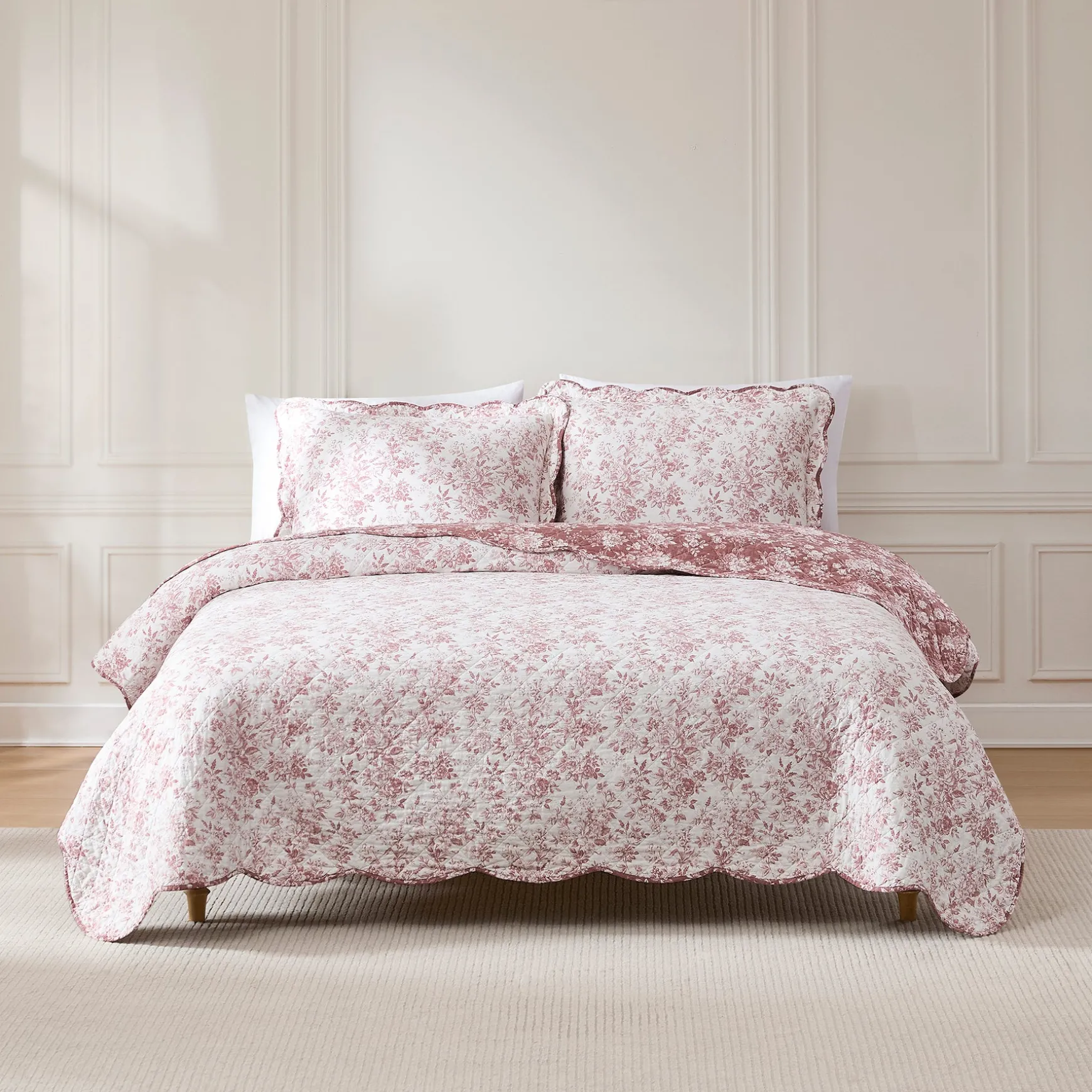 Layer your bed with the prettiest peonies. Blushing flowers and scalloped edges create this charming floral quilt. This fully reversible set offers 2 beautiful color options, great for vintage or coquette decor styles. Crafted from 100% prewashed cotton with a lightweight polyfill, for ultimate softness. This 3 piece bedding set includes 1 quilt and 2 shams. STANDARD 100 by OEKO-TEX® certified, all components have been tested and certified free from harmful substances. Machine washable.