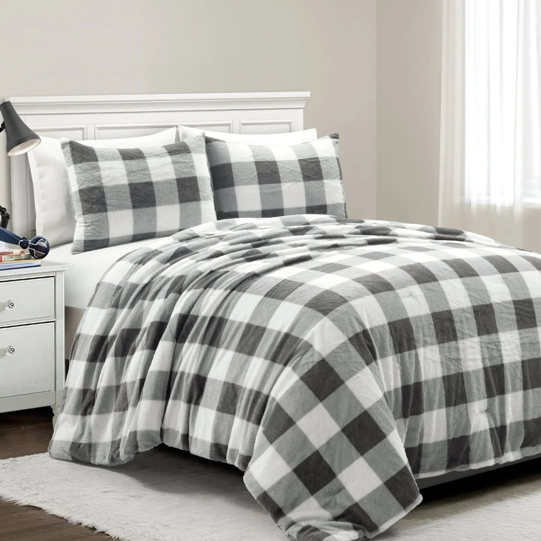 Perfect for a farmhouse style, this Plaid Ultra Soft Faux Fur All Season Comforter Set can easily be layered for your taste. Both the comforter and the shams are made with a solid color reverse so you may switch up the look of your space simply by flipping the set over.