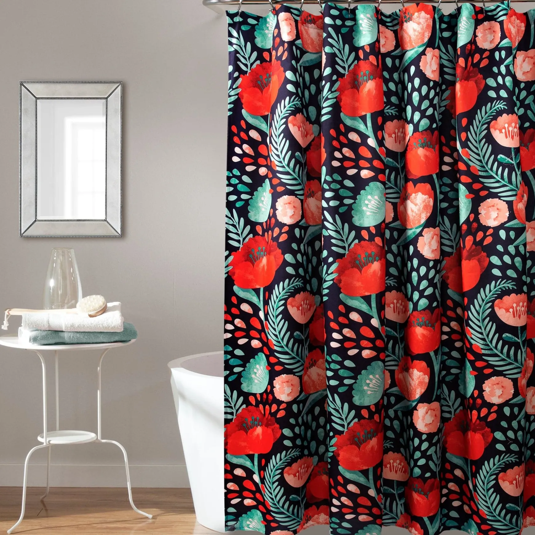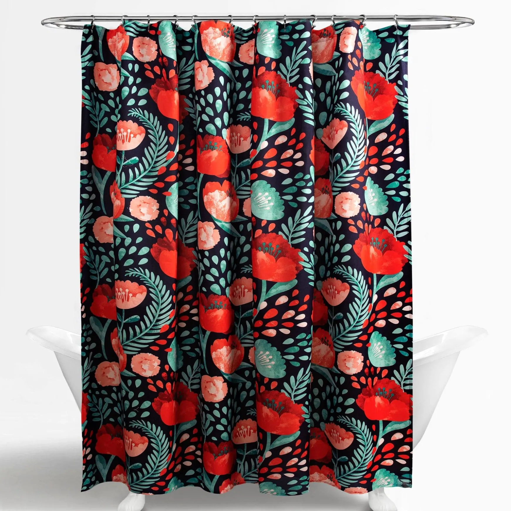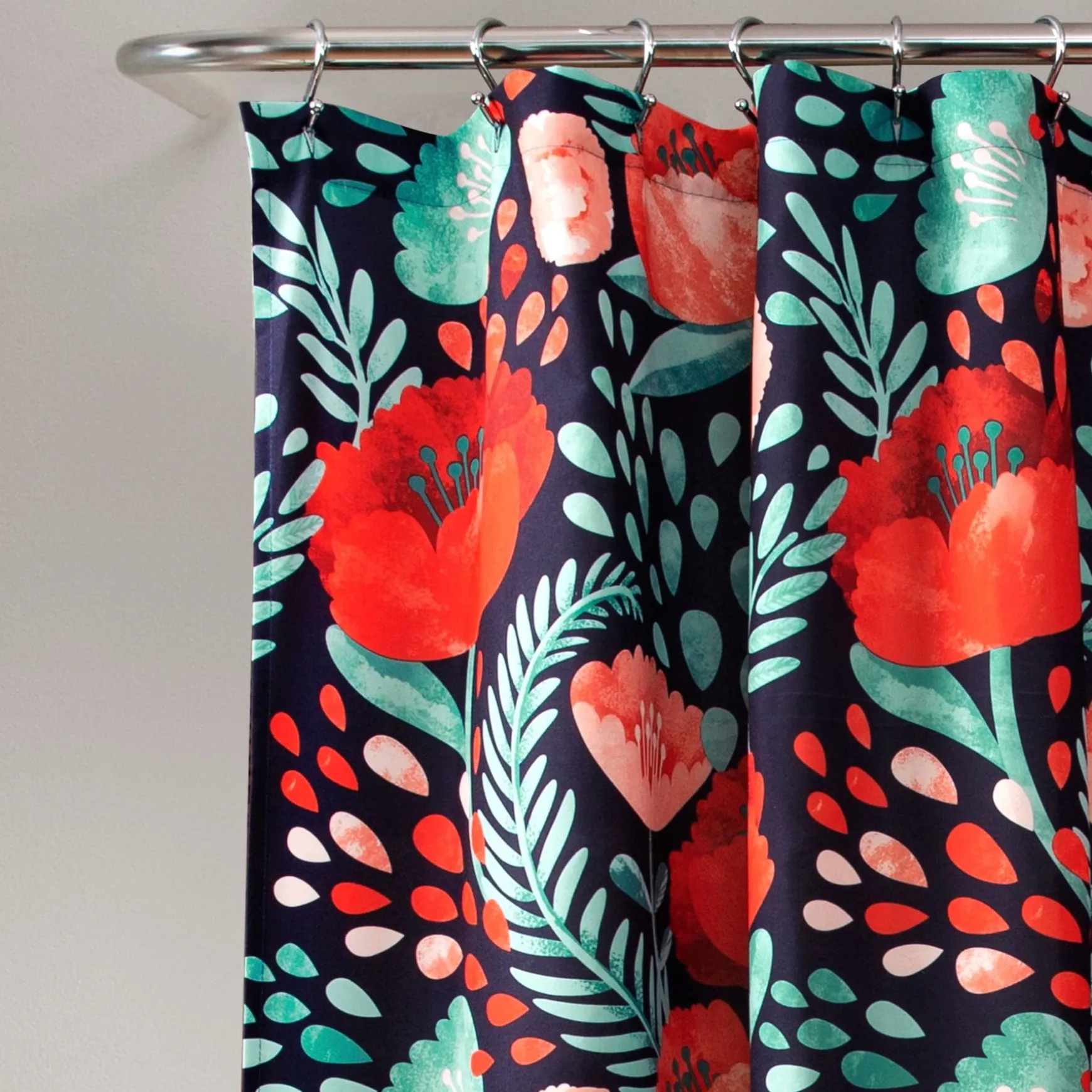 The Poppy Garden Shower Curtain is available in multiple colors to make it easy to match with your existing bathroom decor.