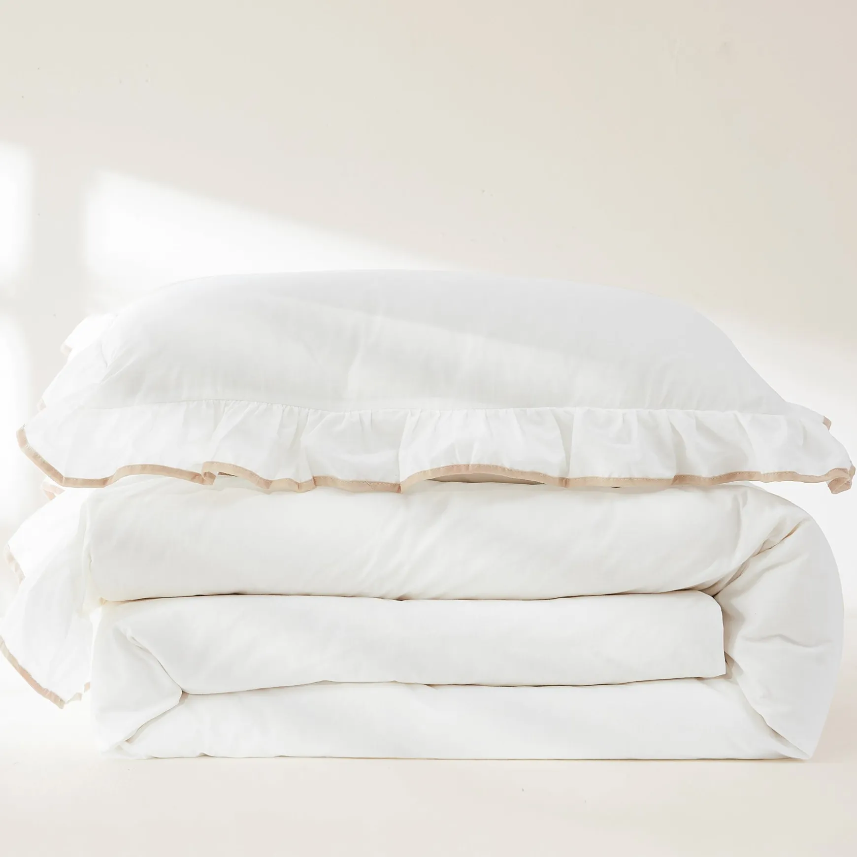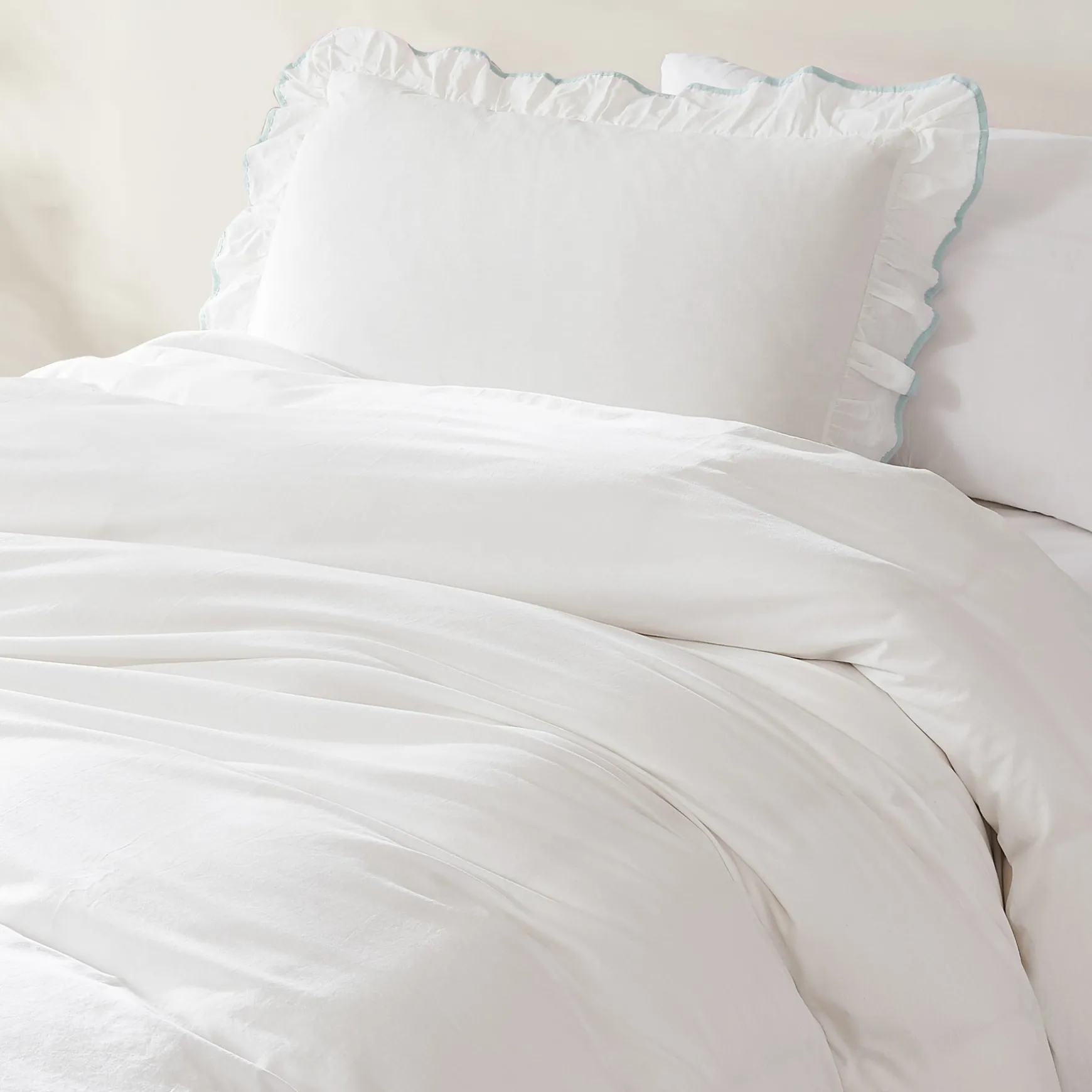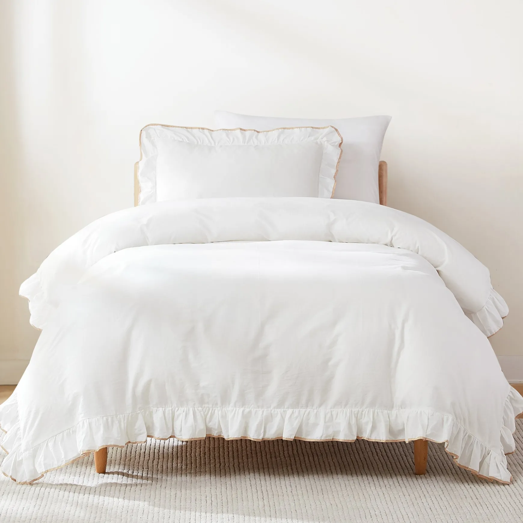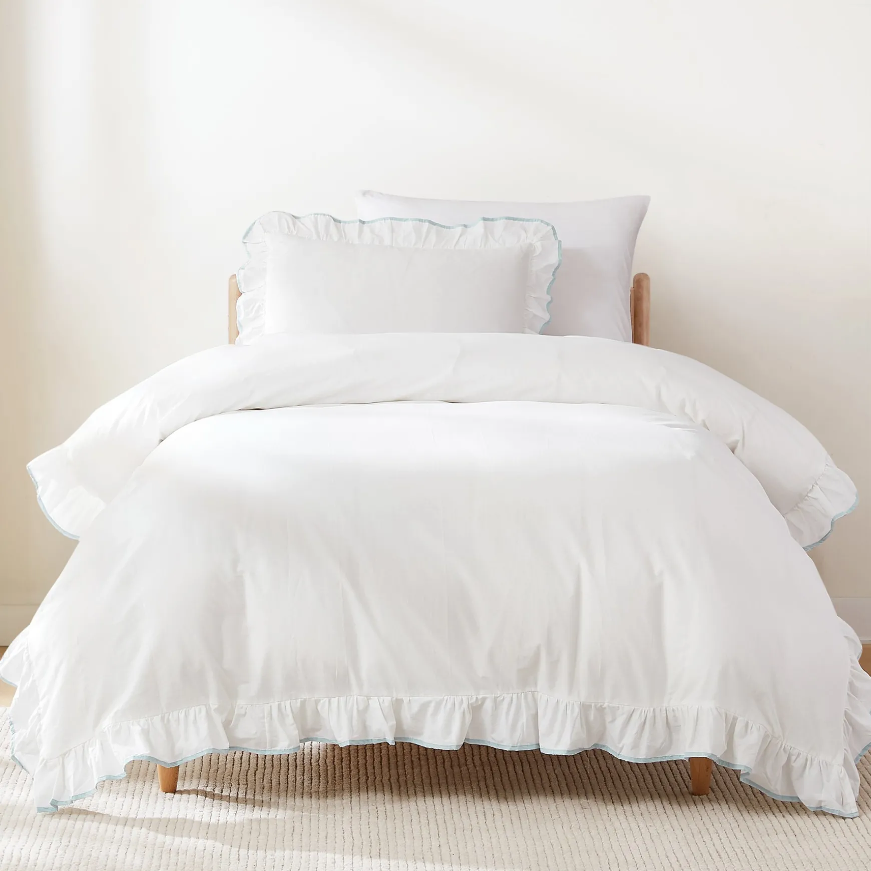 Add a frilly feminine touch to your bedroom with our Reyna Contrast Edge Cotton Duvet Cover Set. This chic bedding set features a charming ruffle trim with a pop of color on the edge, creating a beautiful outlined look.