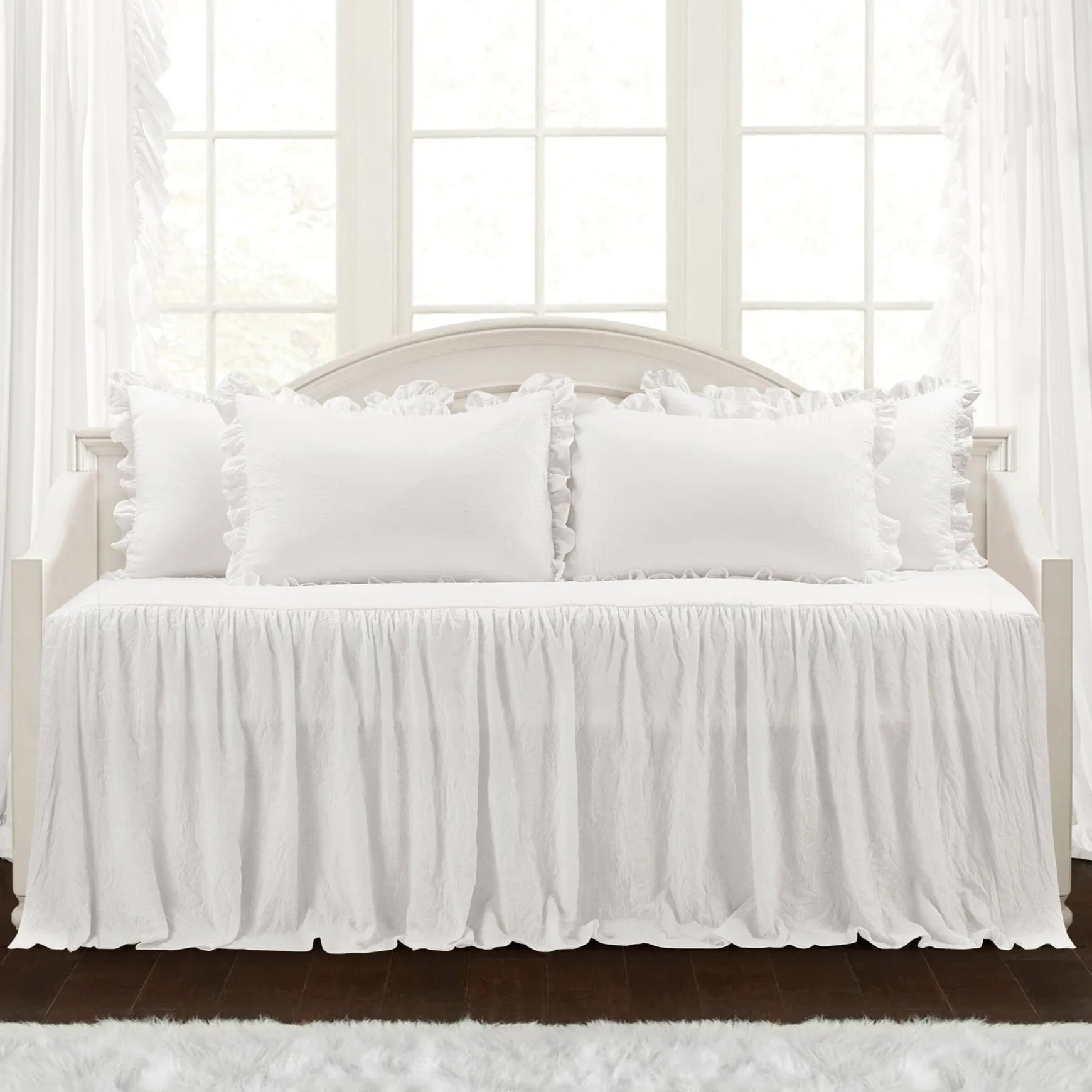 Complement your charming bedroom style and dress your daybed in this soft Ruffle Skirt Daybed Cover 5 Piece Set. This lovely decorative daybed cover set features a farmhouse styled daybed cover with a cascading ruffle look and four matching pillow shams, each with ruffled trim.