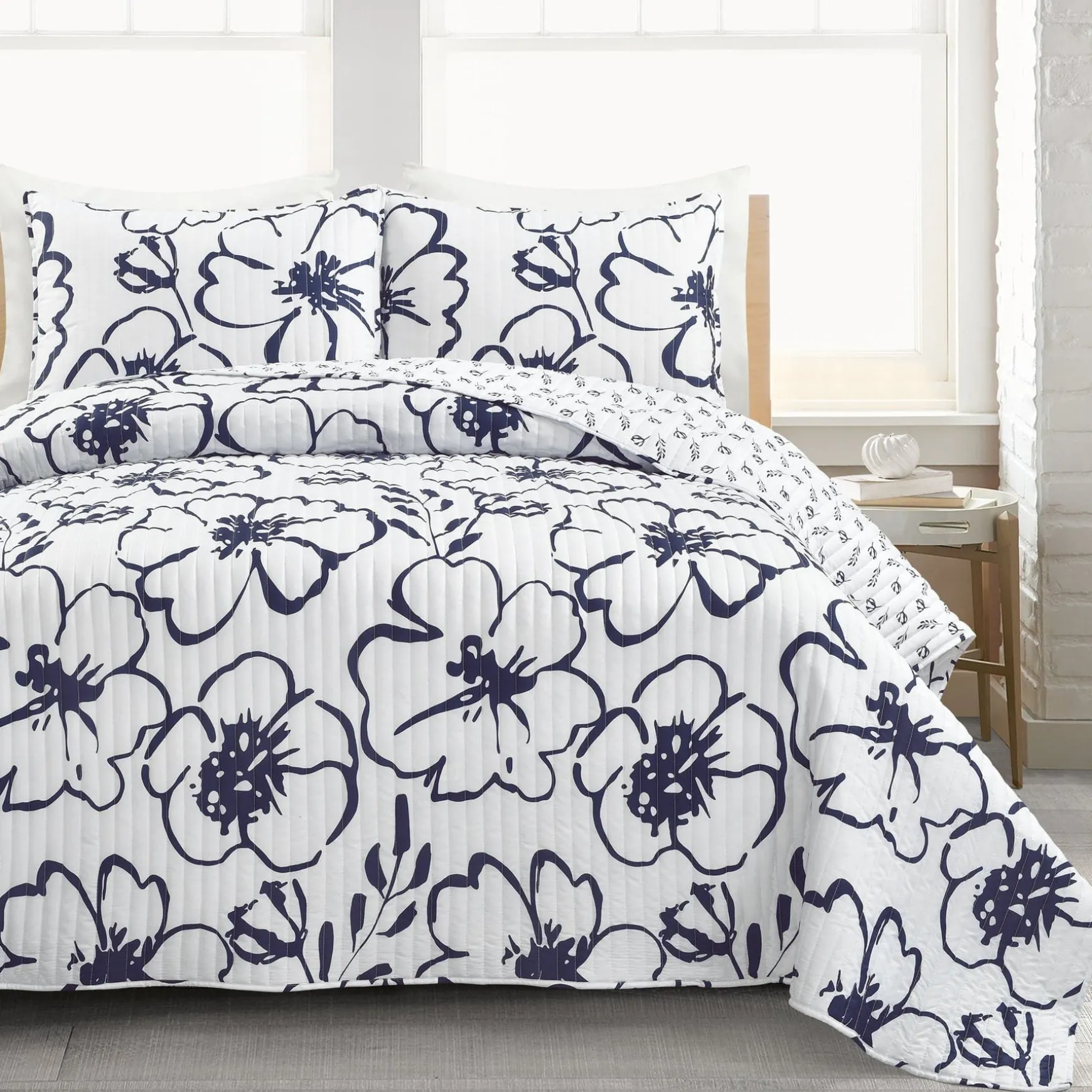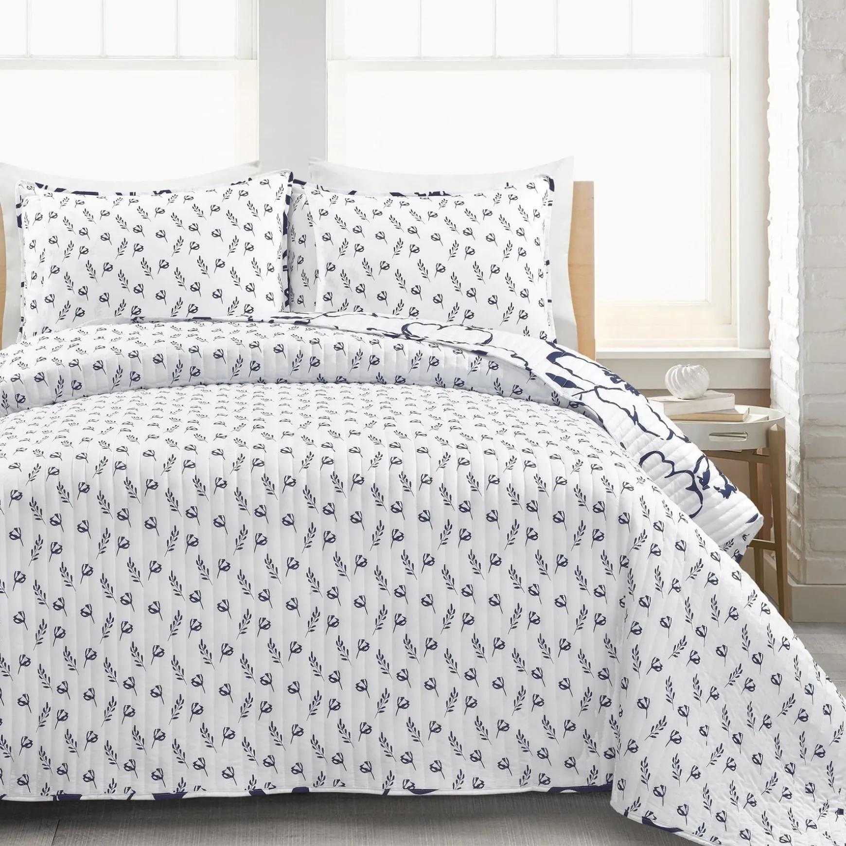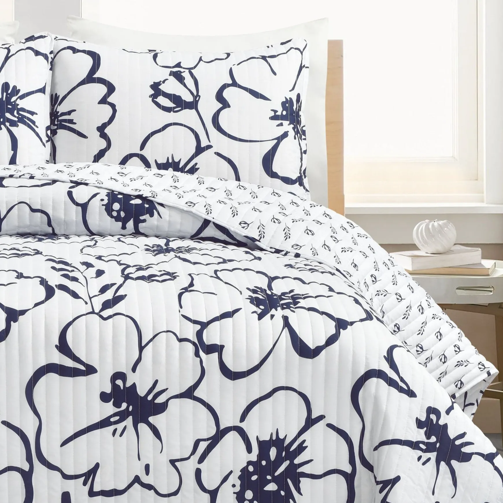This Scandinavian Floral Quilt 3 Piece Set includes a soft reversible quilt and two matching pillow shams, which are also reversible. It is available in your choice of King or Full/Queen size in either navy or black.