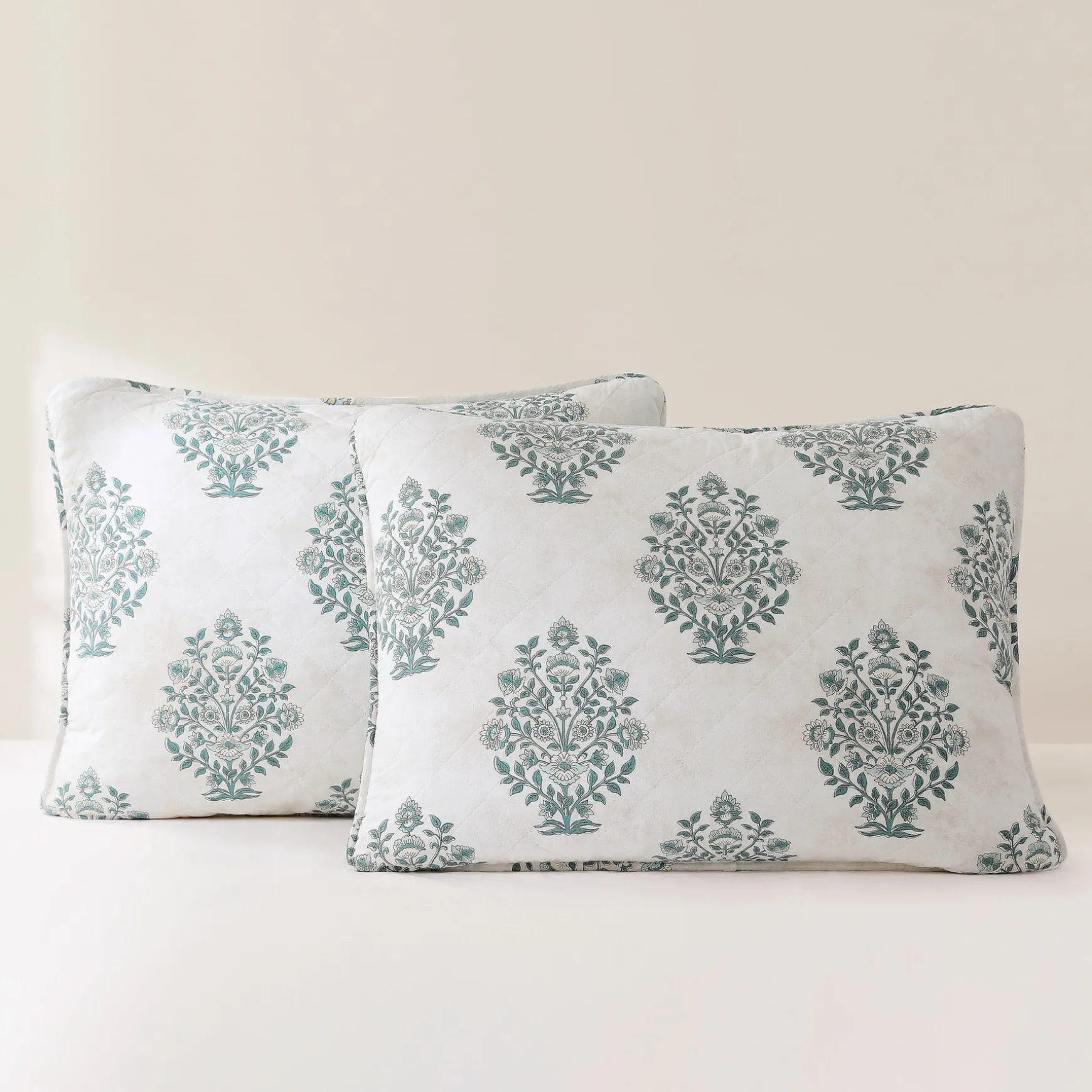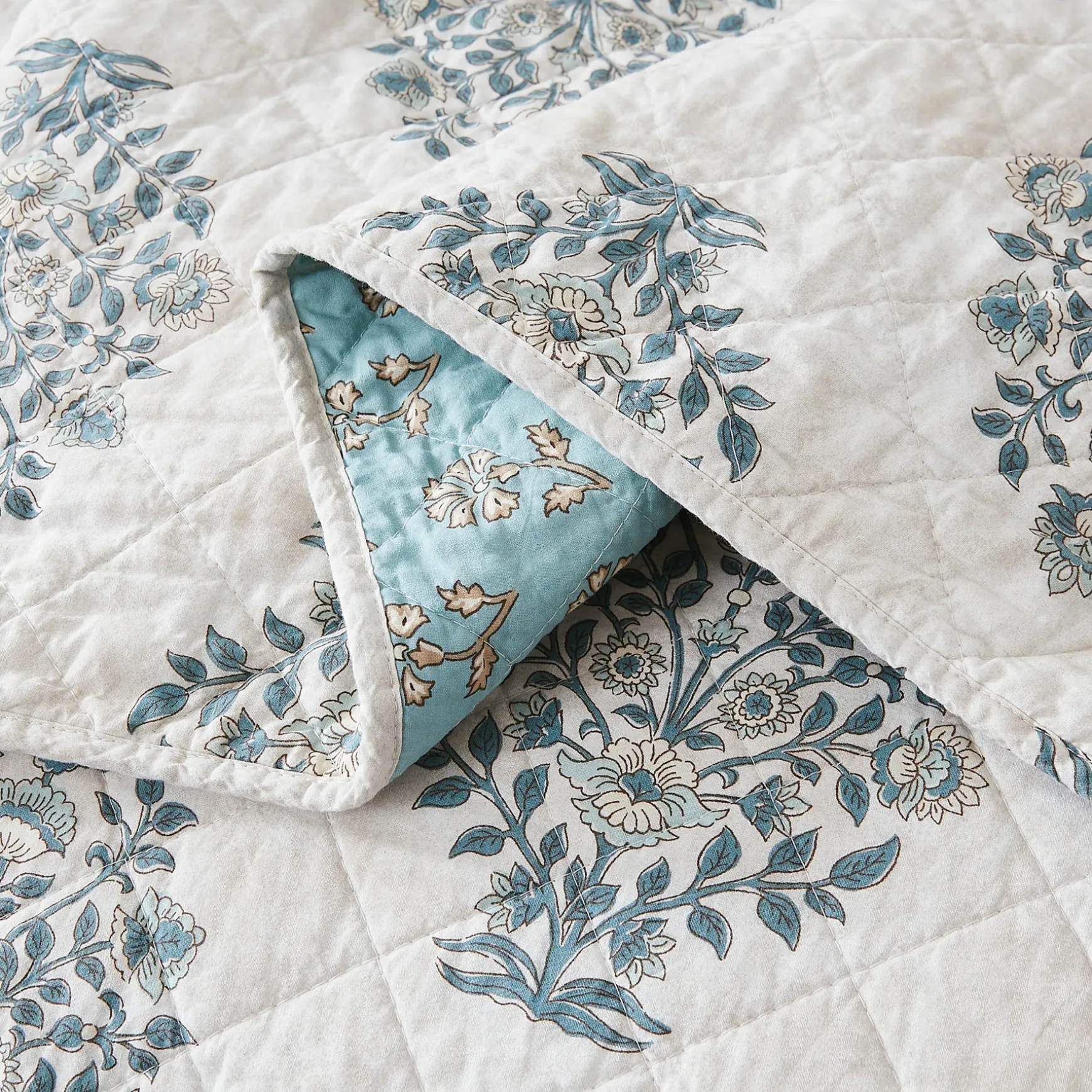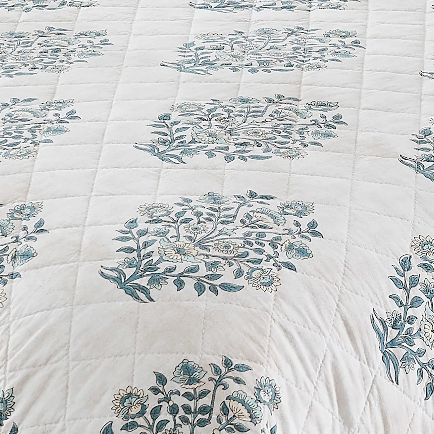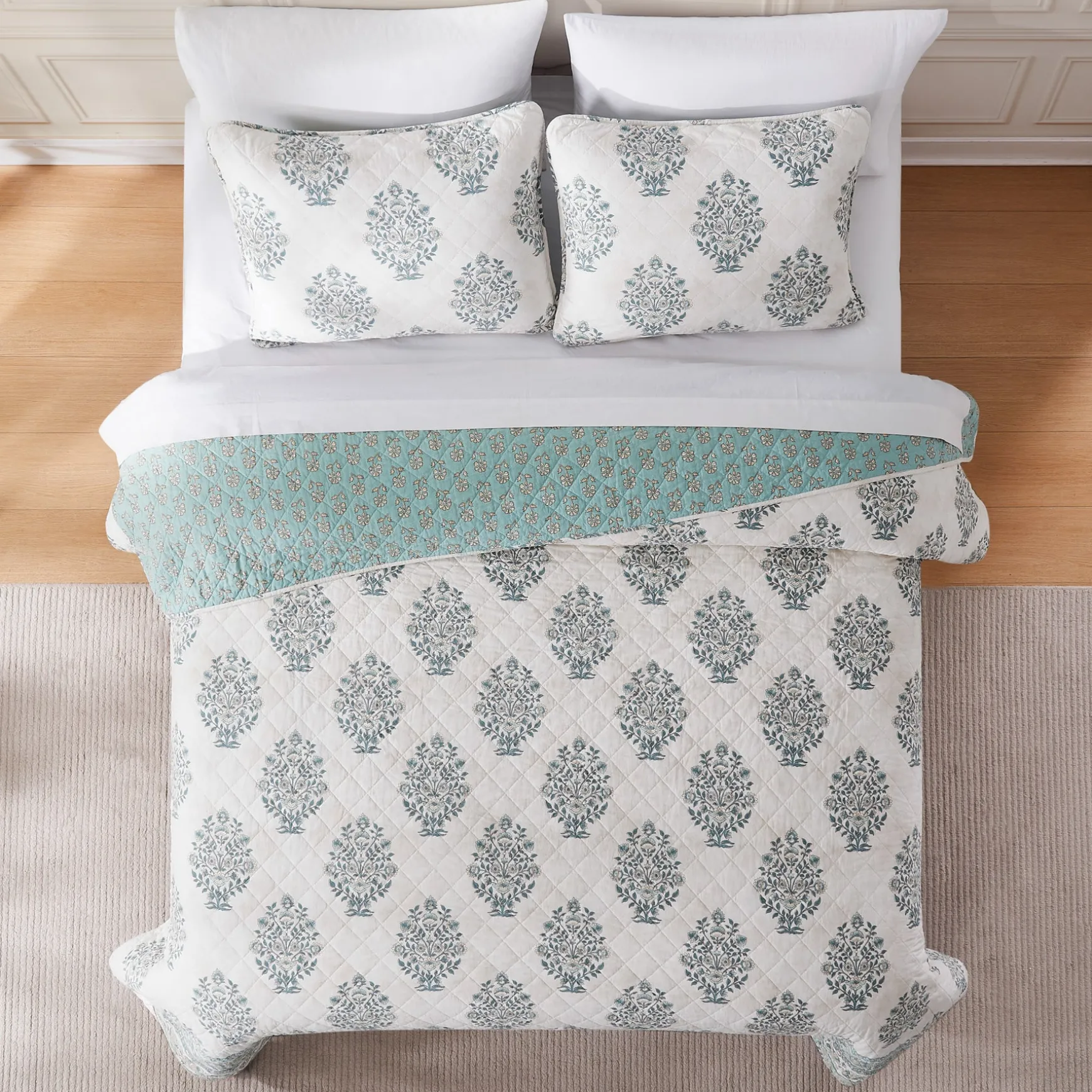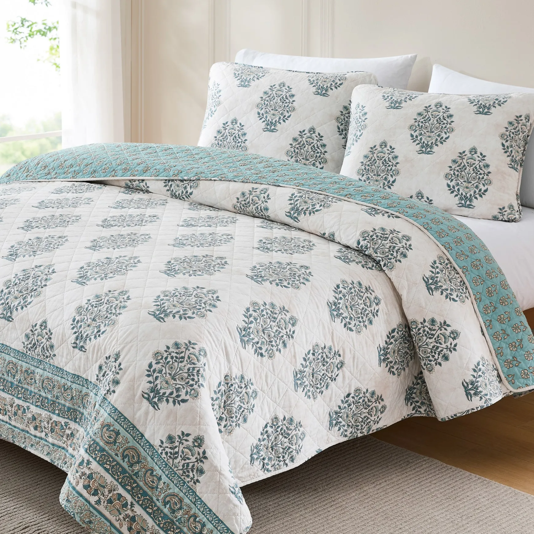 Add timeless charm to your bed with this block print quilt set. Adorned with flower bouquets and block prints, this floral bedding effortlessly blends boho and vintage styles. This fully reversible set offers 2 unique looks. Crafted from 100% prewashed cotton with a lightweight cotton blend filling for ultimate comfort. This 3 piece set includes 1 quilt and 2 shams. STANDARD 100 by OEKO-TEX® certified, all components have been tested and certified free from harmful substances. Machine washable.