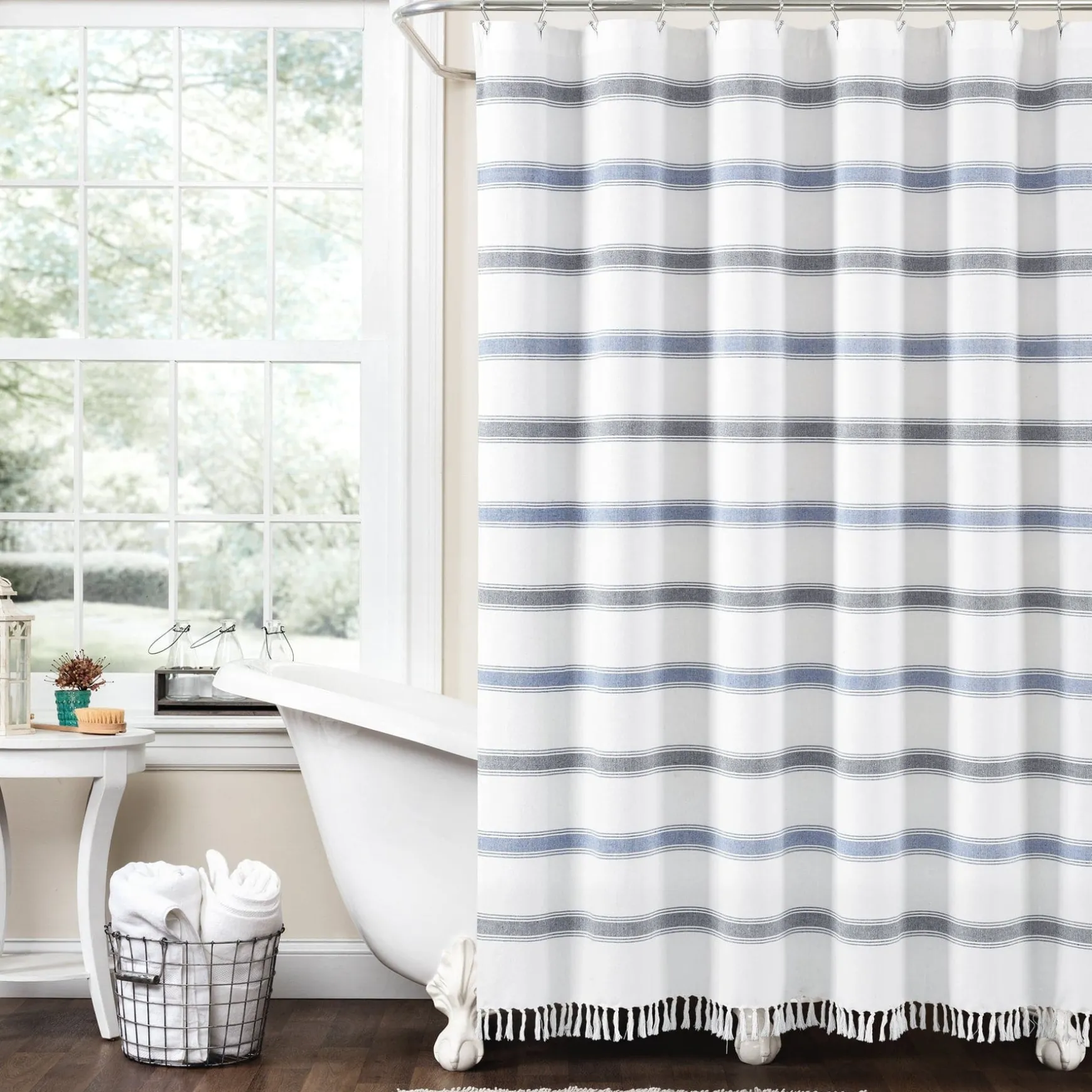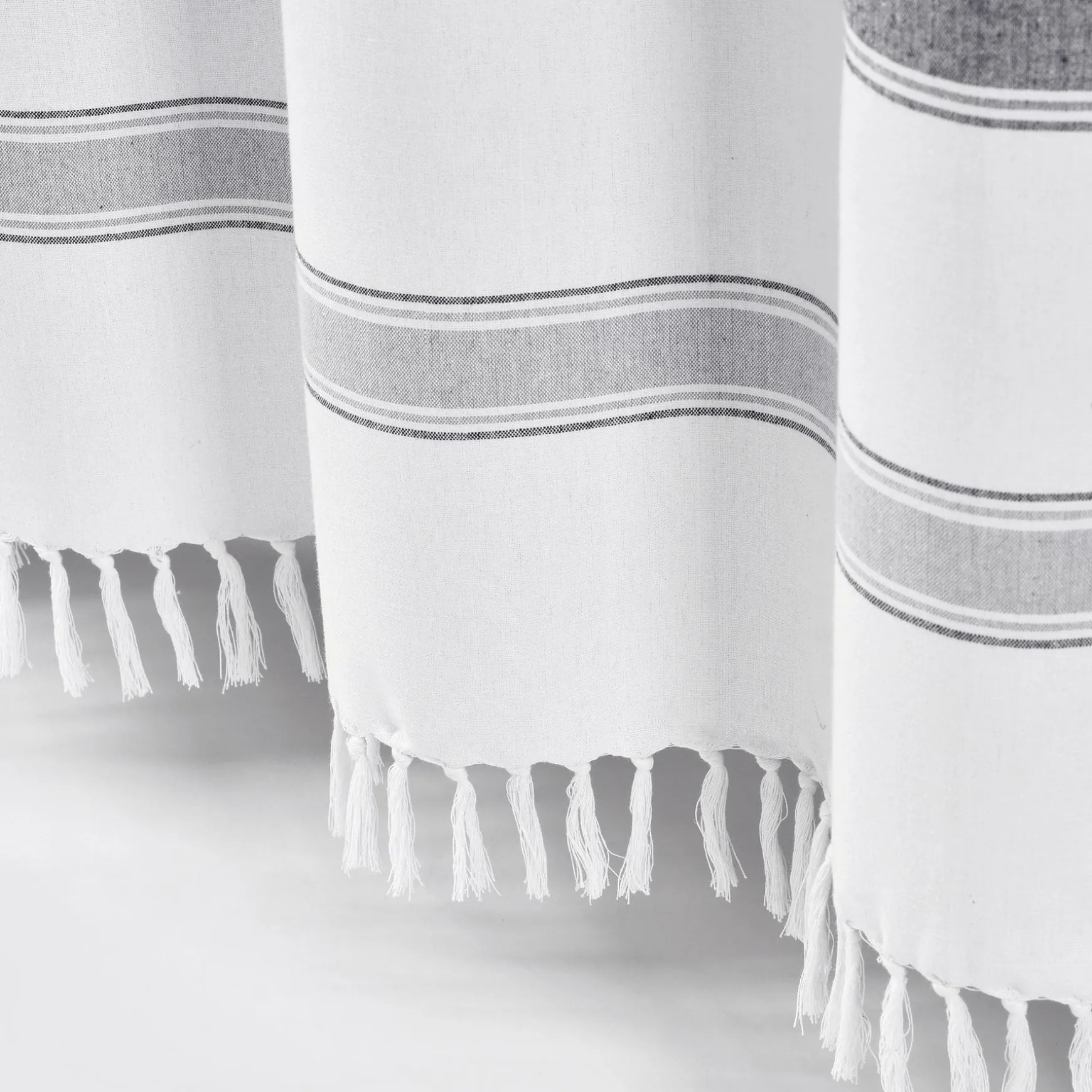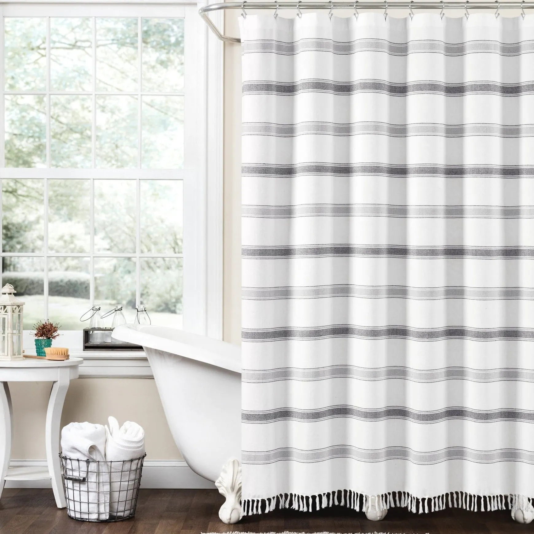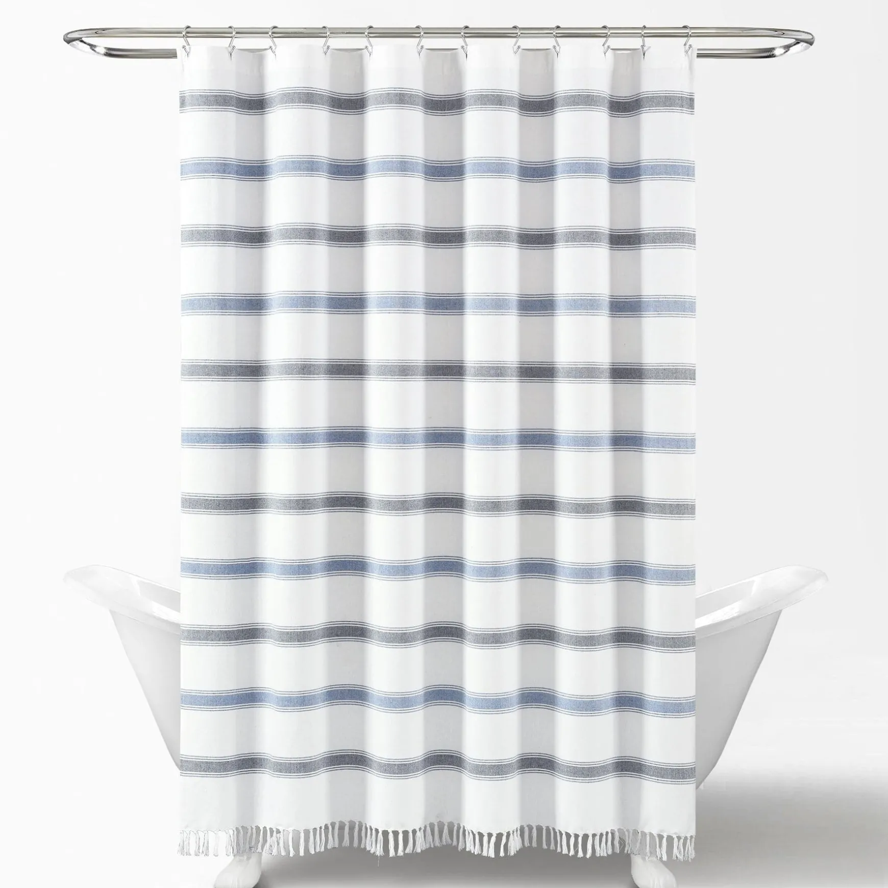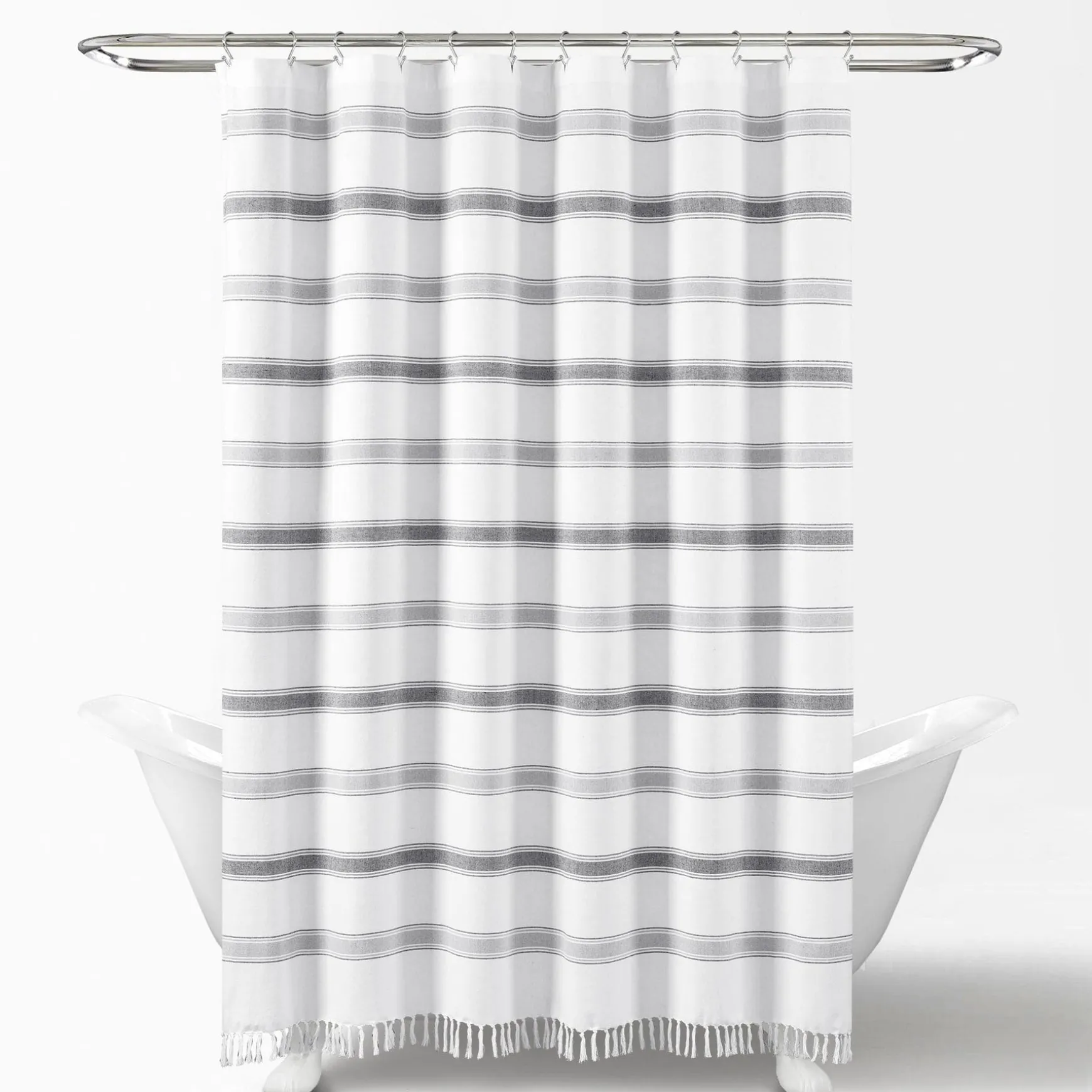 This Stripe Woven Textured Yarn Dyed Recycled Cotton Shower Curtain made with eco-friendly recycled cotton features a classic stripe design and fits in almost any bathroom setting. The tassel fringe detailing adds a stylish, unique charm to accent the traditional horizontal stripes.