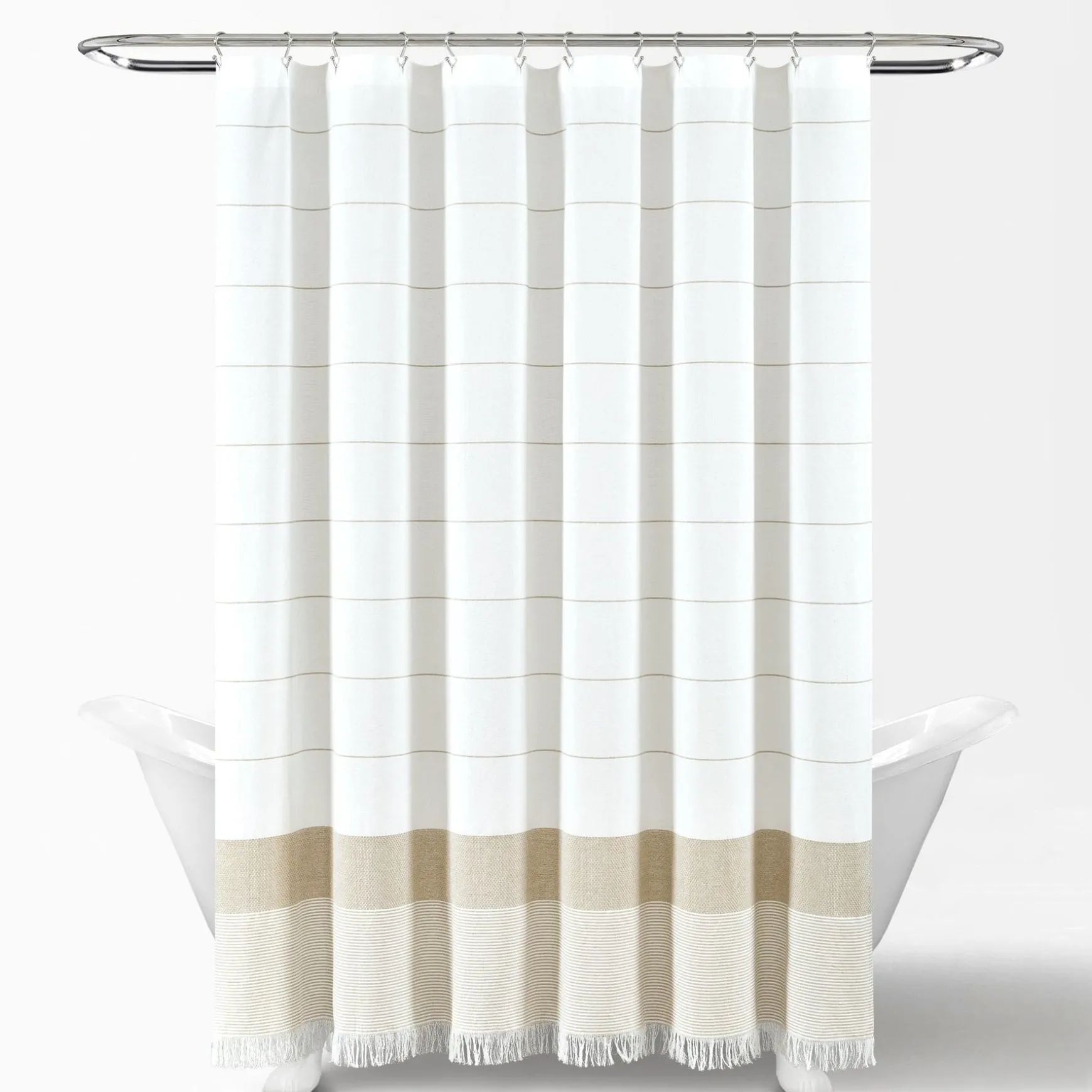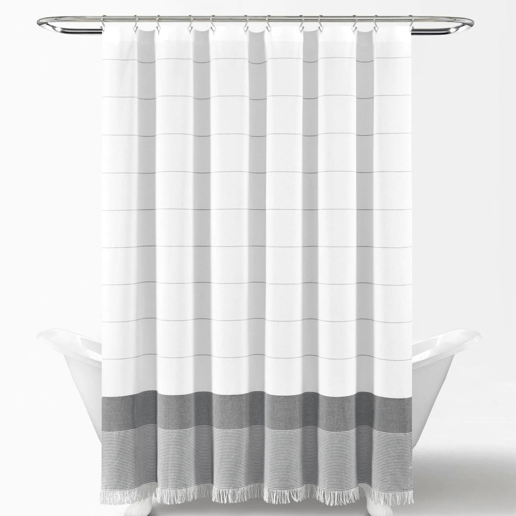 Measuring 72 inches wide and 72 inches long with an additional 2-inch fringe, our Stripe Yarn Dyed Tassel Fringe Woven Cotton Shower Curtain will fit most standard bathtubs. It installs easily with any shower curtain rings or hooks.