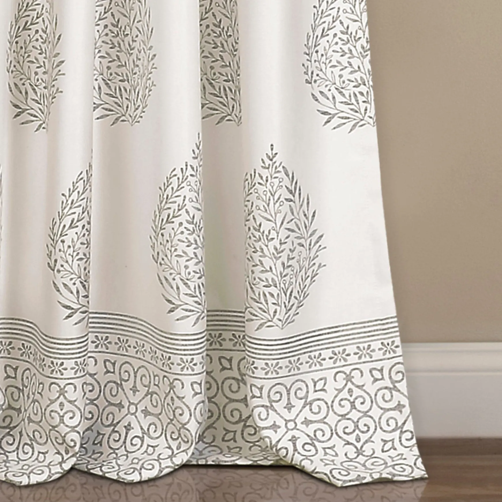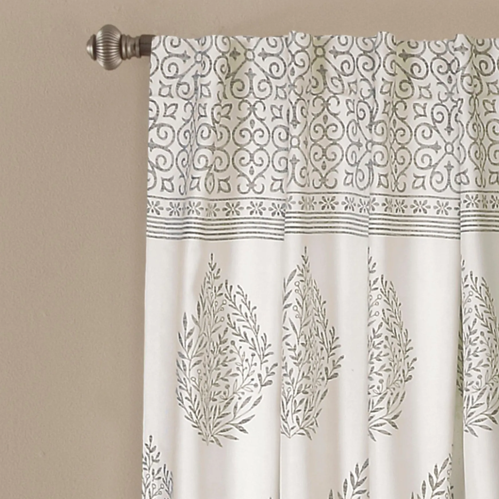 This Teardrop Leaf Light Filtering Window Curtain Panel Set features a pattern of teardrop shaped leaves between two horizontal stripes of geometric shapes. The unique pattern of these panels would look great in any room in your home.