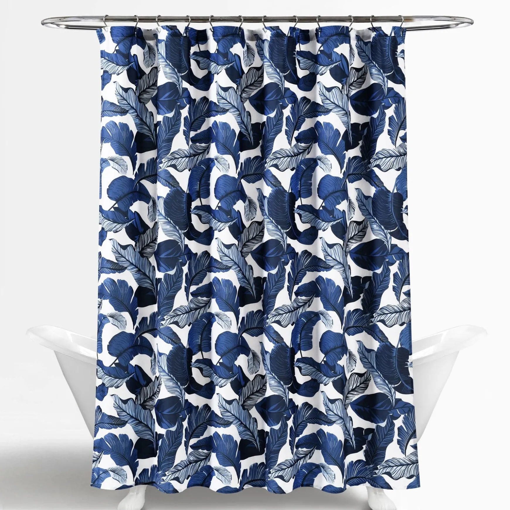 The Tropical Paradise Shower Curtain measures 72 inches long by 72 inches wide. It will fit nicely around just about any standard bathtub. It will hang easily with any standard shower curtain hooks or rings.