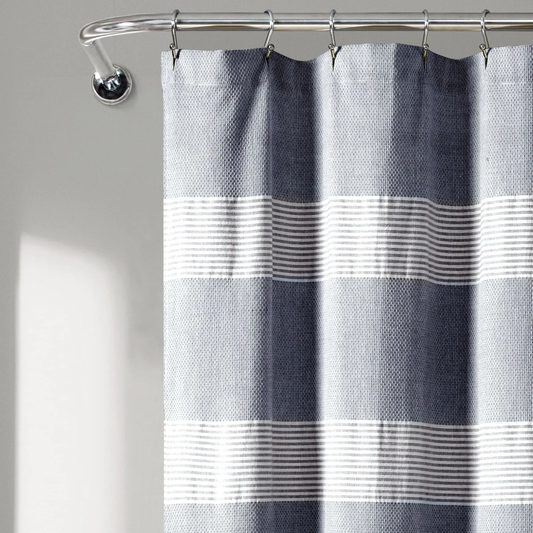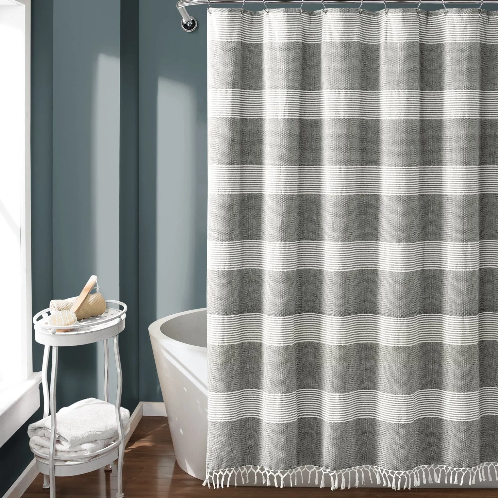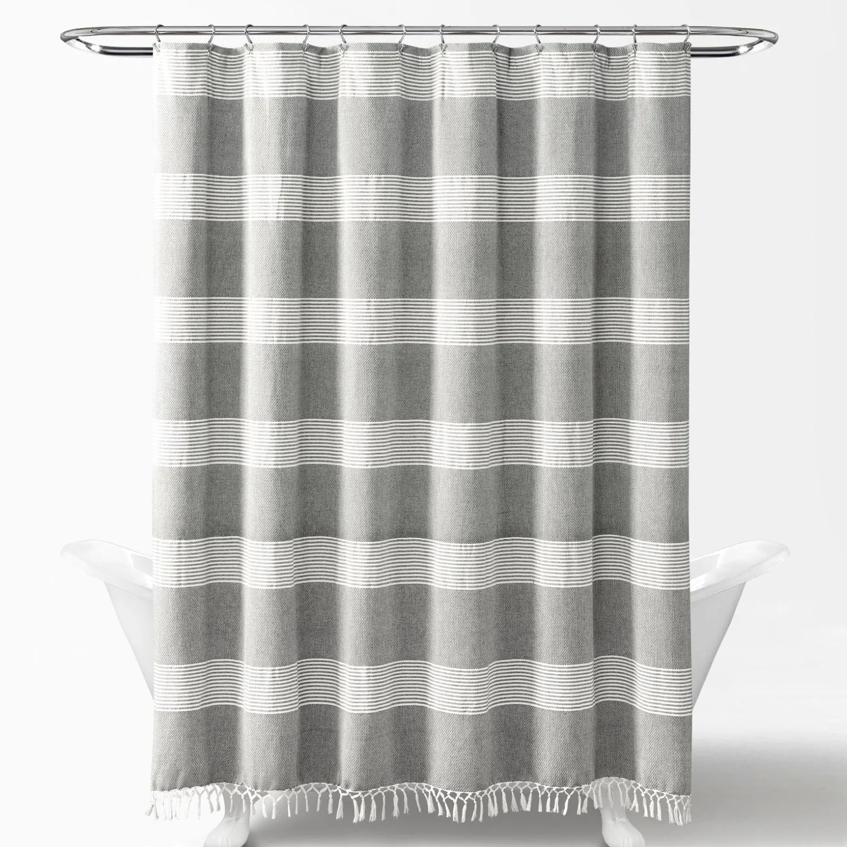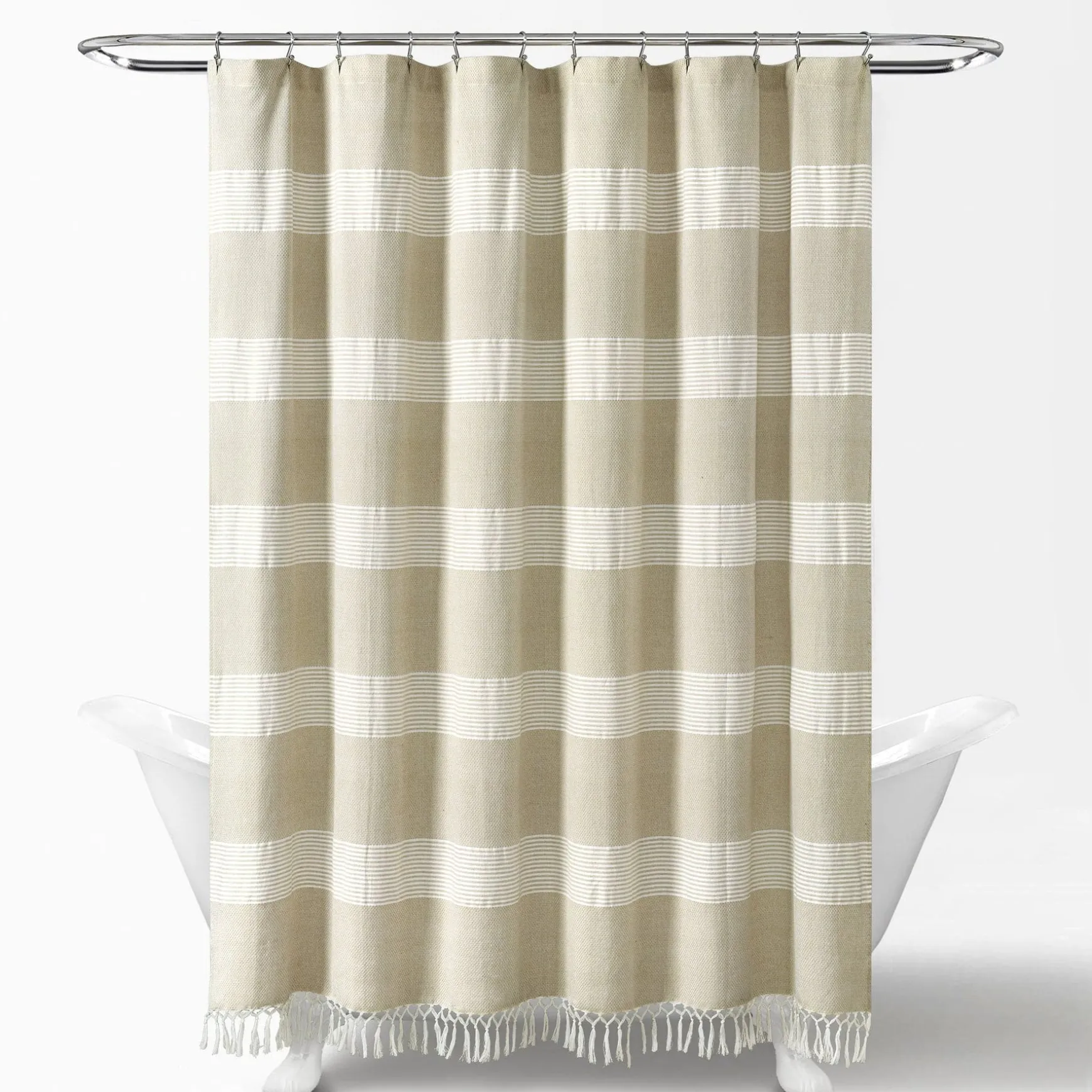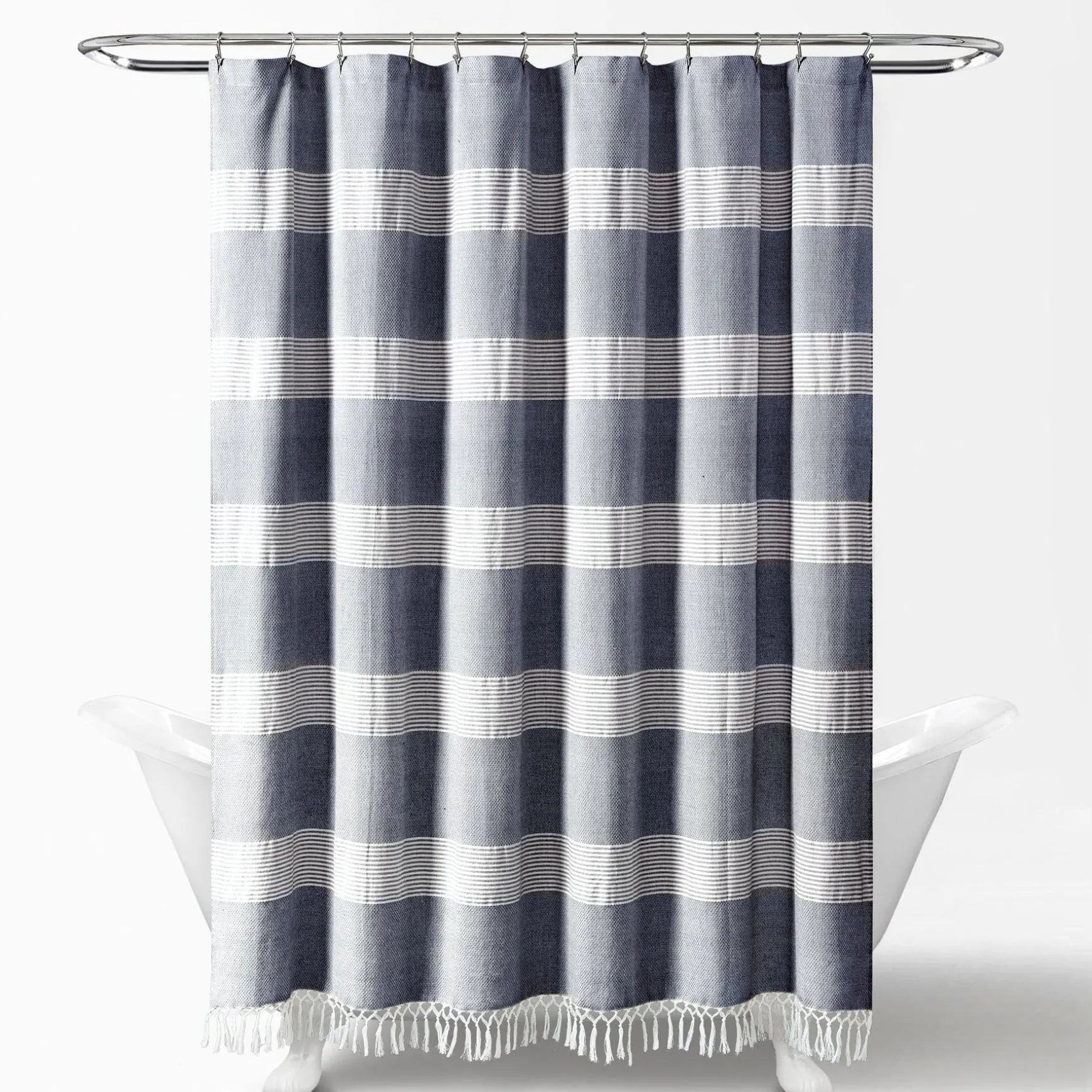Constructed of yarn dyed cotton, this look fits into many decor themes for your master or guest bath. Use our Tucker Stripe Yarn Dyed Knotted Tassel Shower Curtain as part of your modern, farmhouse, boho or coastal bathroom decor.