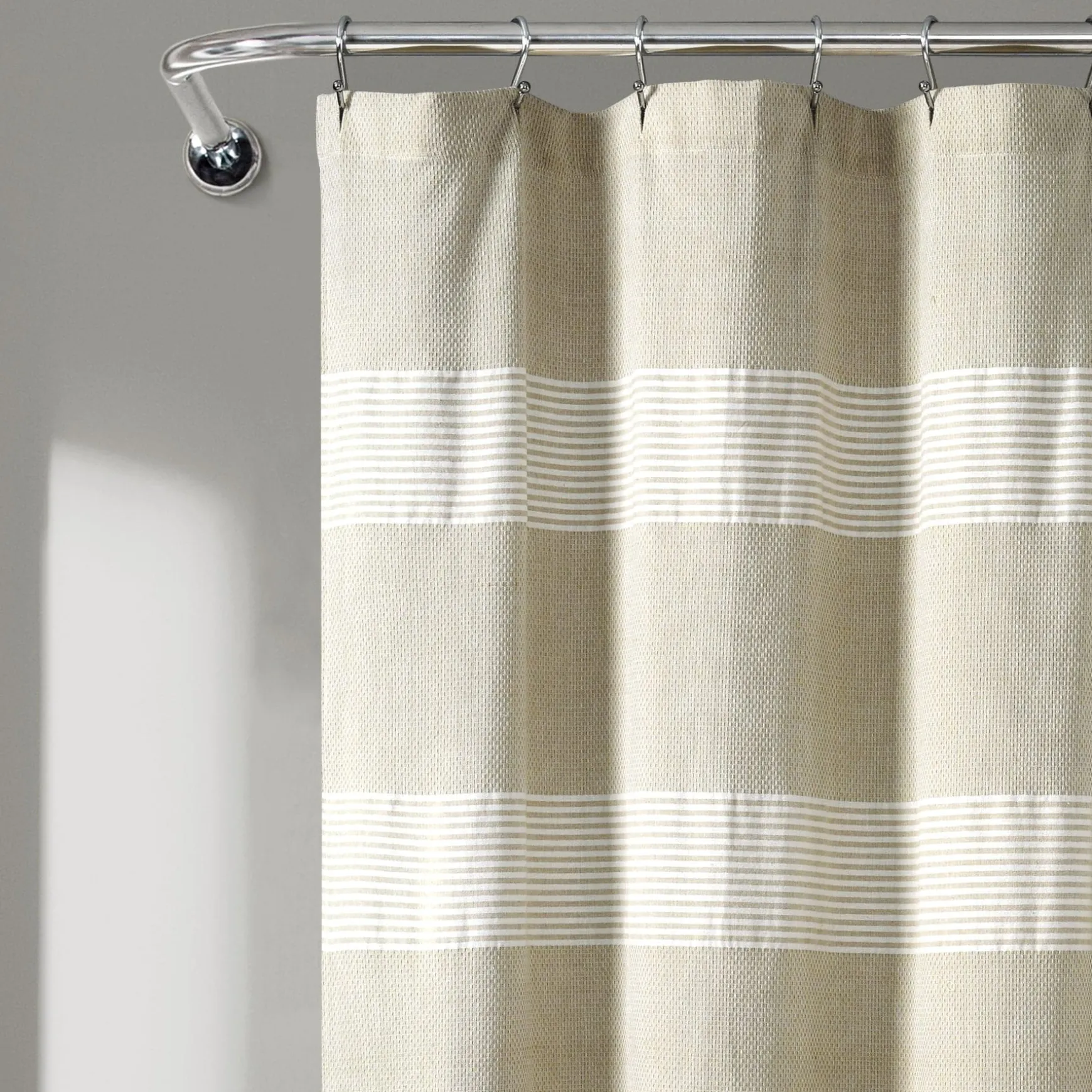 Our Tucker Stripe Yarn Dyed Knotted Tassel Shower Curtain adds the perfect touch of texture and style to your space without overwhelming the design. It will be easy to decorate around a shower curtain like this one with its neutral colors and neutral stripe pattern.