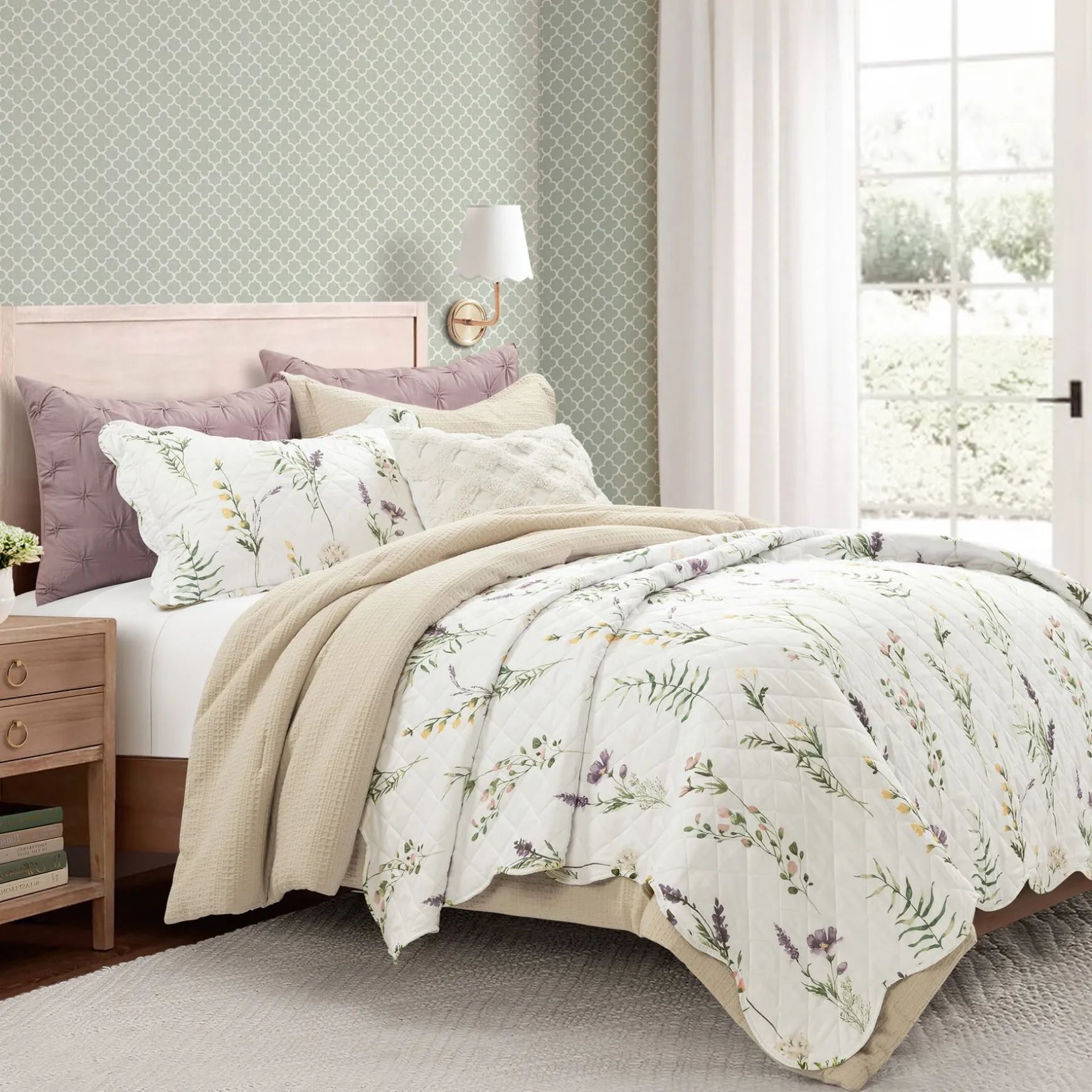 The soft floral pattern of this pretty and nostalgic Watercolor Wildflower Scallop Edge Floral 3 Piece Quilt Set is sure to make your bedroom feel extra homey. The back of this bedding set features a solid neutral color. The scalloped edge detail adds even more charm to your space.