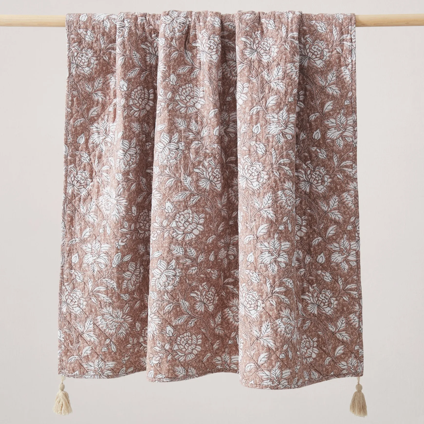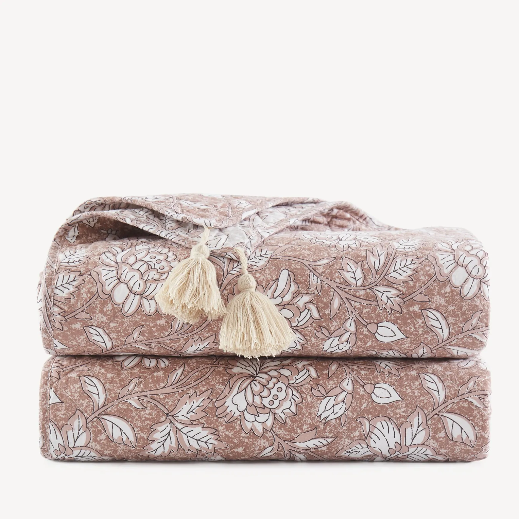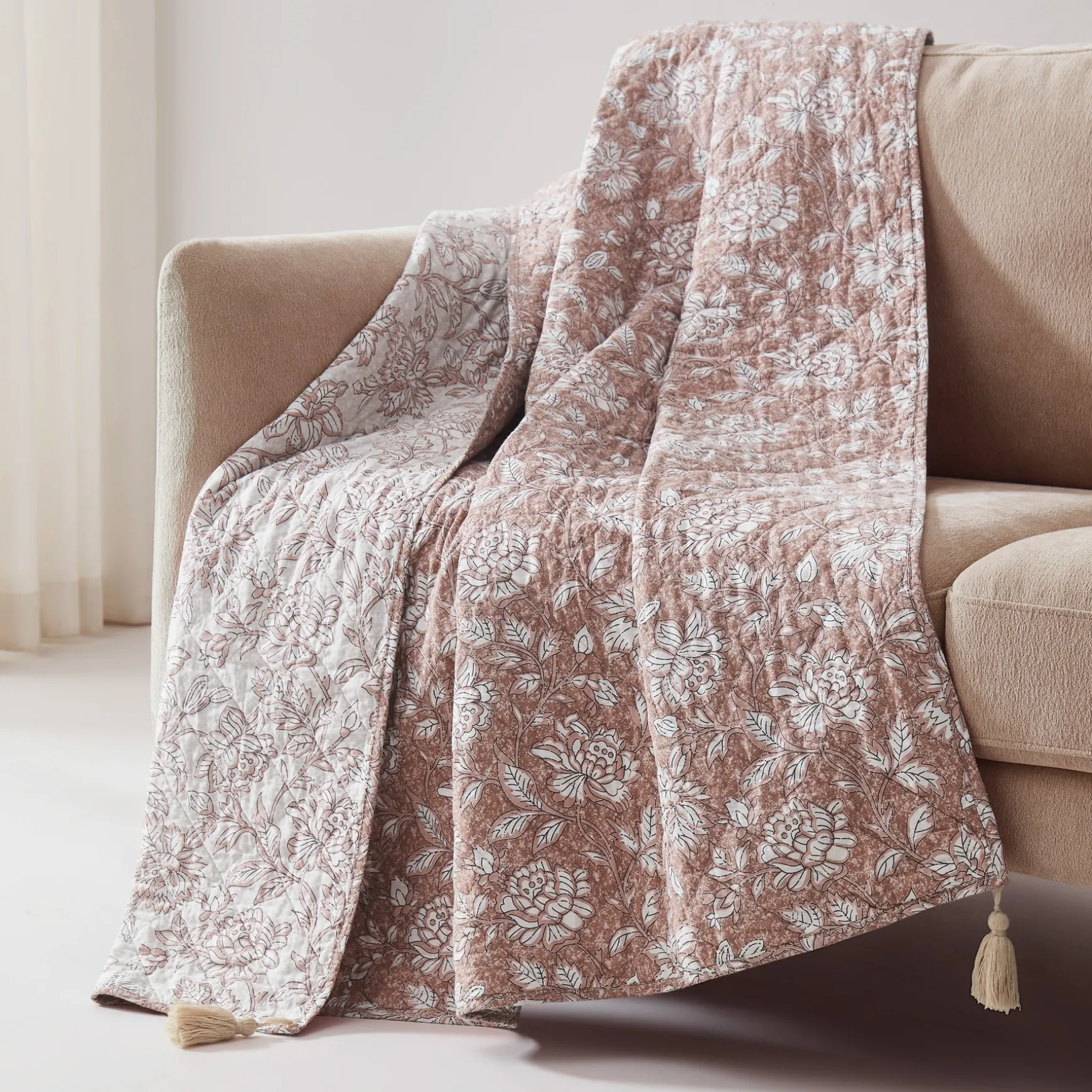 Add florals to your home with this floral throw blanket. Designed with a traditional flower block print, this reversible throw effortlessly blends boho and vintage styles. This blanket is a great layering piece for your bed, couch, or chair. It’s the perfect size for two adults to snuggle in together. Crafted from 100% prewashed cotton with a cotton filling for a soft and cozy feel. This throw blanket measures 50 inches wide by 60 inches long + 3.5″ tassels at each corner. Machine washable for easy care.